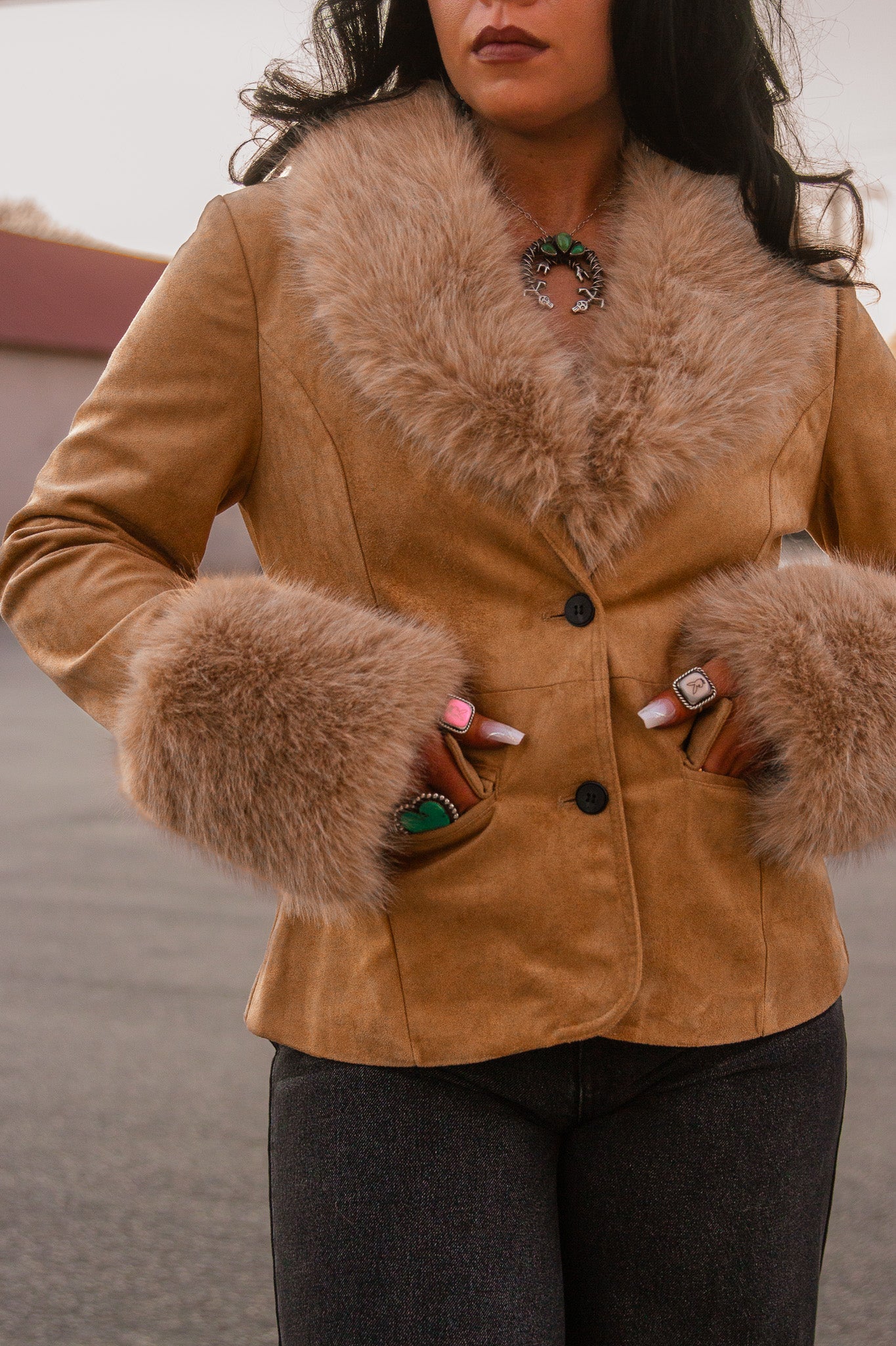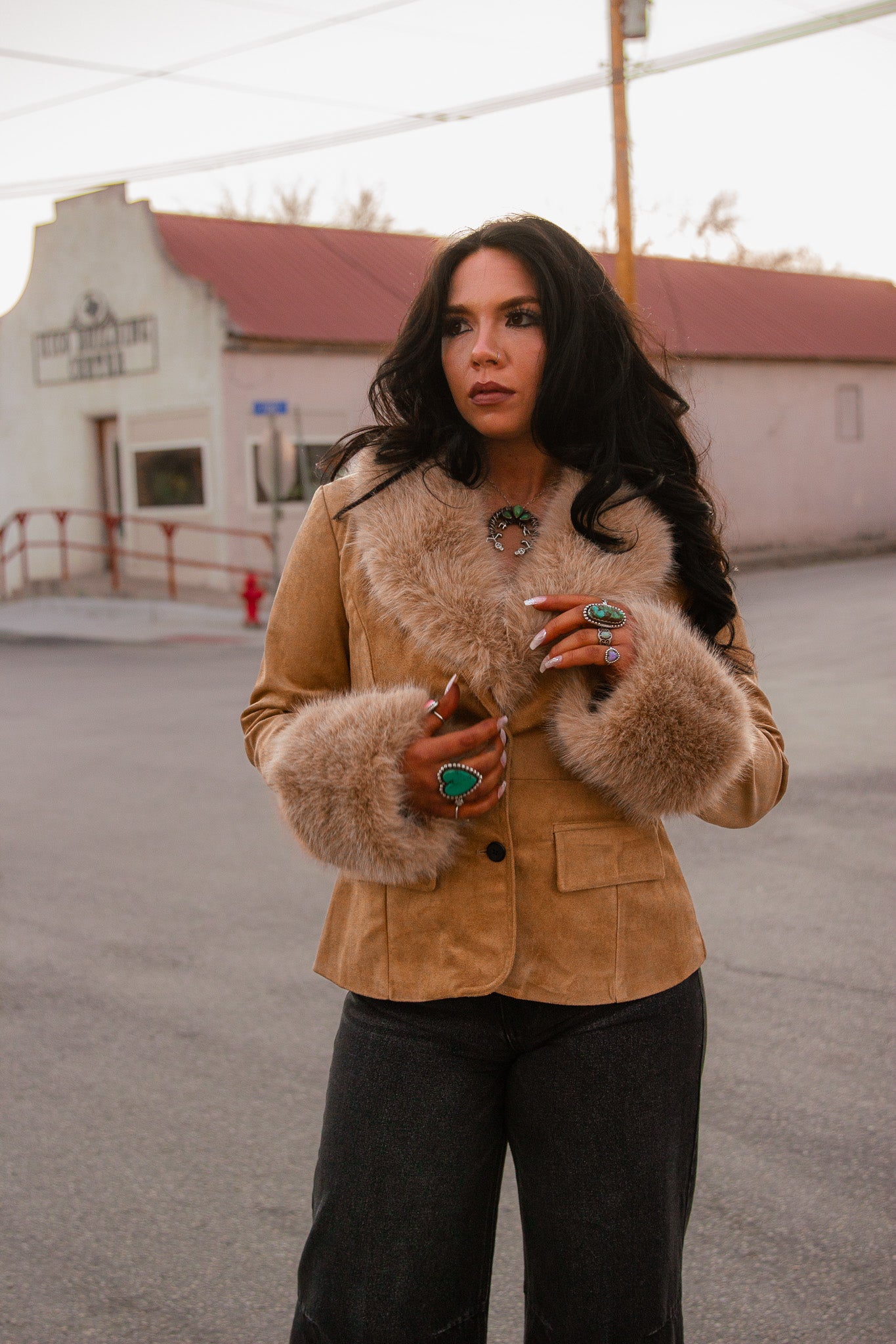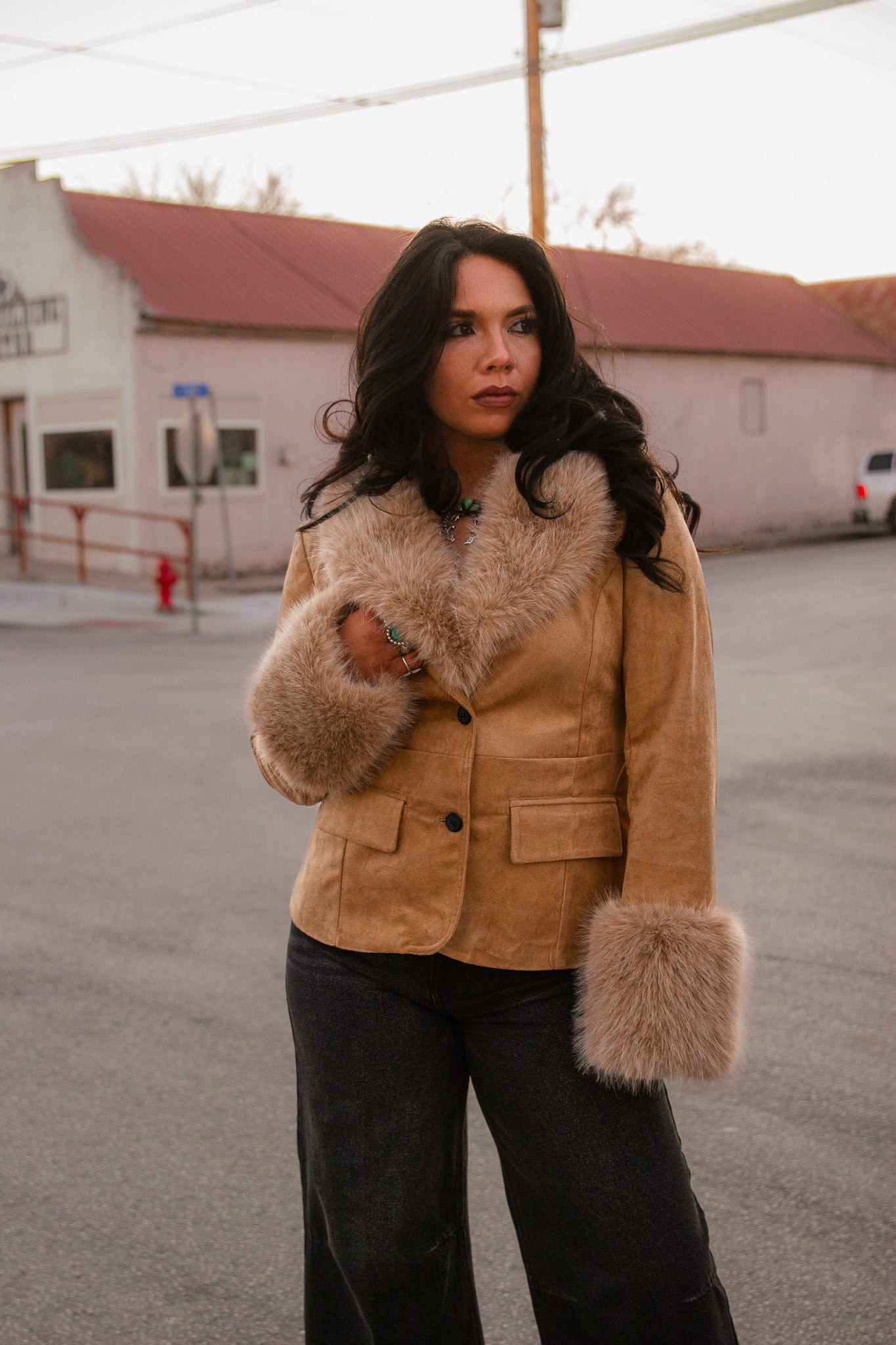 Introducing the Driftwood Manor Blazer, a versatile piece that will add a touch of luxury to any outfit. Made of khaki suede with a faux fur collar and cuffs, both of which are removable for customizable styling. Don't forget the one button closure for a clean and effortless look.