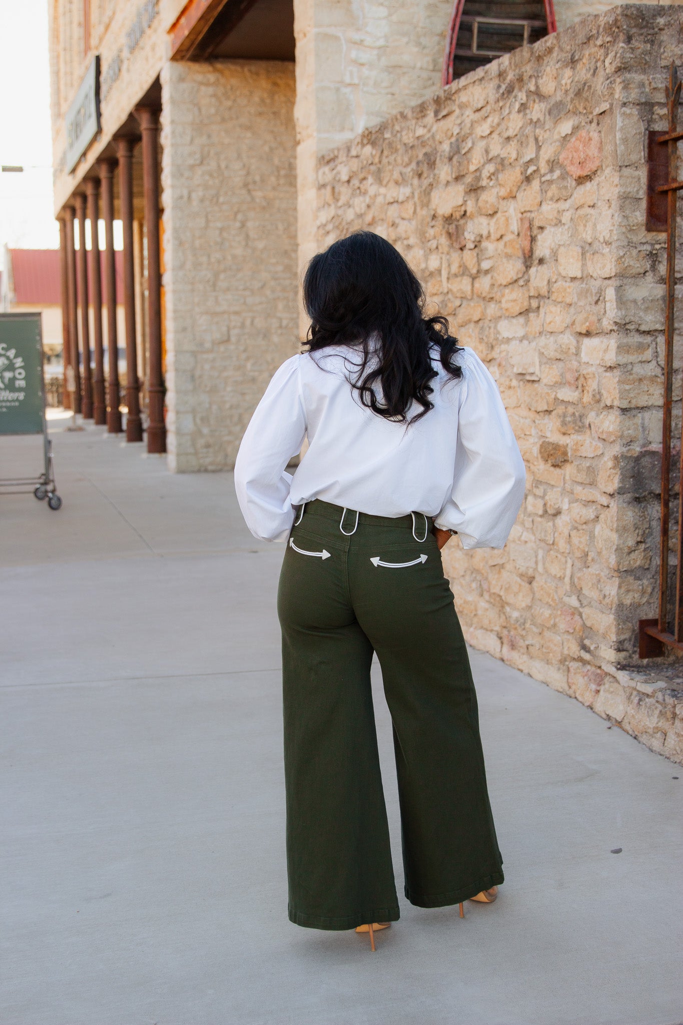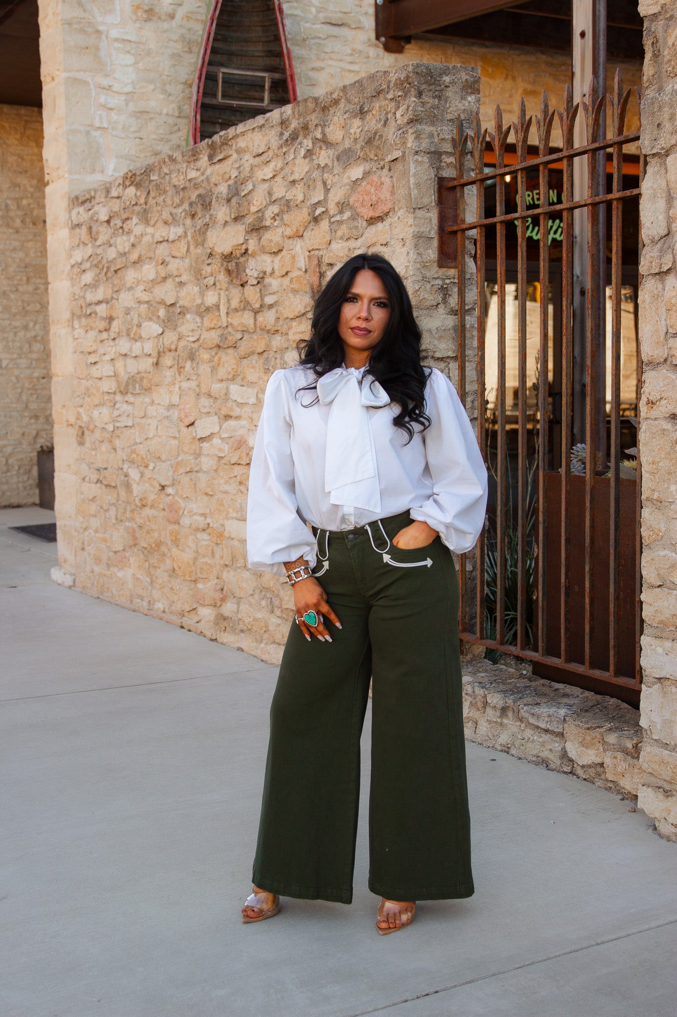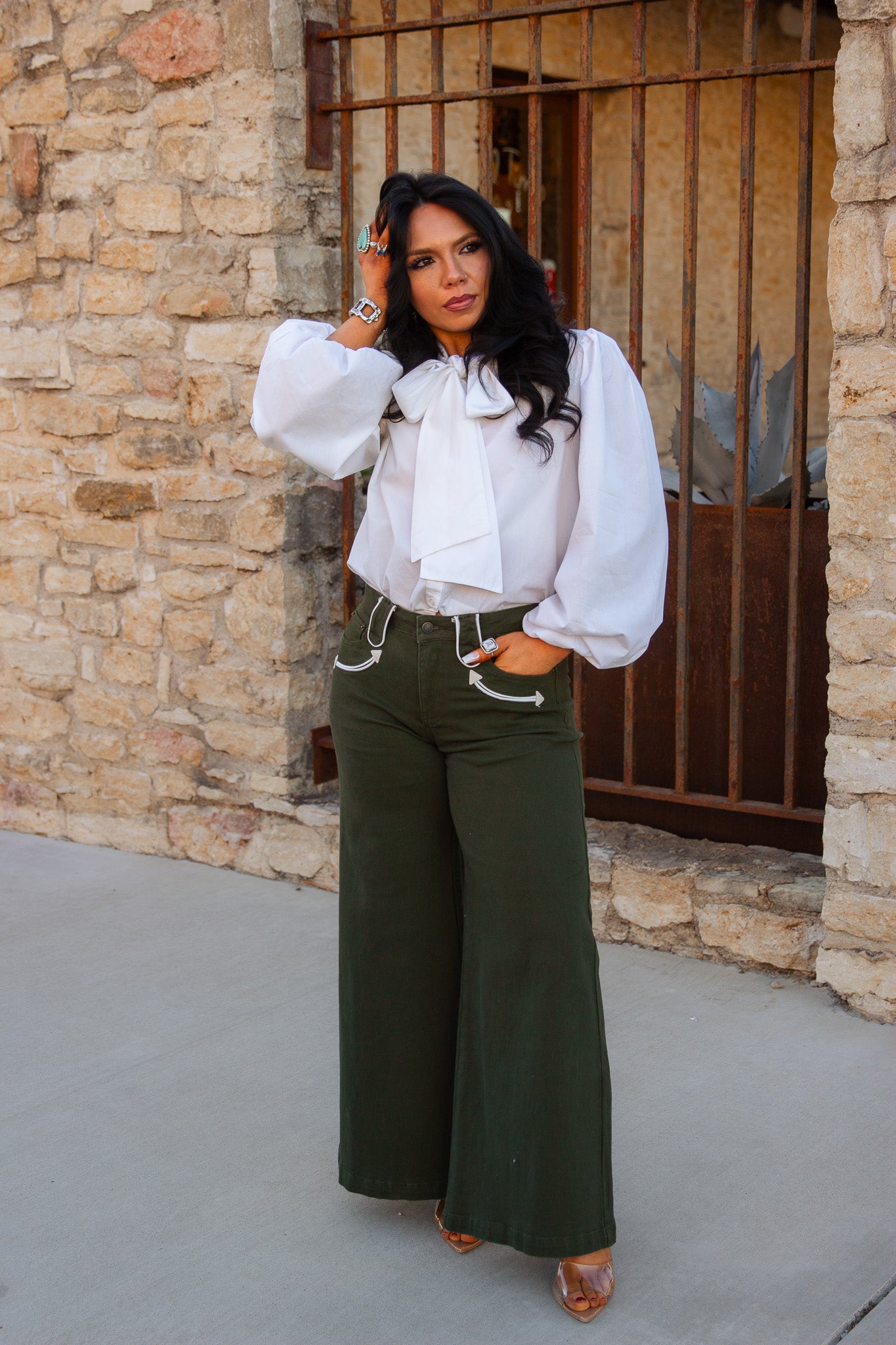 The Emerald Ridge Jeans feature a stylish olive color. Their wide leg design and arrow detailing make them a chic addition to any wardrobe. Experience unbeatable comfort and style with these versatile jeans.