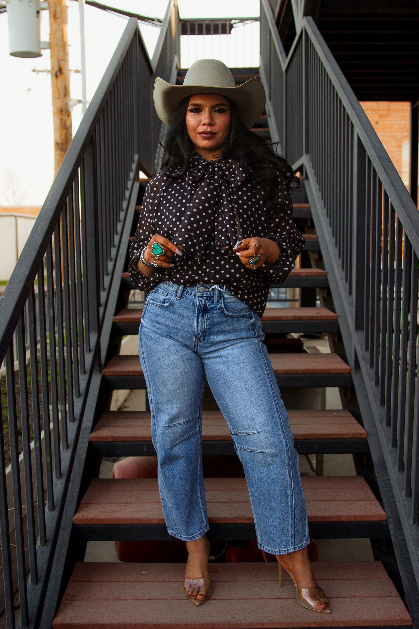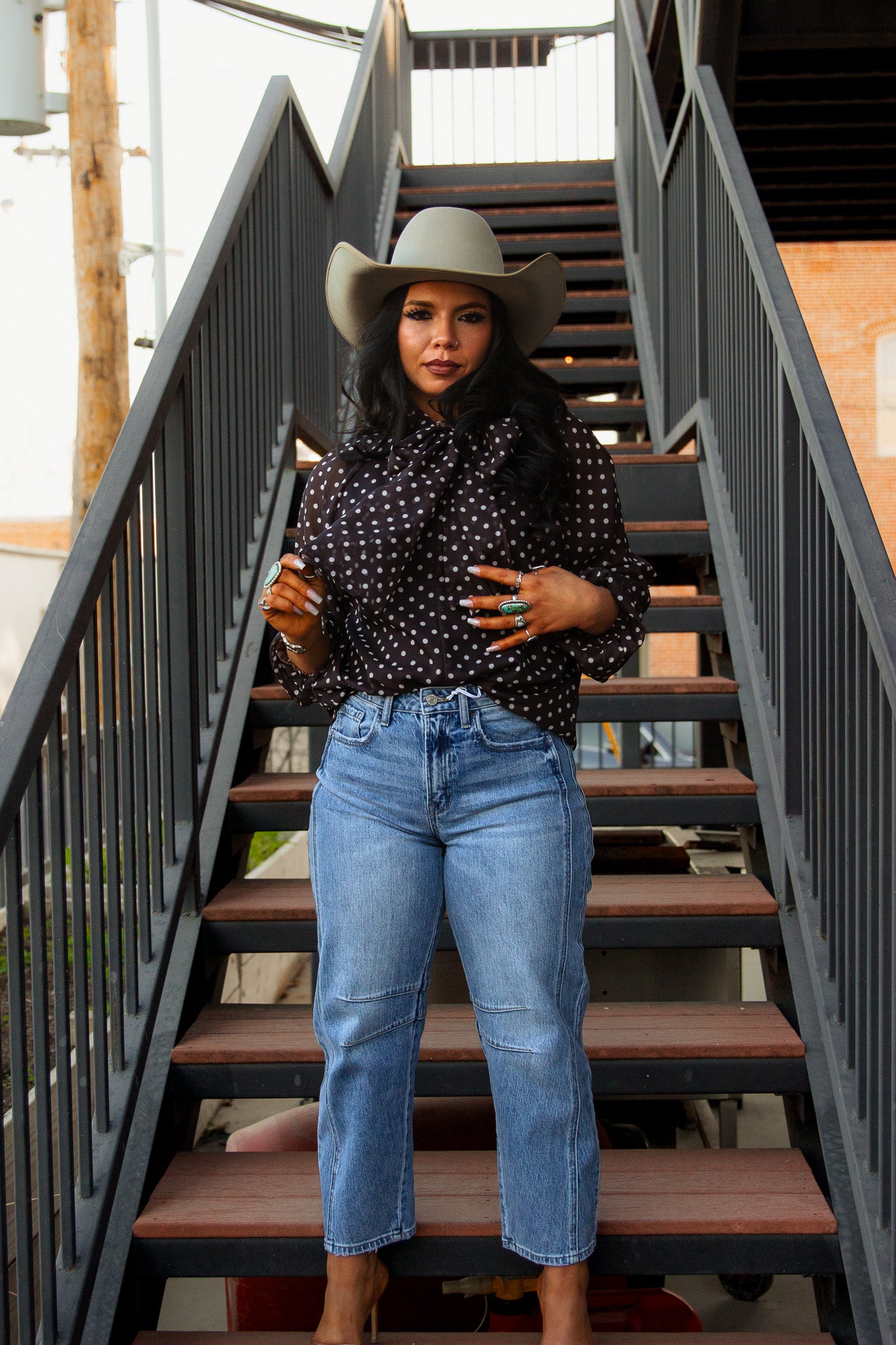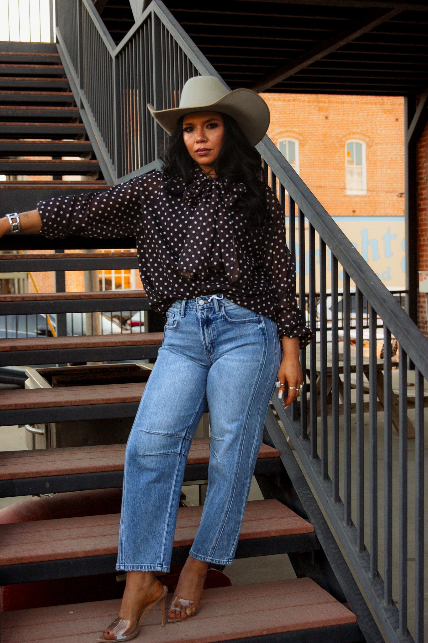 Get ready to turn heads in The Farrah Blouse! This brown, long sleeve button up not only features chic white polka dots, but also a playful tie neck for added flair. Perfect for any occasion, this top will have you feeling classy and confident!