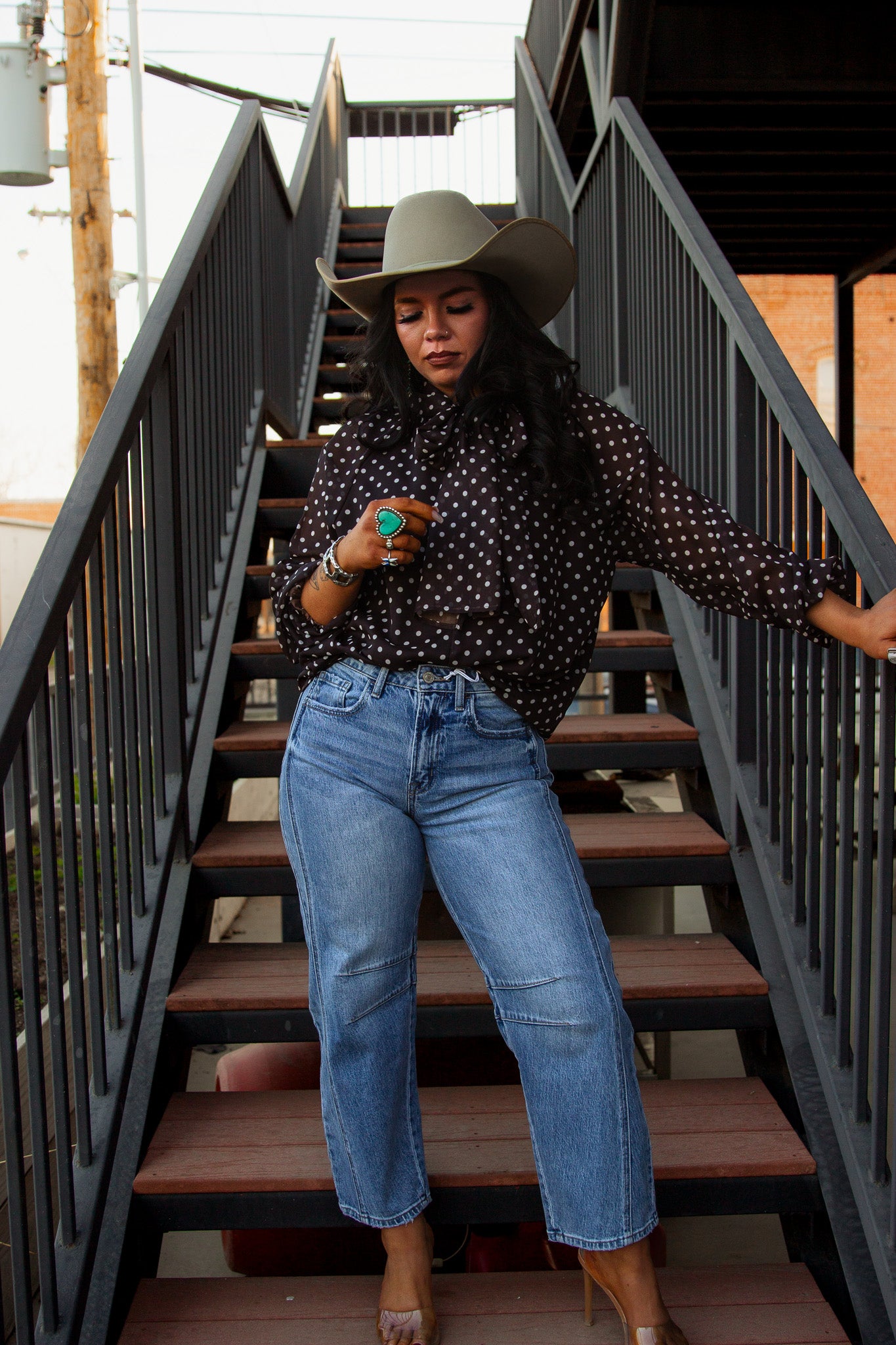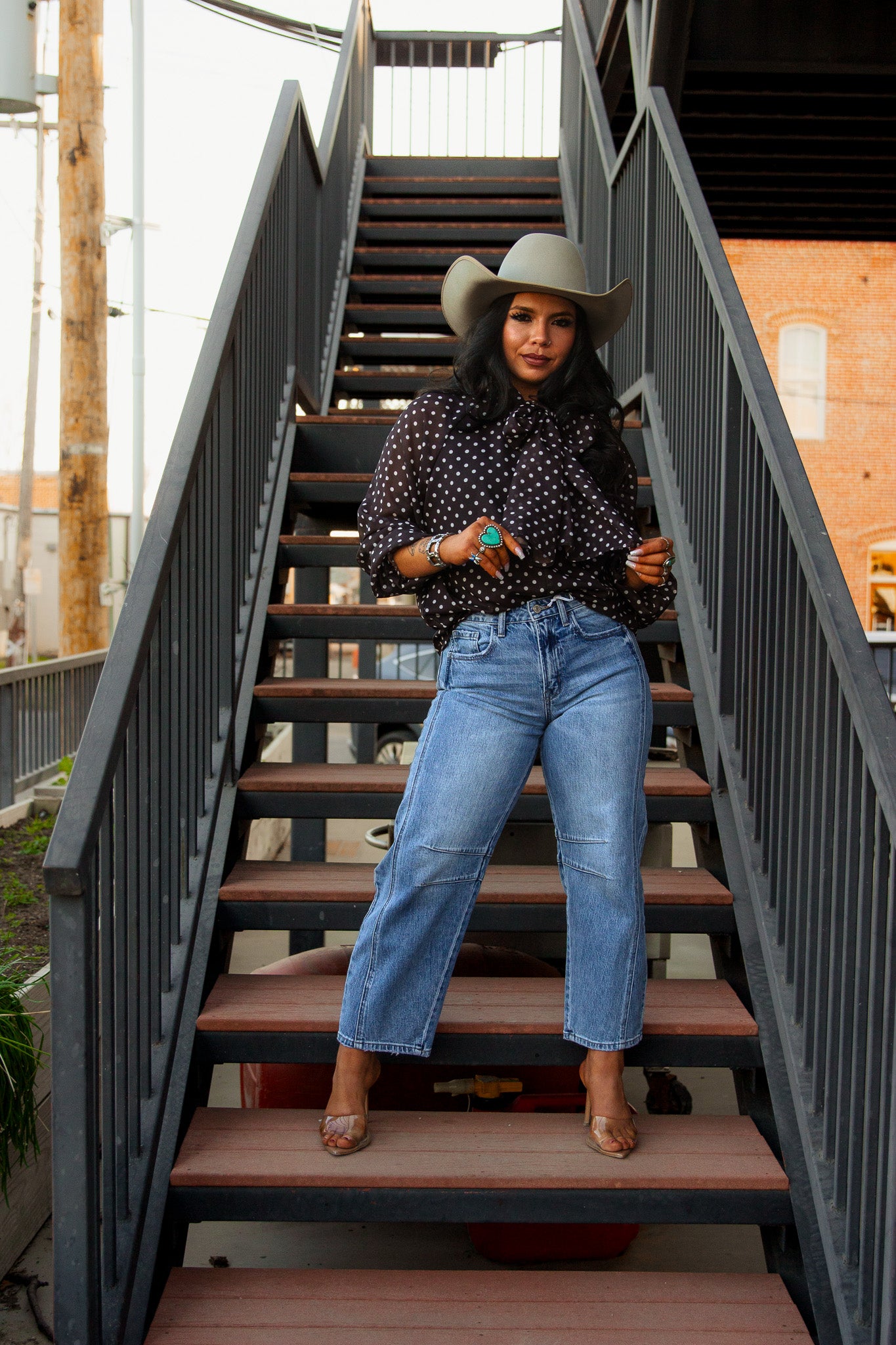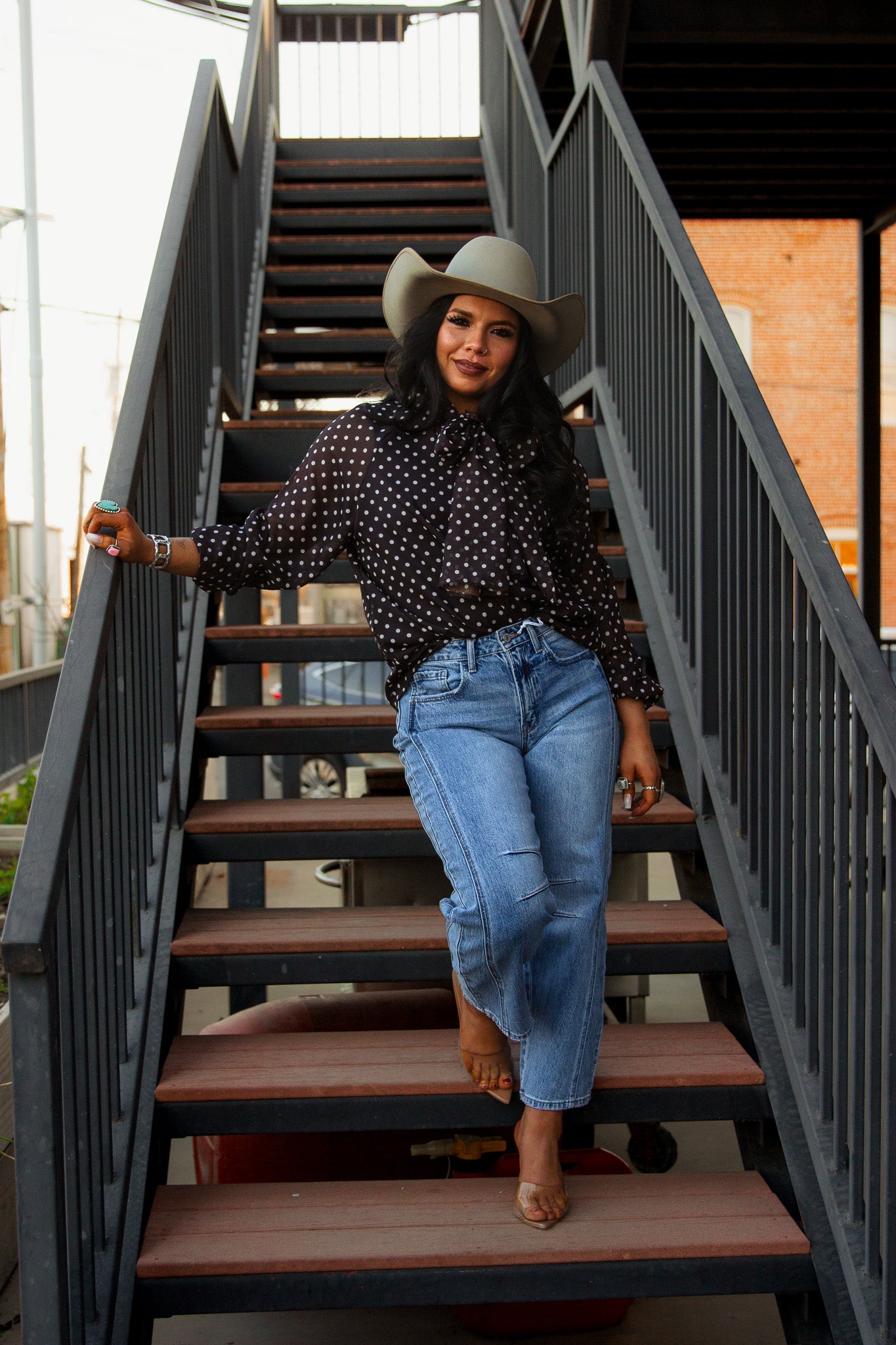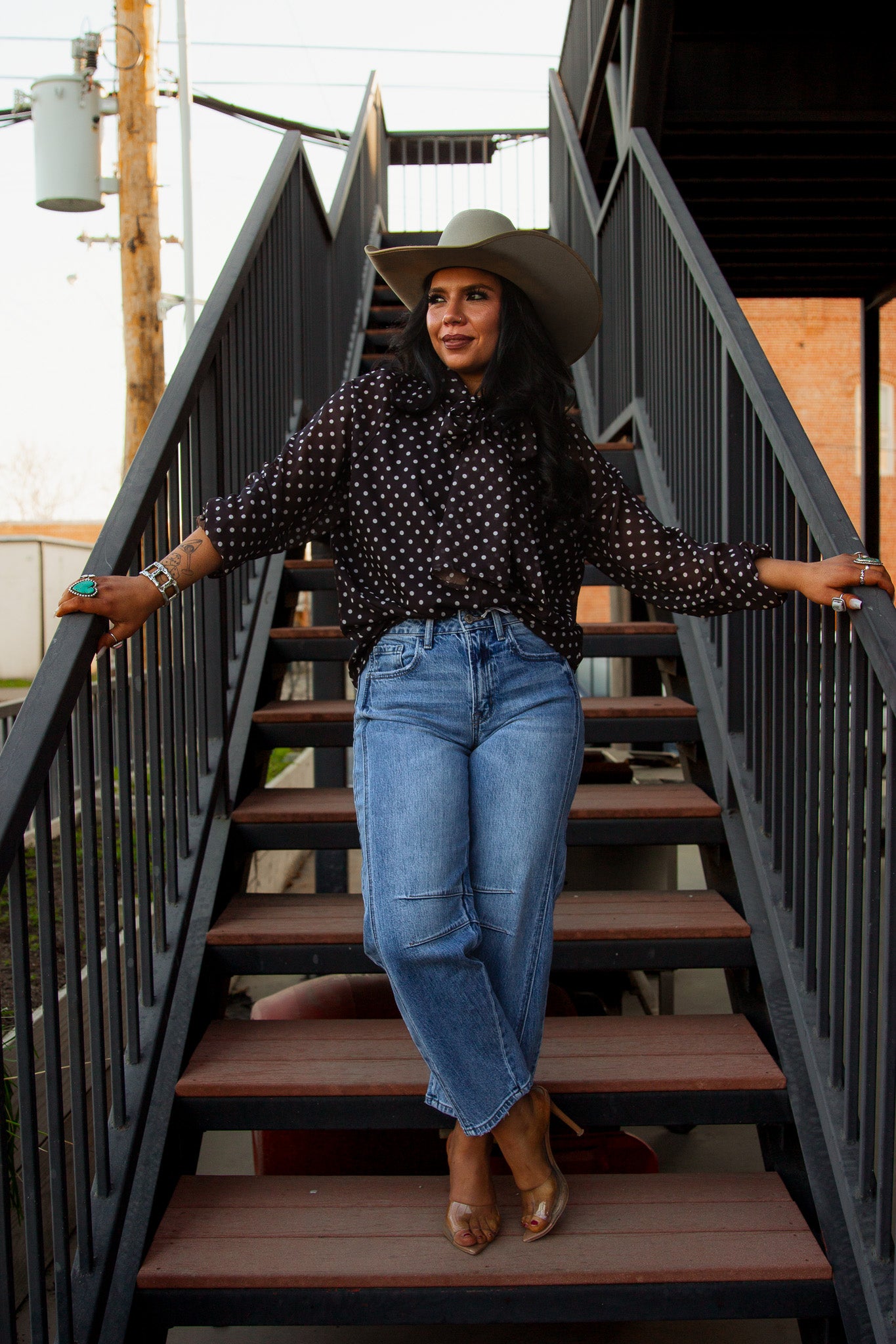 Get ready to turn heads in The Farrah Blouse! This brown, long sleeve button up not only features chic white polka dots, but also a playful tie neck for added flair. Perfect for any occasion, this top will have you feeling classy and confident!