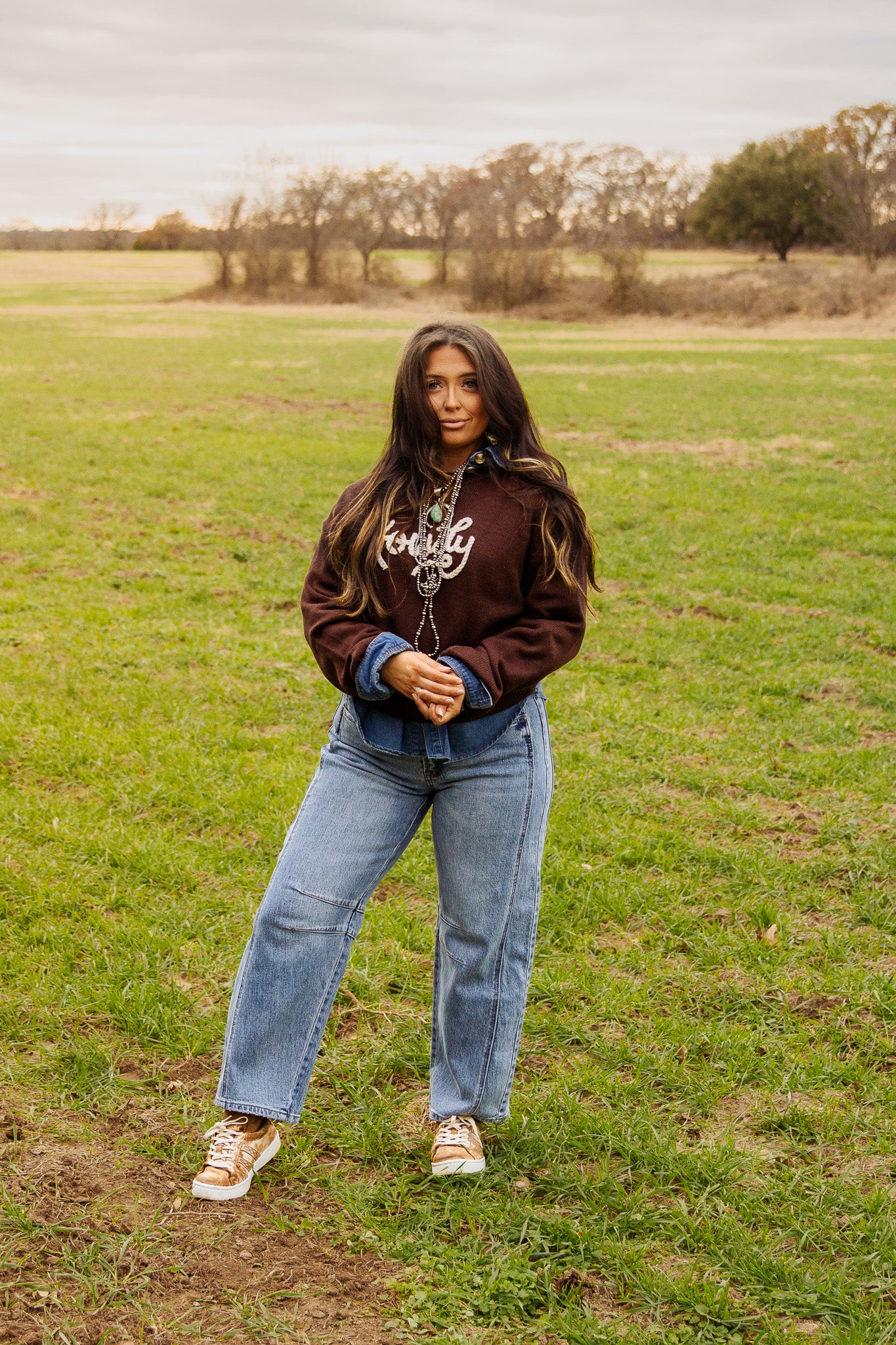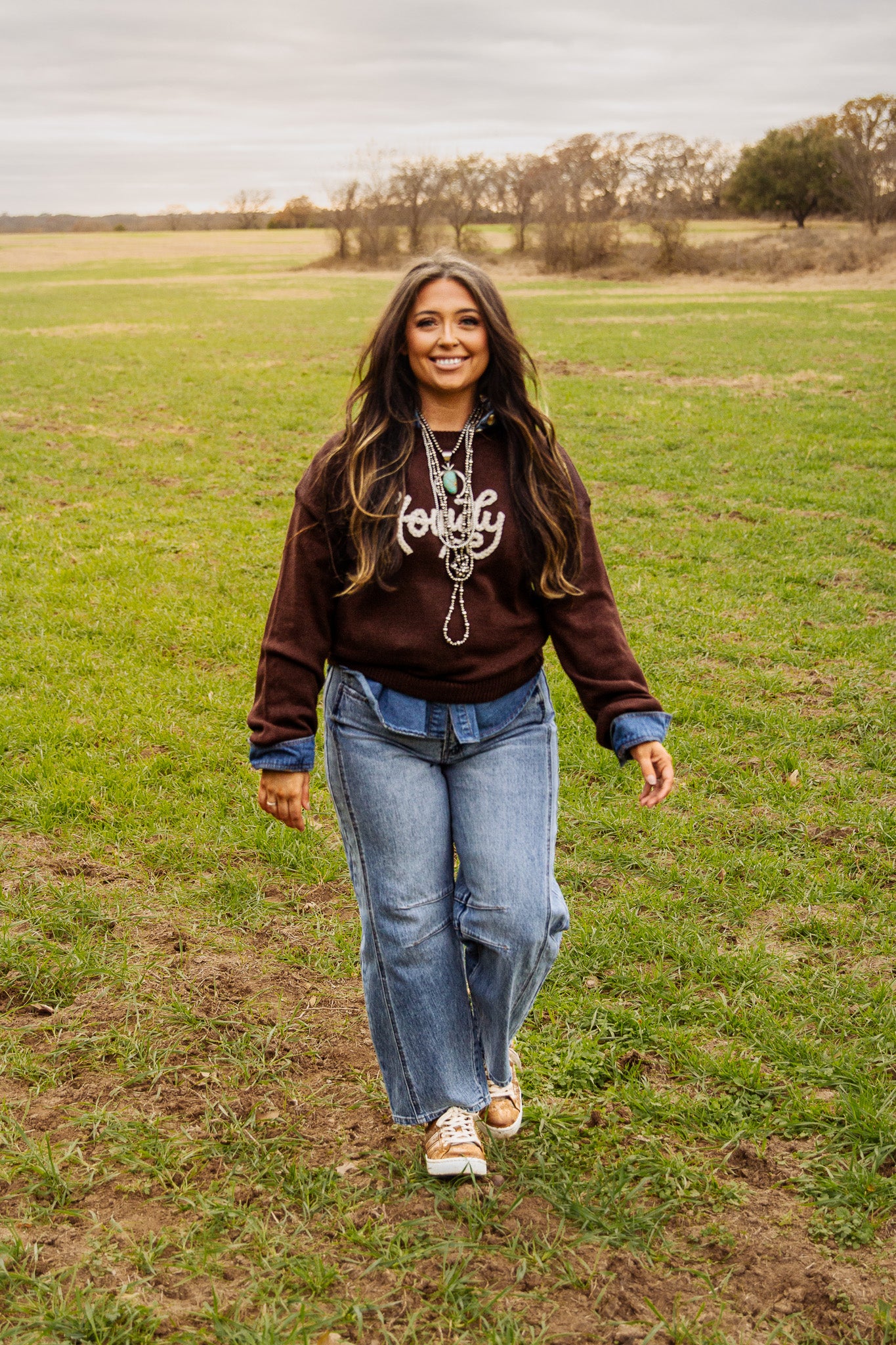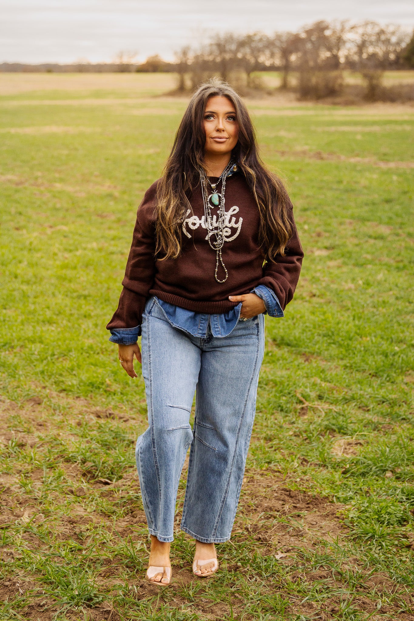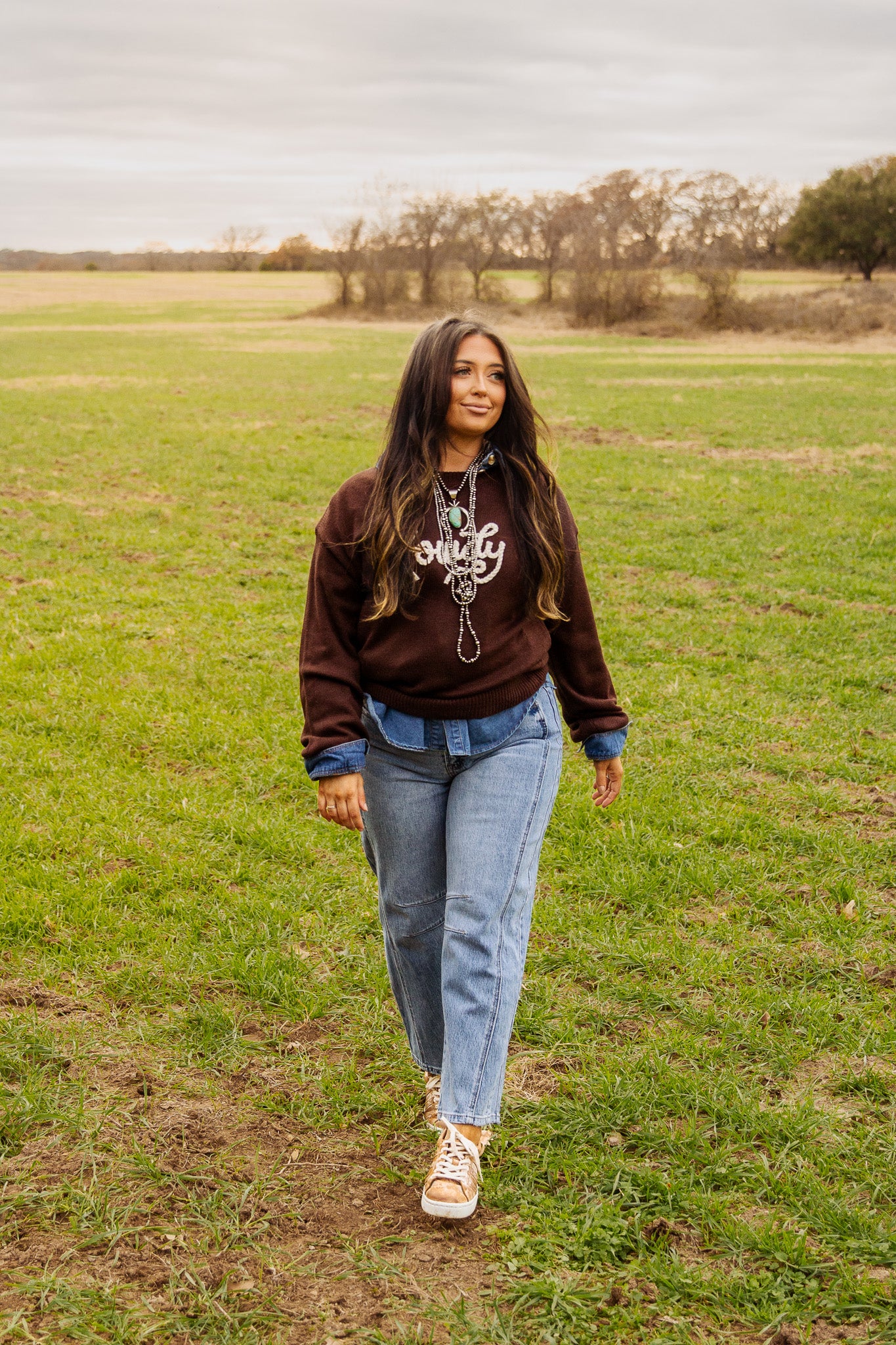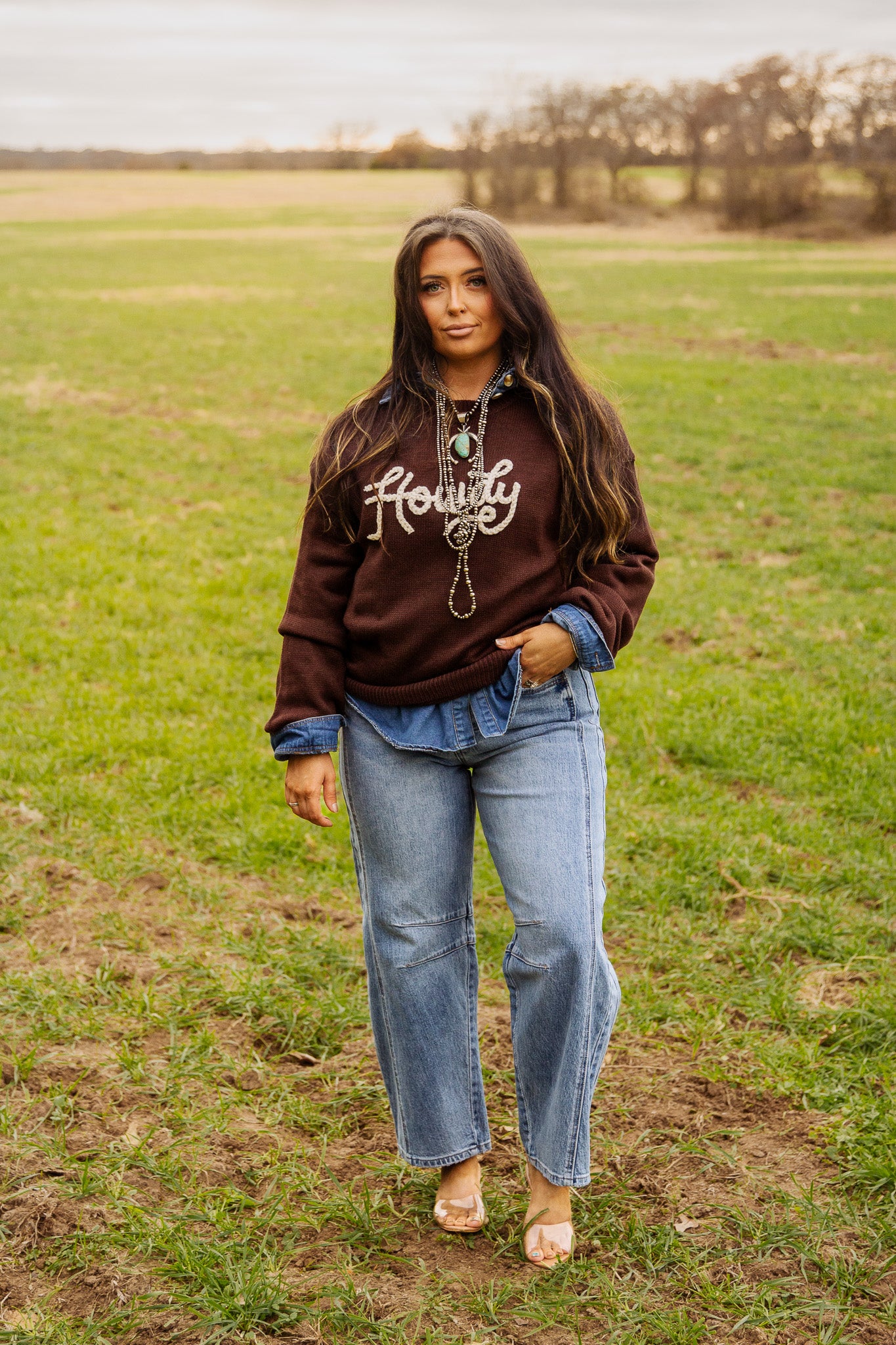 A soft nod to western tradition with a refined finish. This rich chocolate-brown knit features elegant ivory HOWDY crochet knit across the front, giving it a handwritten, heirloom feel. Designed with a cozy medium-weight knit and relaxed silhouette, it’s an effortless staple for cool mornings, ranch days, and city cowgirl styling alike. Pairs perfectly with denim, boots, or layered under a tailored coat for an elevated western look.