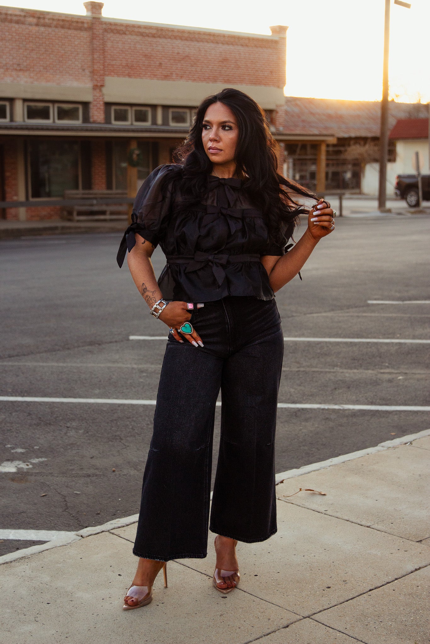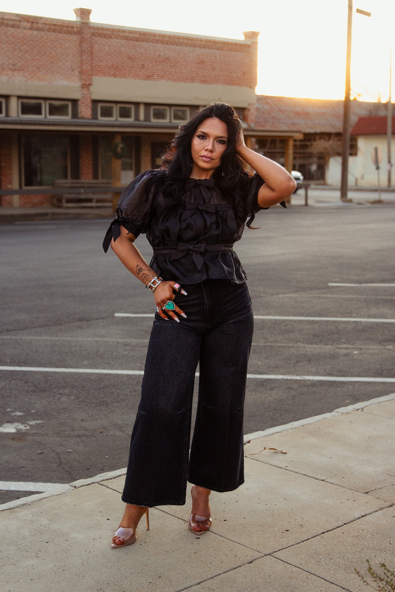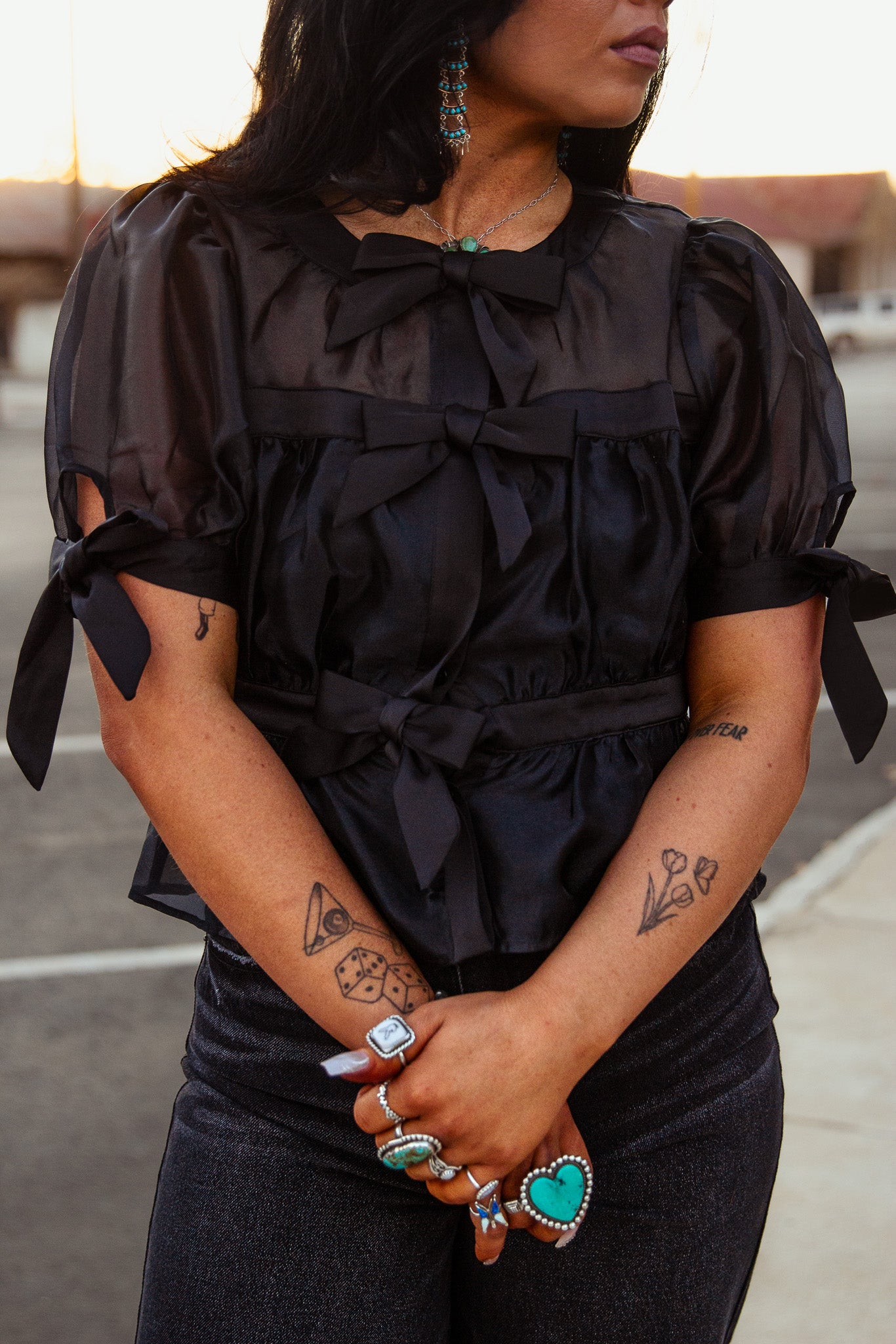 Introducing the Onyx Bow Peplum Top - a stunning addition to your wardrobe. This black top features sheer fabric and delicate bow details for a touch of elegance. Perfect for any occasion, it's a must-have for those who love chic and feminine style.