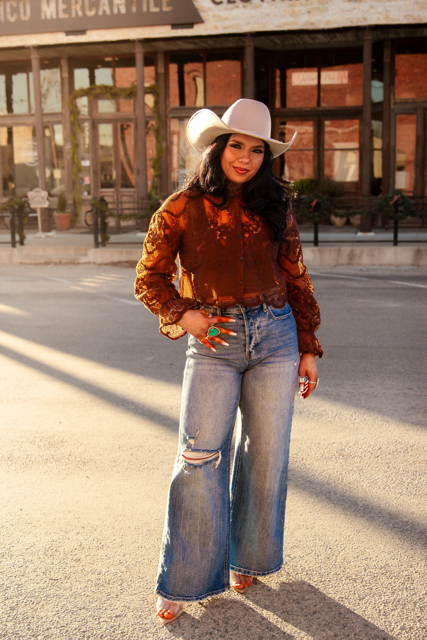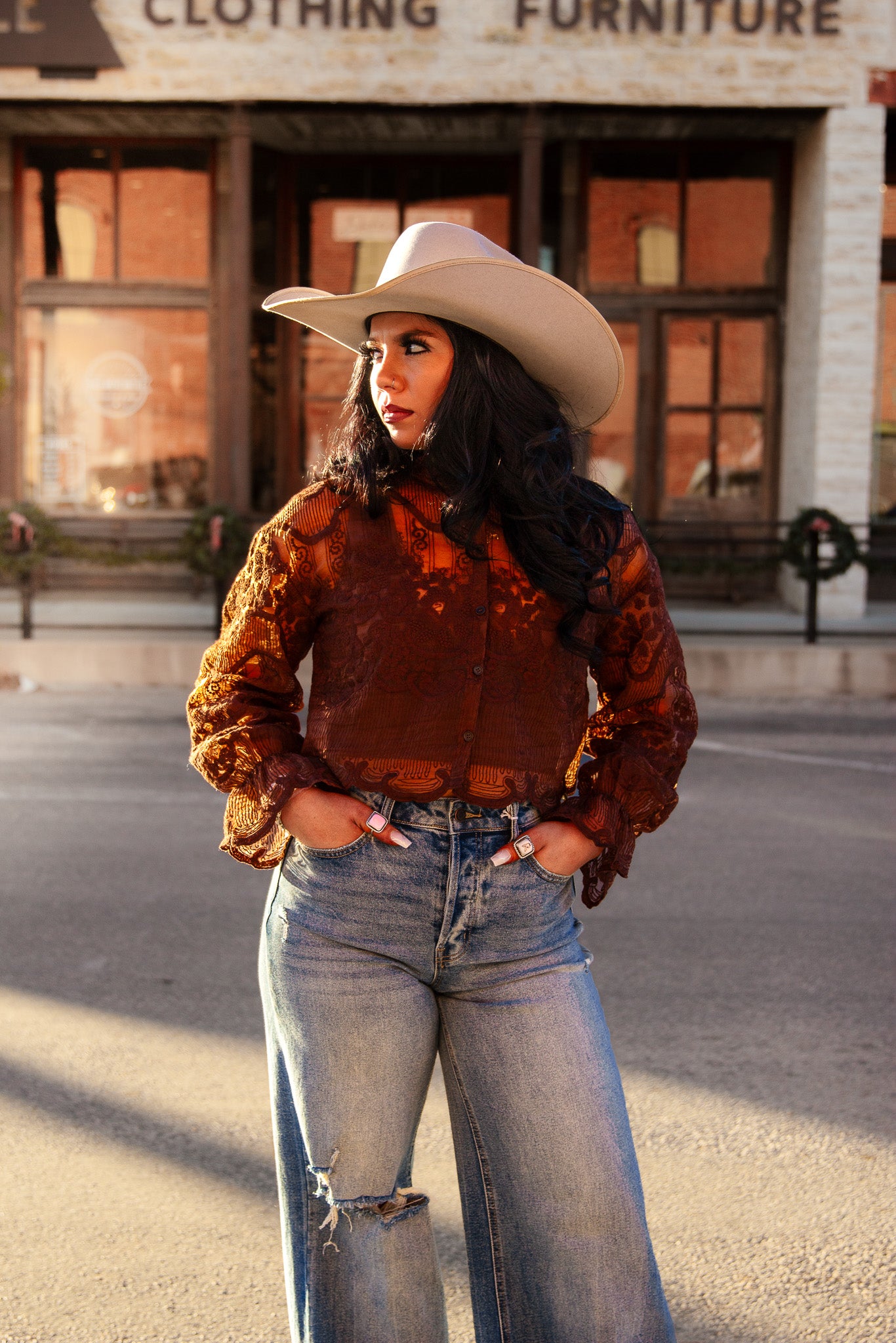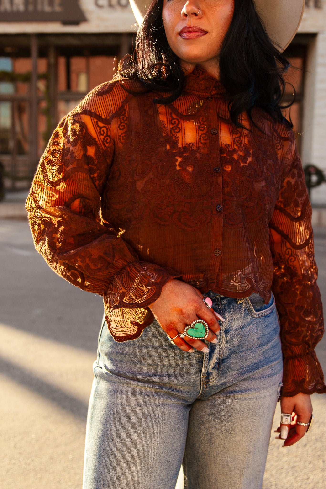 Unleash your inner chic with The Ranch Moon Romance Top. This mocha brown button down blouse features exquisite crochet embroidery, perfect for adding a touch of elegance to any look. Get ready to turn heads and rock a romantic vibe.
