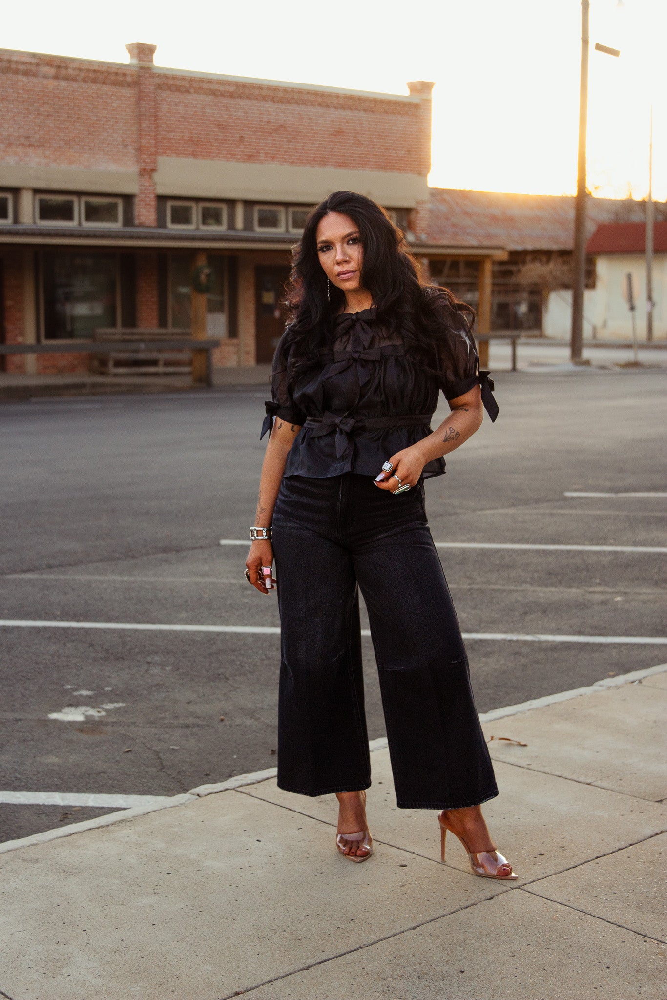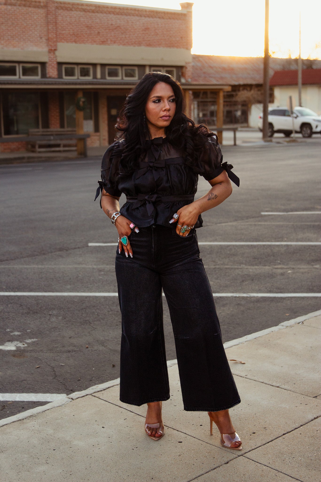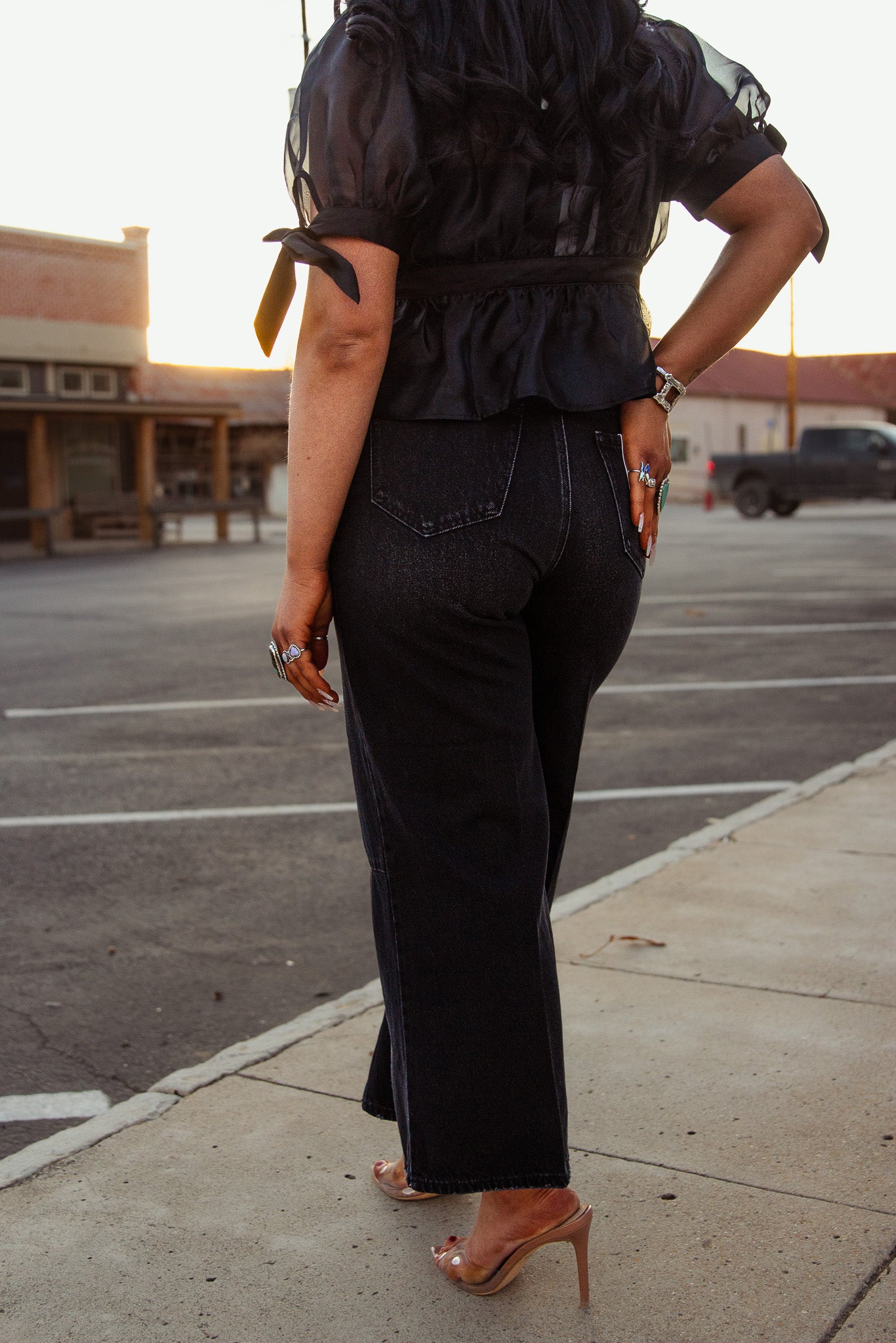 Introducing The Shadow Creek Jeans. These high-rise, wide leg jeans in classic black are the perfect addition to any wardrobe. The cropped length adds a touch of modern style, while the high rise provides a flattering fit. Elevate your denim game with these versatile and on-trend jeans.
