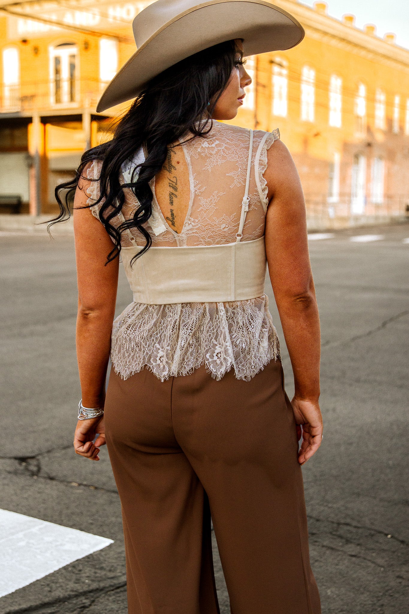Introducing the versatile and stylish Cowboy Charmer Top. Crafted with exquisite lace and designed in a flattering corset style - this top is perfect for any occasion. Elevate your wardrobe with this must-have piece that effortlessly combines elegance and charm.