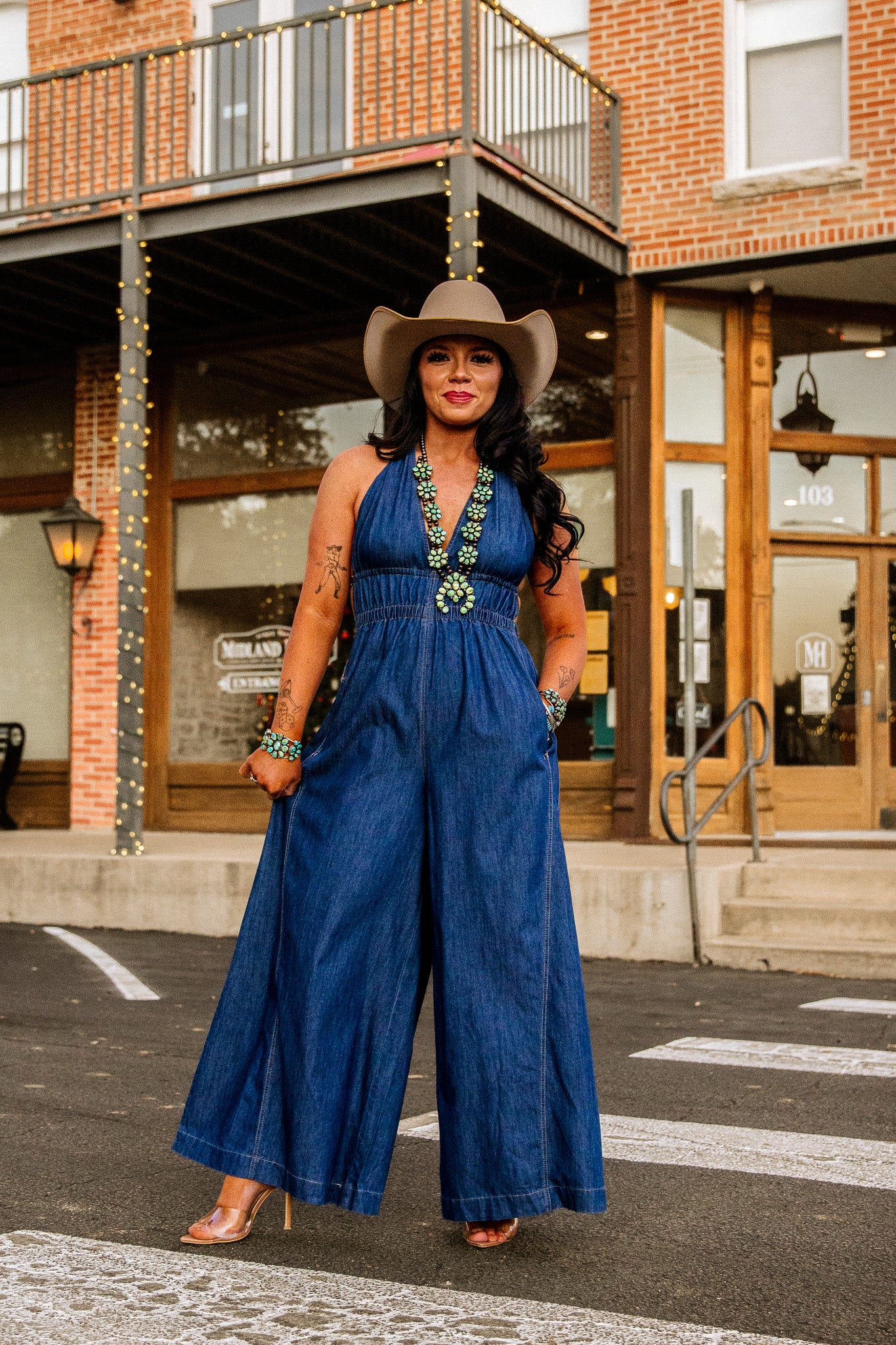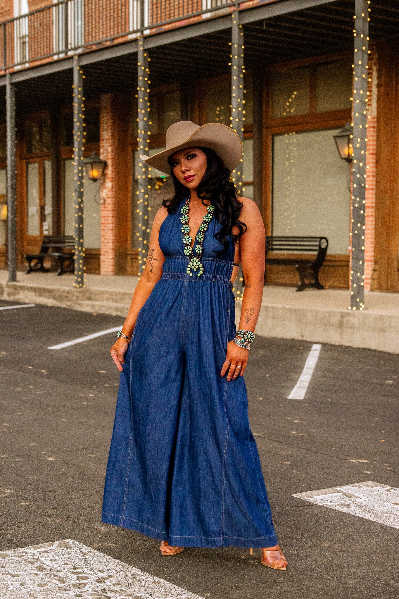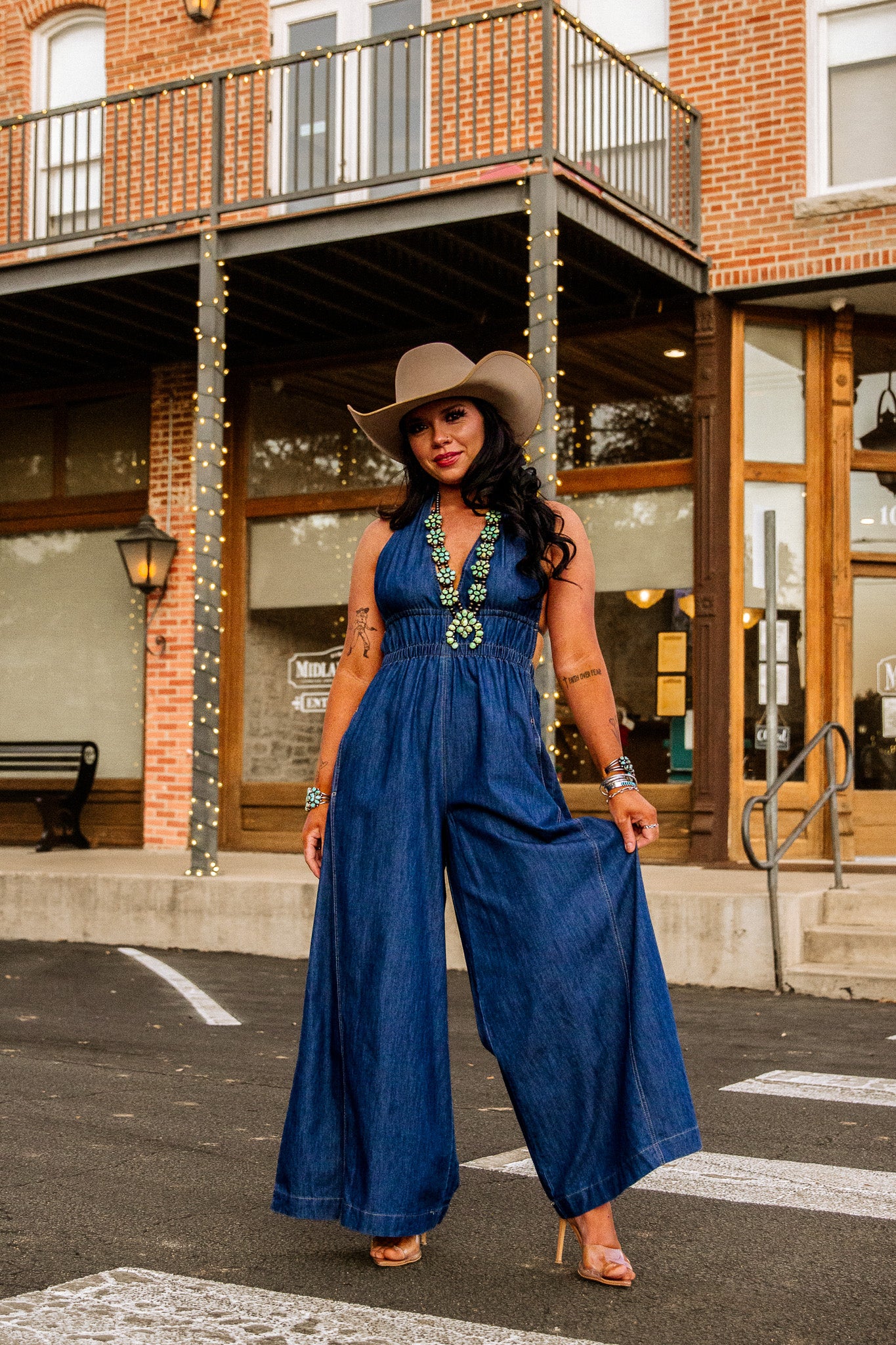 Rock the denim revival with this halter neck jumpsuit! Made from dark denim, this jumpsuit features a playful tie back for a fun twist on a classic look. Perfect for a daytime outing or a night out on the town. Don't miss out on being effortlessly chic!
