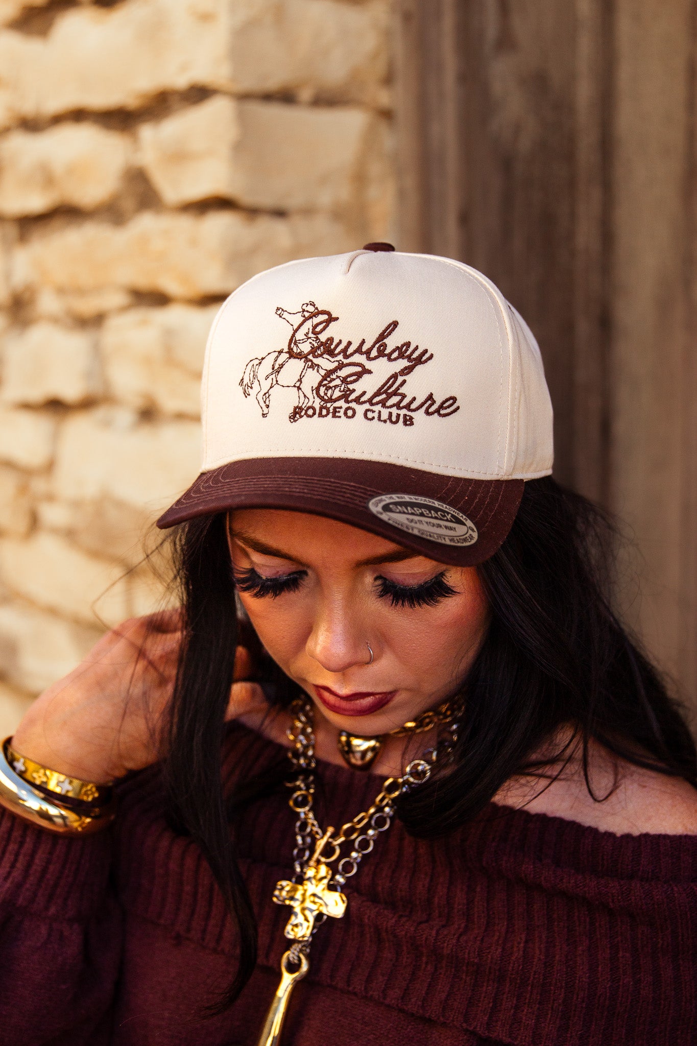 "The Cowboy Culture Trucker Hat showcases the iconic lifestyle of the rodeo club with a bold two-toned design. Embrace your inner cowboy and stand out in style with this must-have accessory."