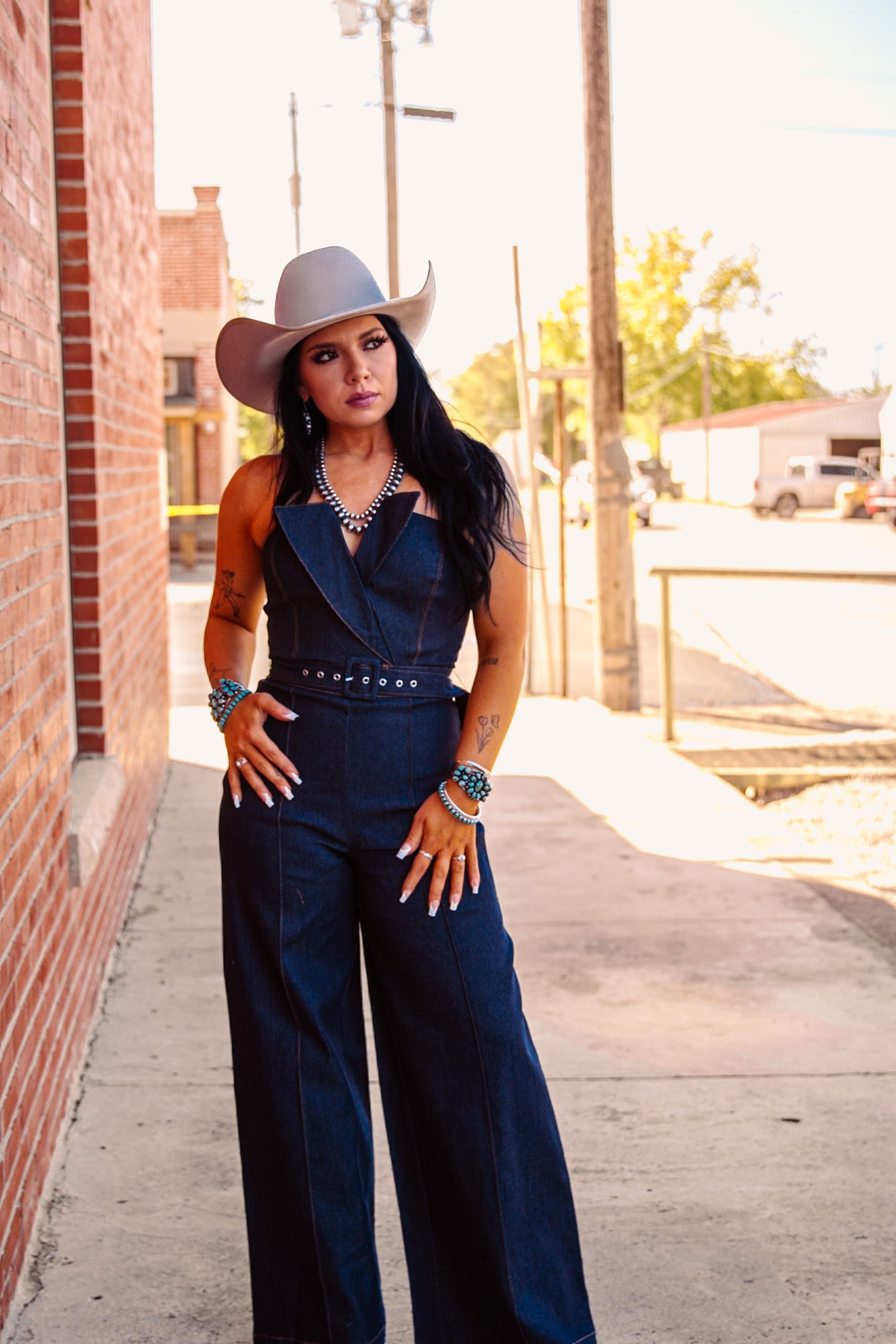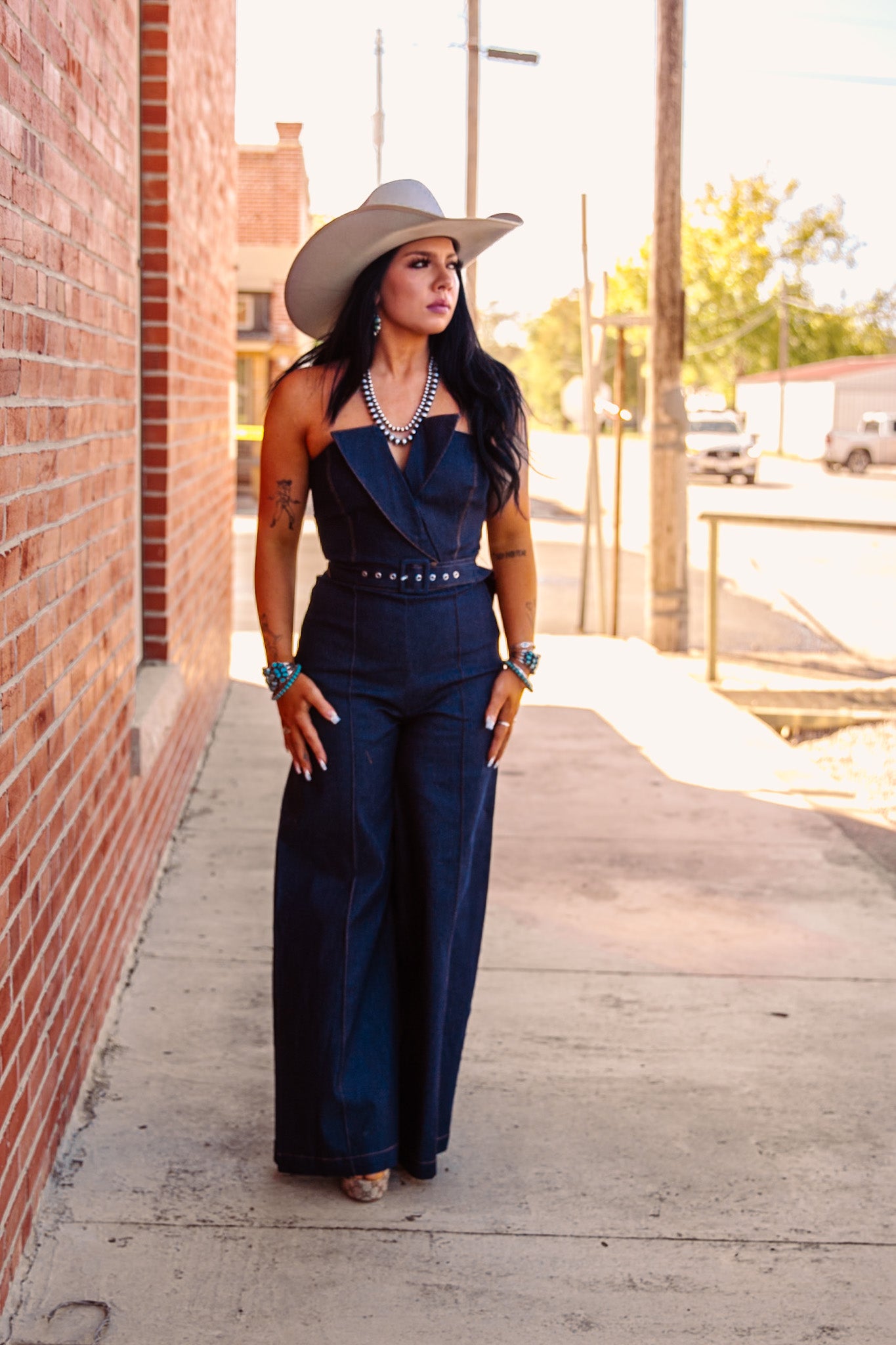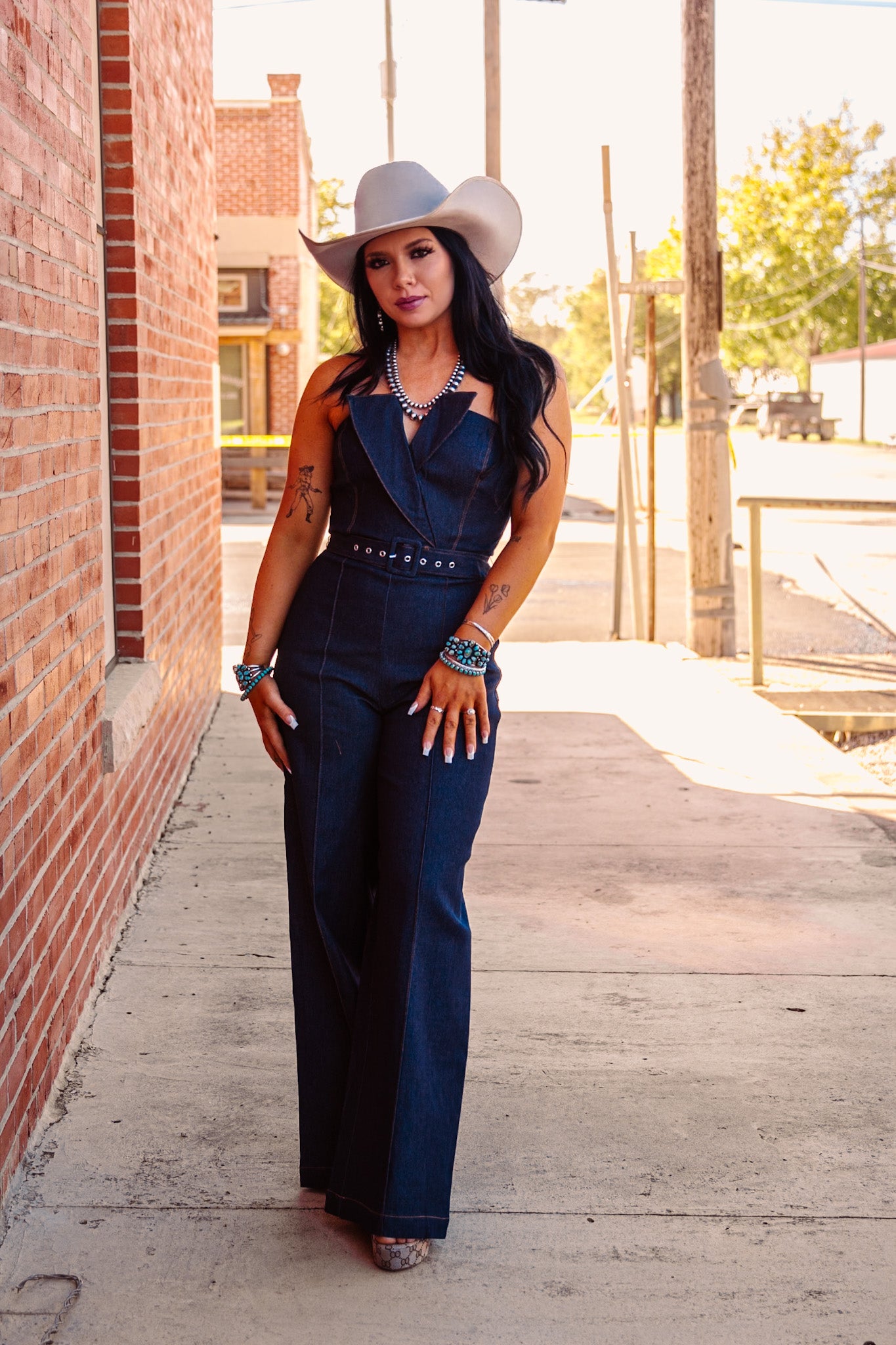 Introducing the Denim Duchess Jumpsuit - the perfect addition to your wardrobe! Made from high-quality dark denim, this strapless jumpsuit features a flattering V neckline that will make you stand out in any crowd. Embrace effortless style and comfort with this must-have piece!