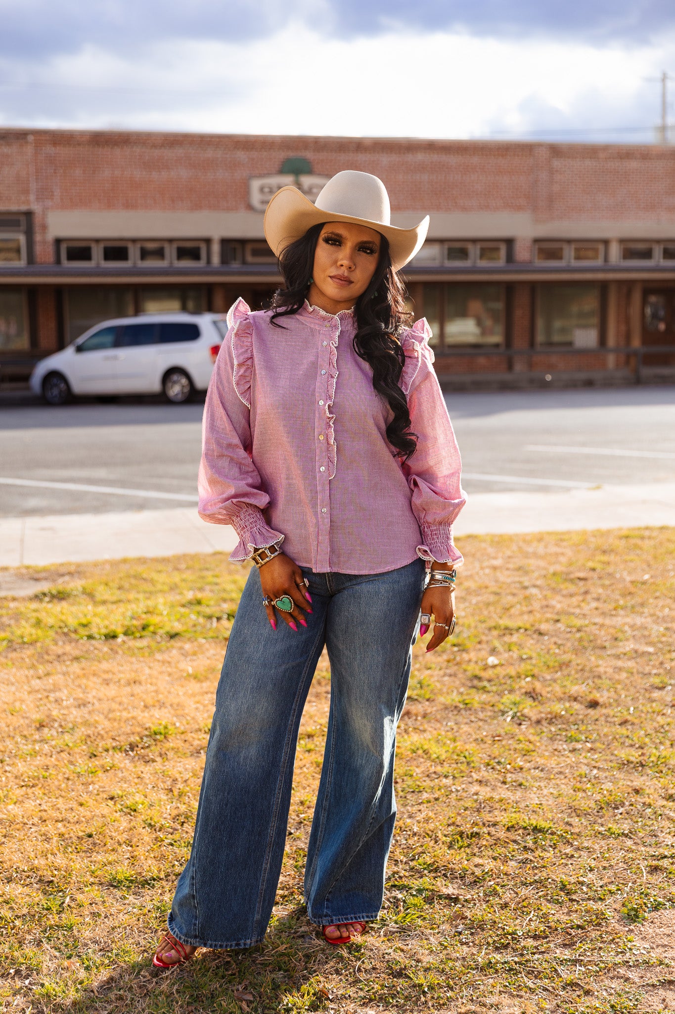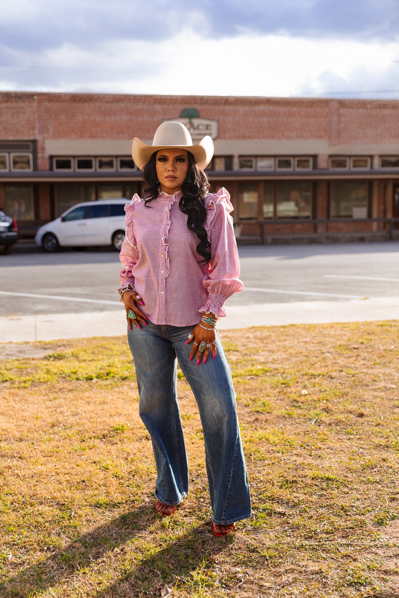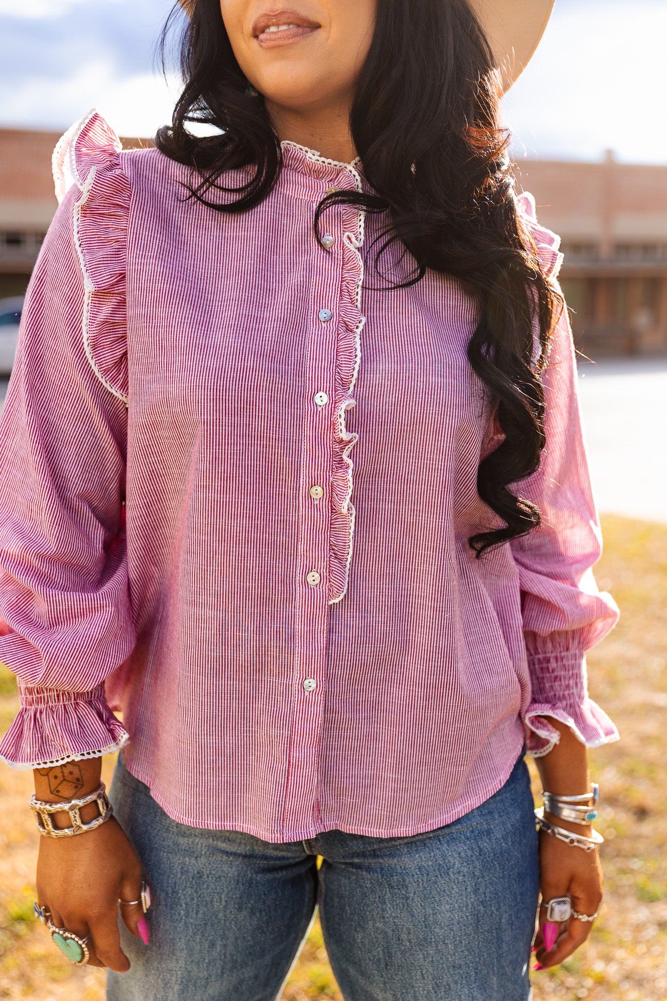 Elevate your wardrobe with The Blush Blossom Top! This stunning red pinstripe button-down blouse features a charming ruffle neck, collar, and cuffs adorned with delicate white lace trim, bringing a touch of elegance to any outfit. Feel confident and stylish, whether you're at the office or out with friends!