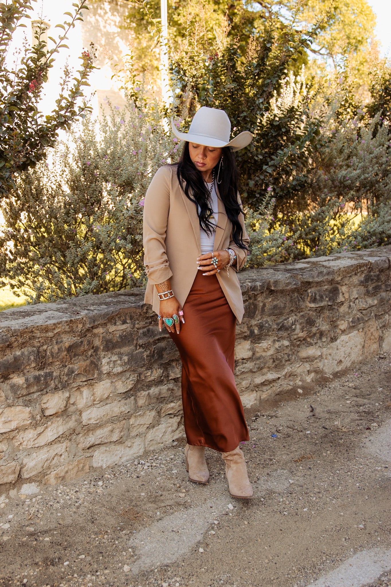 Be golden brown and satin smooth in The Broken Arrow Skirt. This playful maxi skirt will add a touch of elegance to any outfit, while still keeping things fun and quirky. Perfect for those who don't take themselves too seriously.