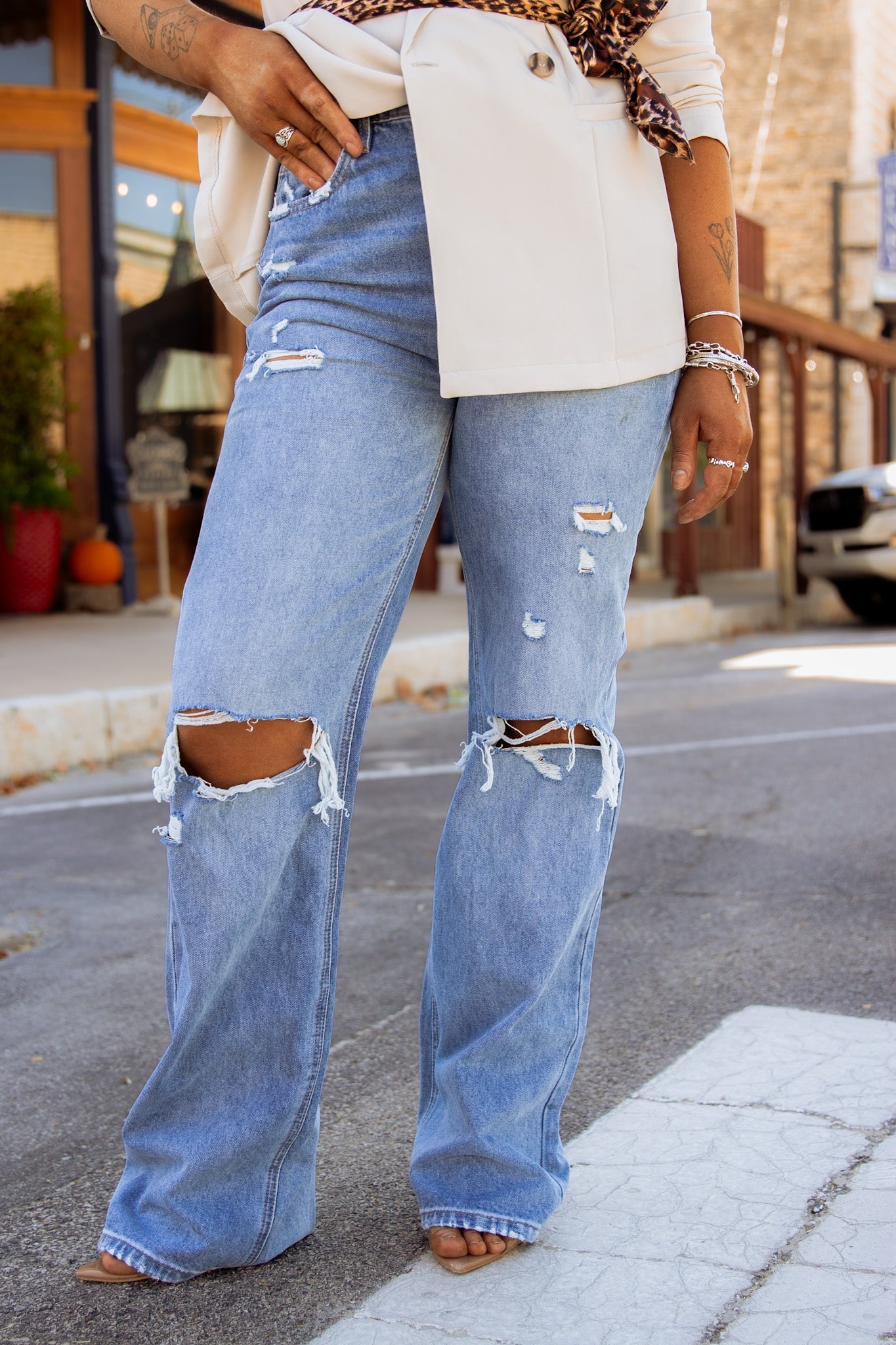 Unleash your daring side with The Fearless Jeans. Made from non-stretch denim, these 90's vintage inspired jeans feature a super high rise waist and 5 pockets for a classic look. The distressed detail and finished hem add a touch of edginess to the medium light wash. Channel your inner fashion rebel with these straight flare jeans.