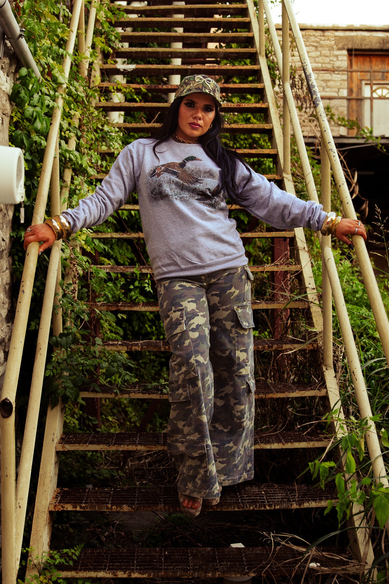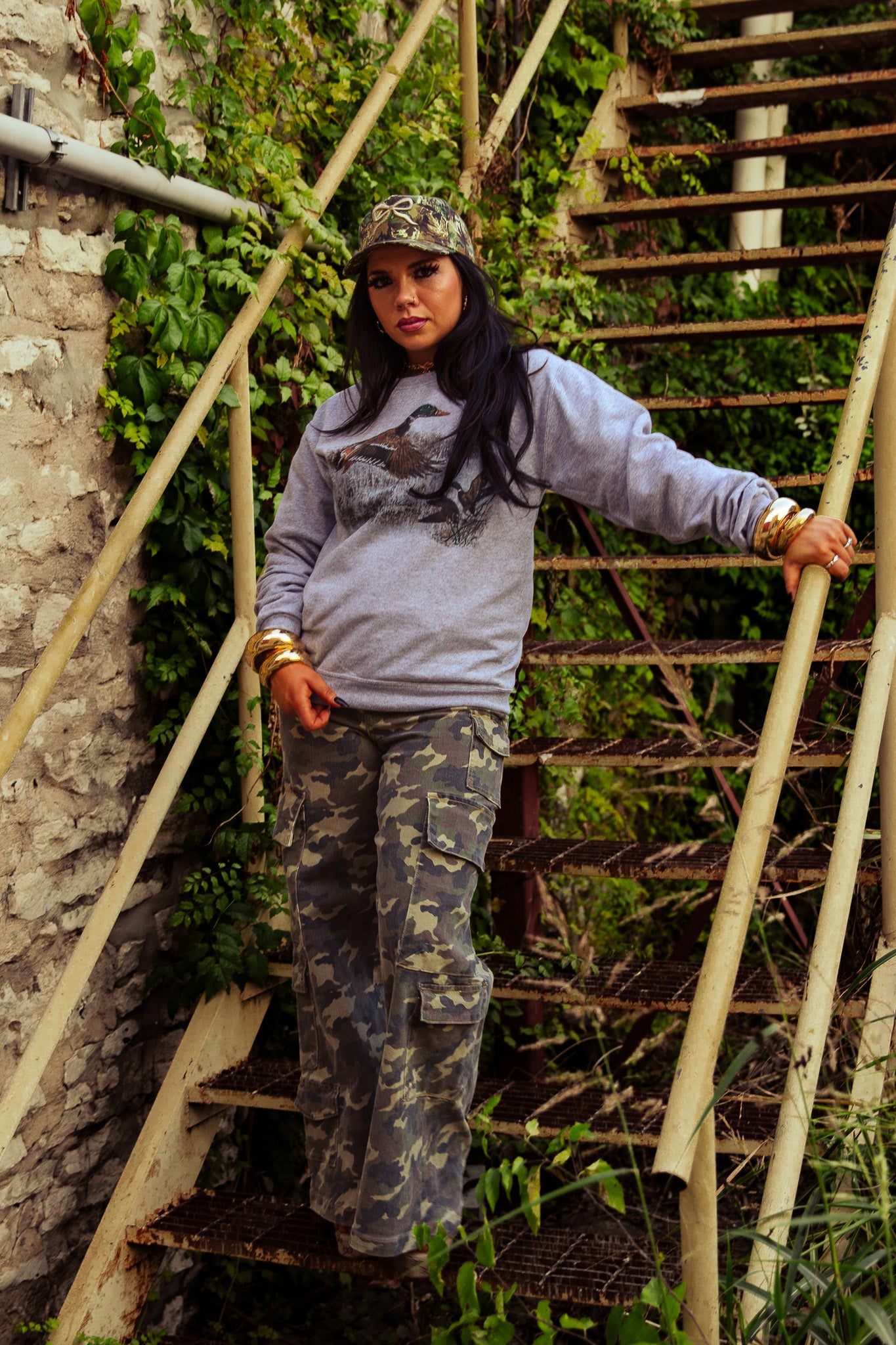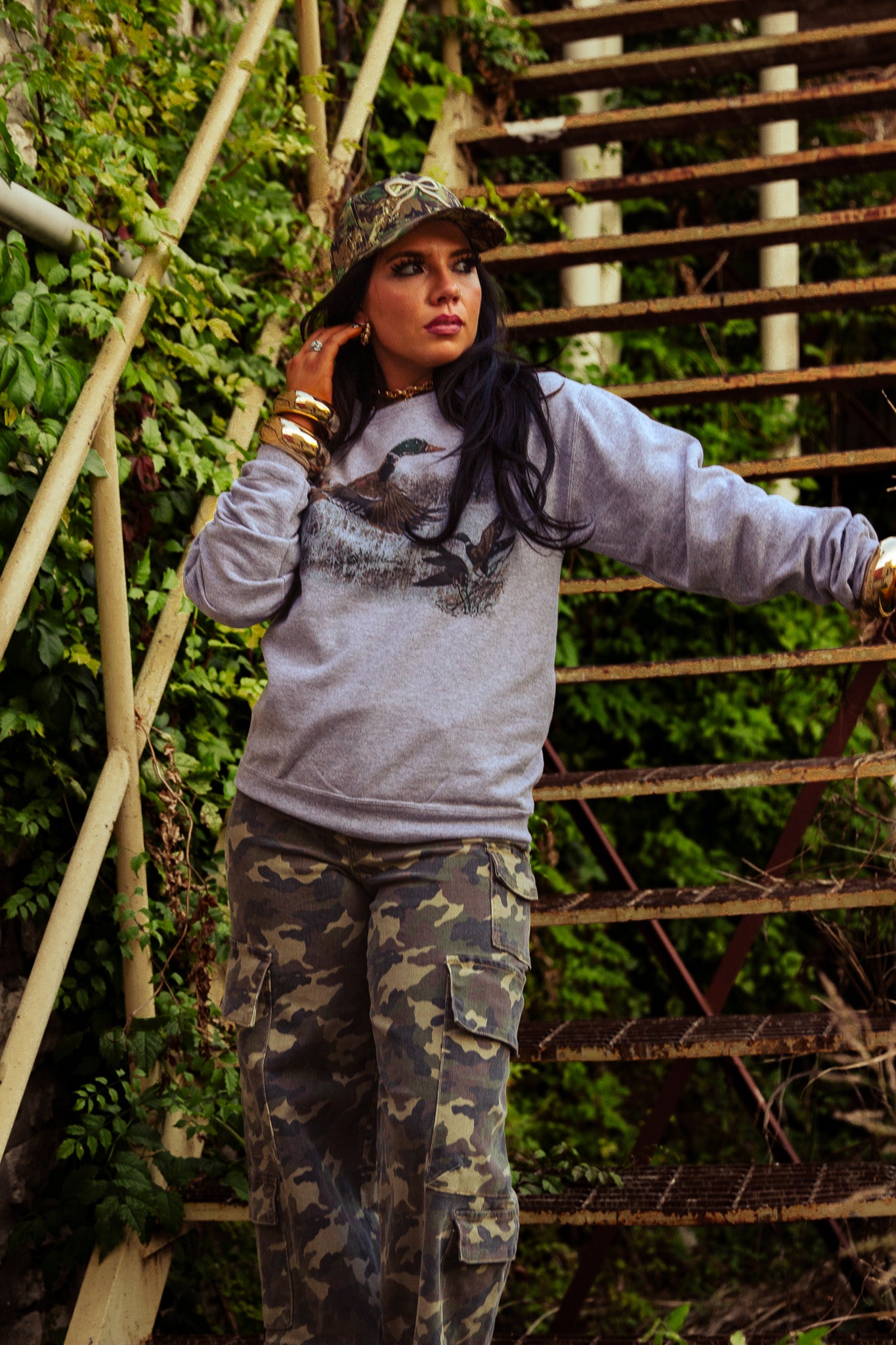 "The Prairie Pond Darling sweater showcases a beautiful duck scene, perfect for nature lovers. Made with high-quality materials, this sweater offers both style and functionality. Stay warm and stylish with this unique and charming addition to your wardrobe."