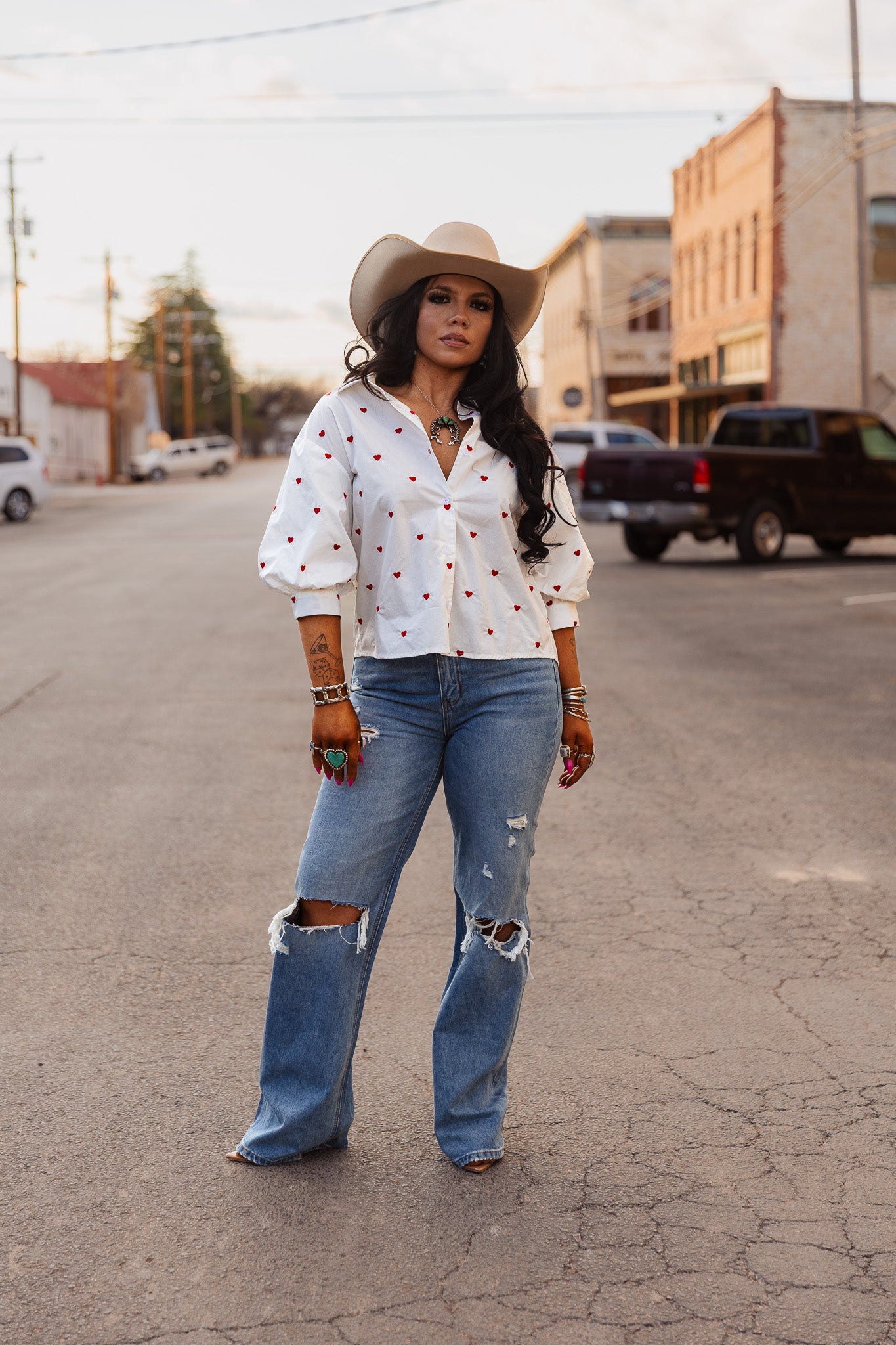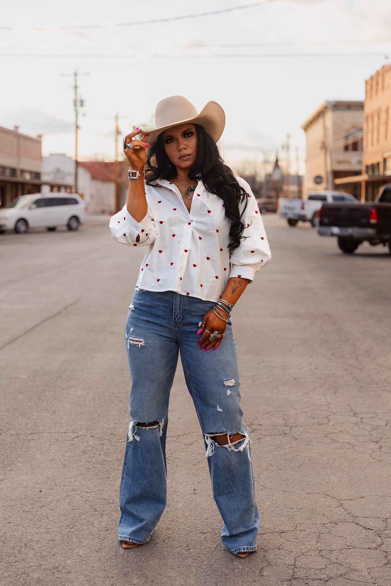 Embrace the spirit of love with The Pretty Little Heart Top! This charming white shirt features a delightful red Valentine's heart embroidered design, perfect for adding a touch of romance to your wardrobe. Wear it to express your passion and make a sweet statement every day!
