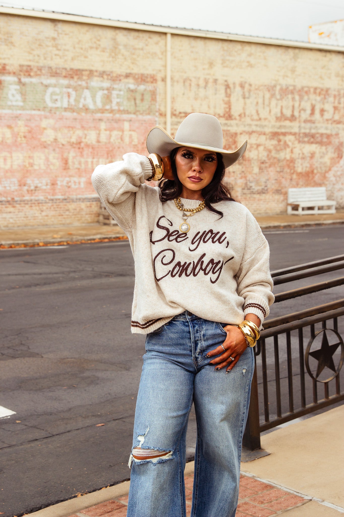 Say hello to your new favorite statement knit. Our See You, Cowboy! Sweater features a soft, cozy oatmeal knit with bold western script that adds the perfect touch of personality. The relaxed fit and ribbed trim give it that effortless, lived-in feel — easy to throw on with denim, lounge pants, or boots for a day out. Playful, comfy, and unmistakably cowgirl, it’s the sweater that does all the talking.