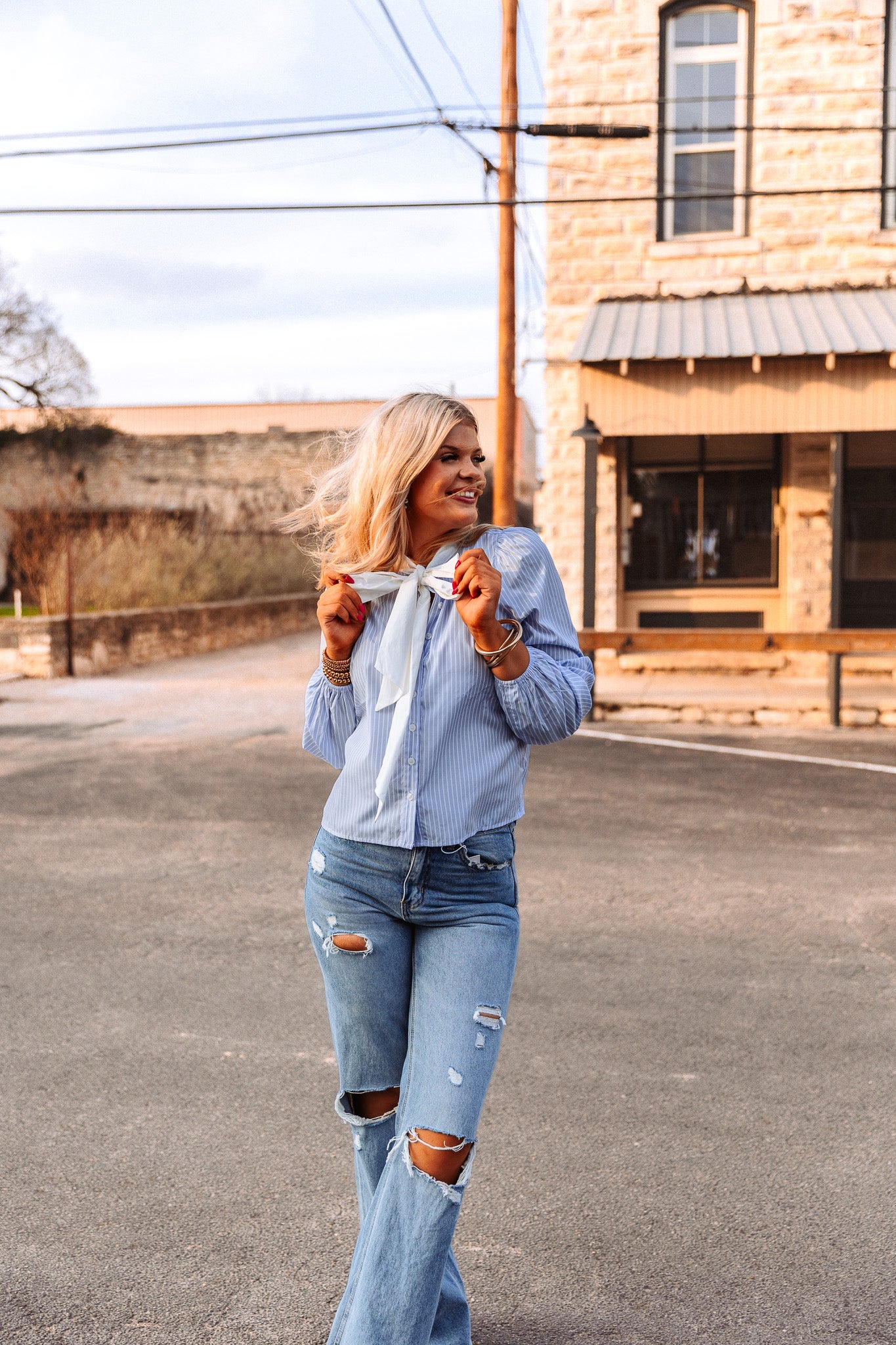 The Sweetwater Top features a color block design in a sophisticated striped pattern of sky blue and white. This blouse combines visual appeal with versatility, making it suitable for various occasions. Its lightweight fabric enhances breathability and comfort, ensuring ease of movement throughout the day.