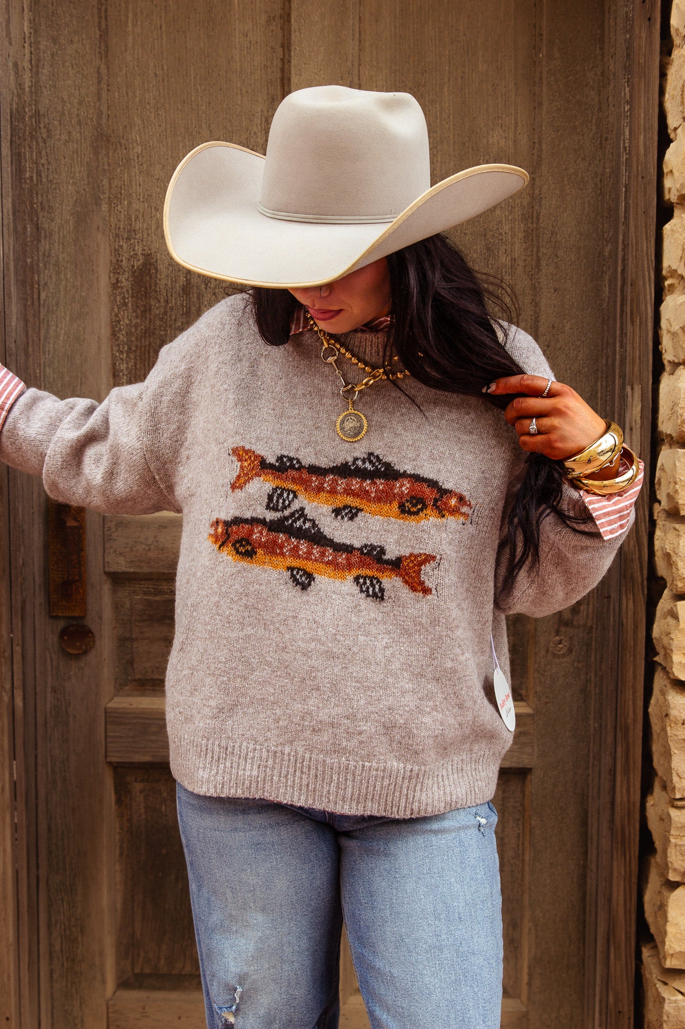Our Trout Trail Knit Sweater brings a touch of lodge-side charm to your everyday wardrobe. Designed in a soft oatmeal knit with a vintage-inspired trout graphic, it’s the perfect mix of cozy and playful. The relaxed fit makes it easy to throw on for early-morning coffee, cabin trips, or cool-weather outings. Pair it with denim, leggings, or joggers for that effortless “weekend at the river” vibe. Outdoorsy, comfy, and totally unique — this one’s a catch.