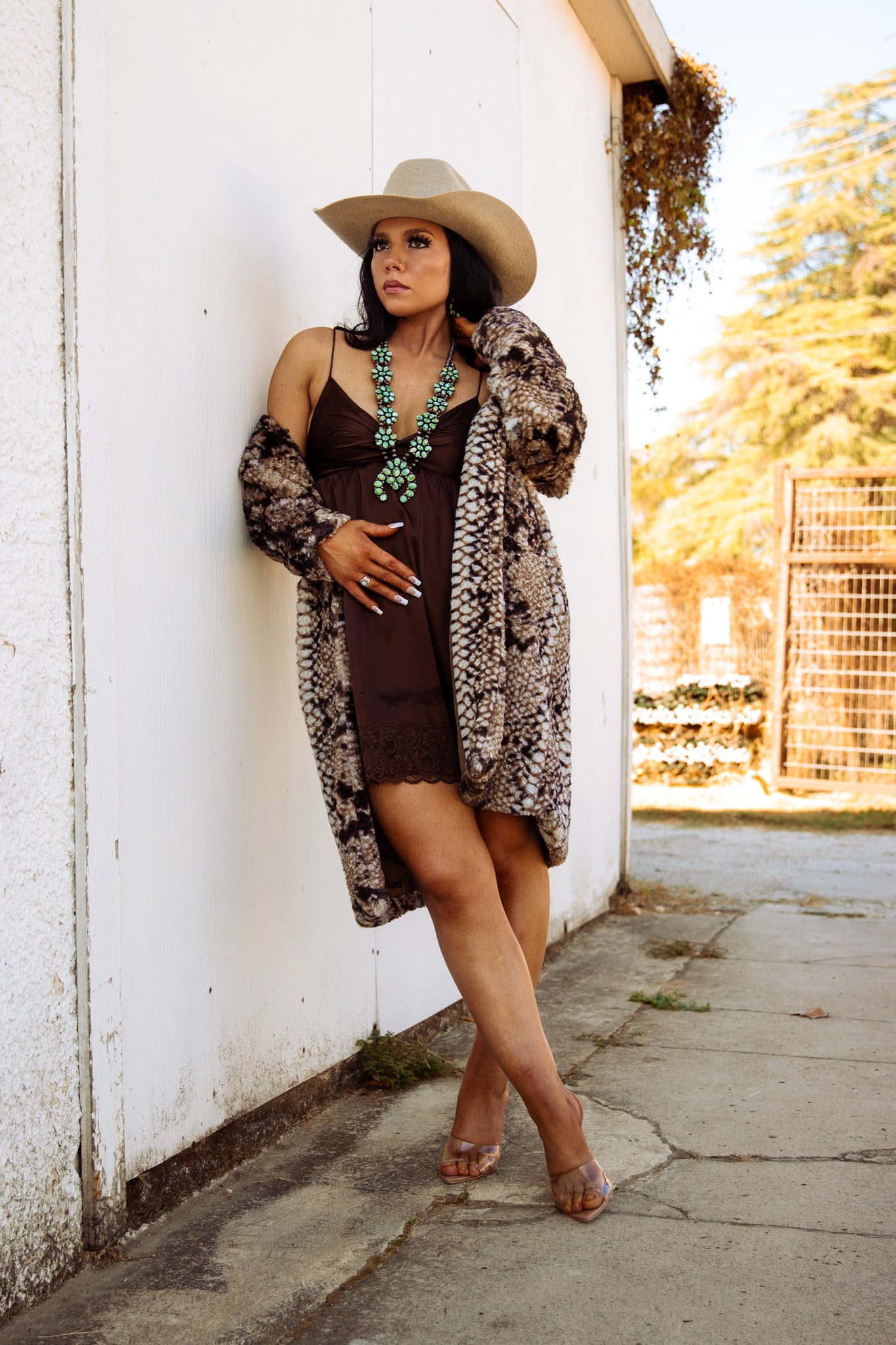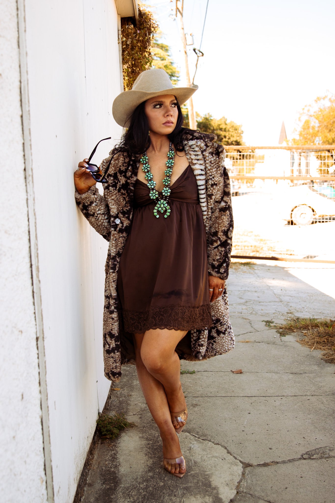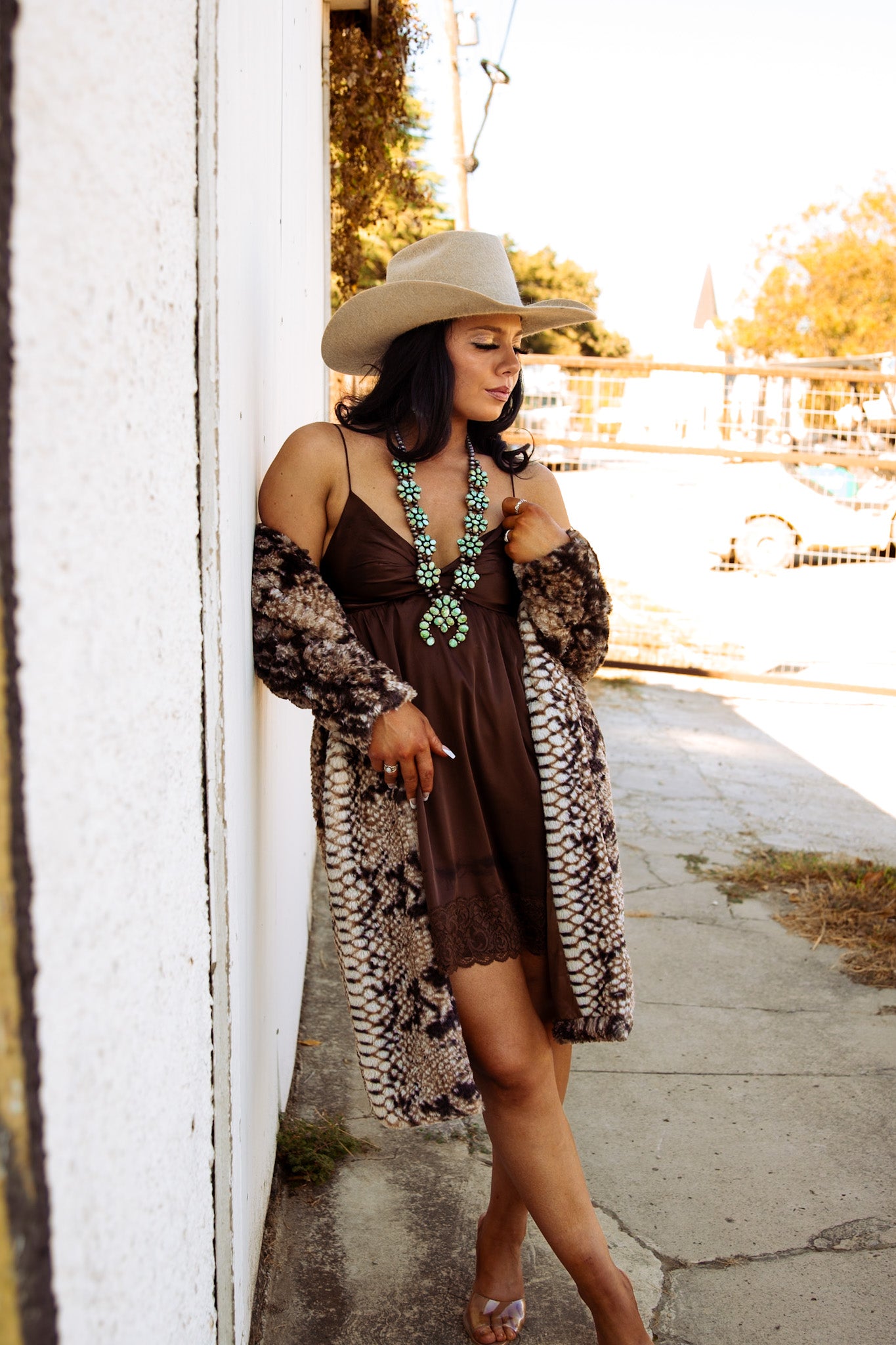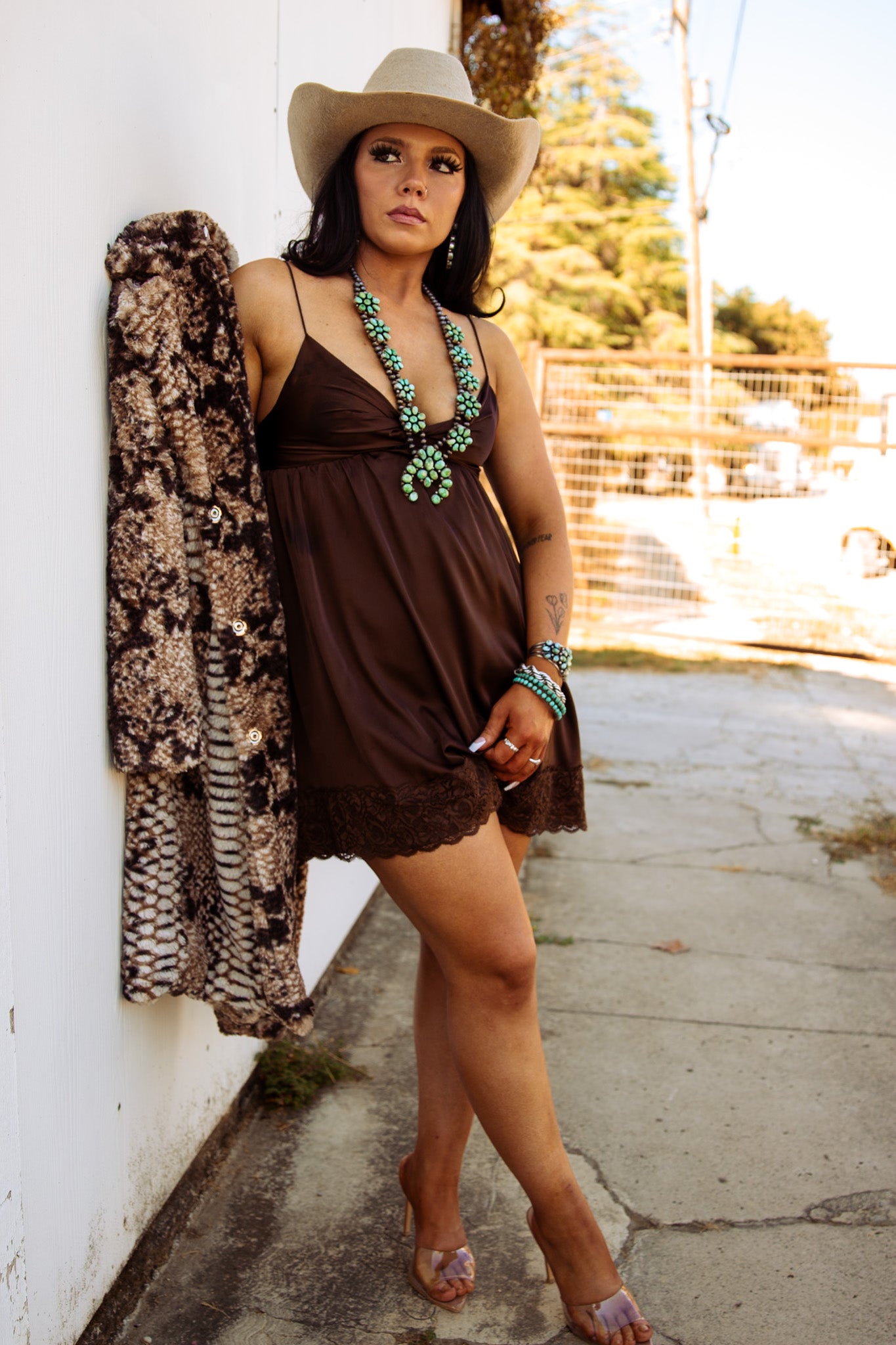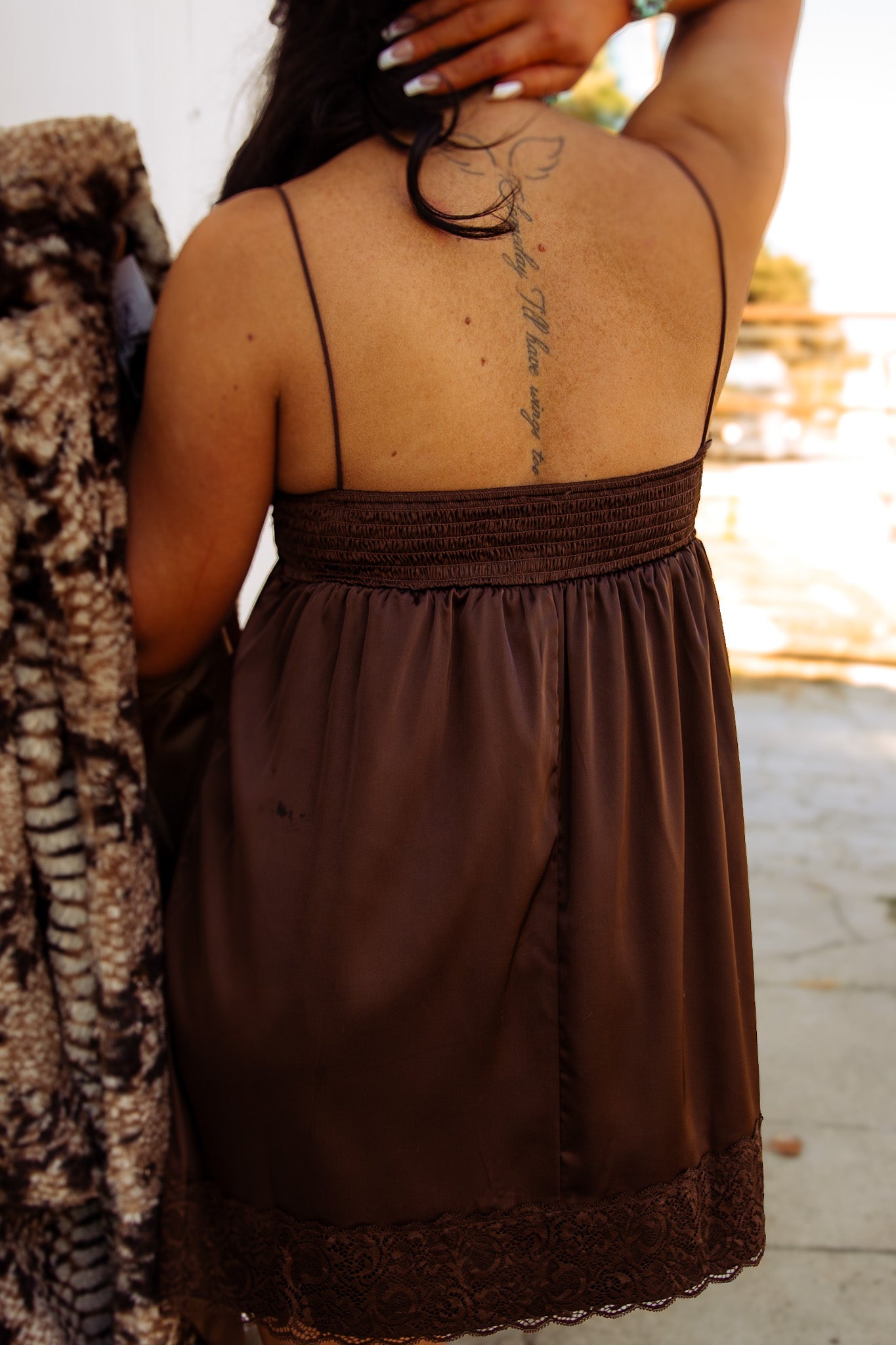 This rich chocolate satin mini dress blends cowgirl class with city-slick confidence. Featuring a soft satin finish, flirty lace trim, and a deep v-neckline that drapes just right, this piece moves effortlessly from rodeo nights to rooftop cocktails. The adjustable spaghetti strap-style fit makes it flattering and comfortable for any shape.