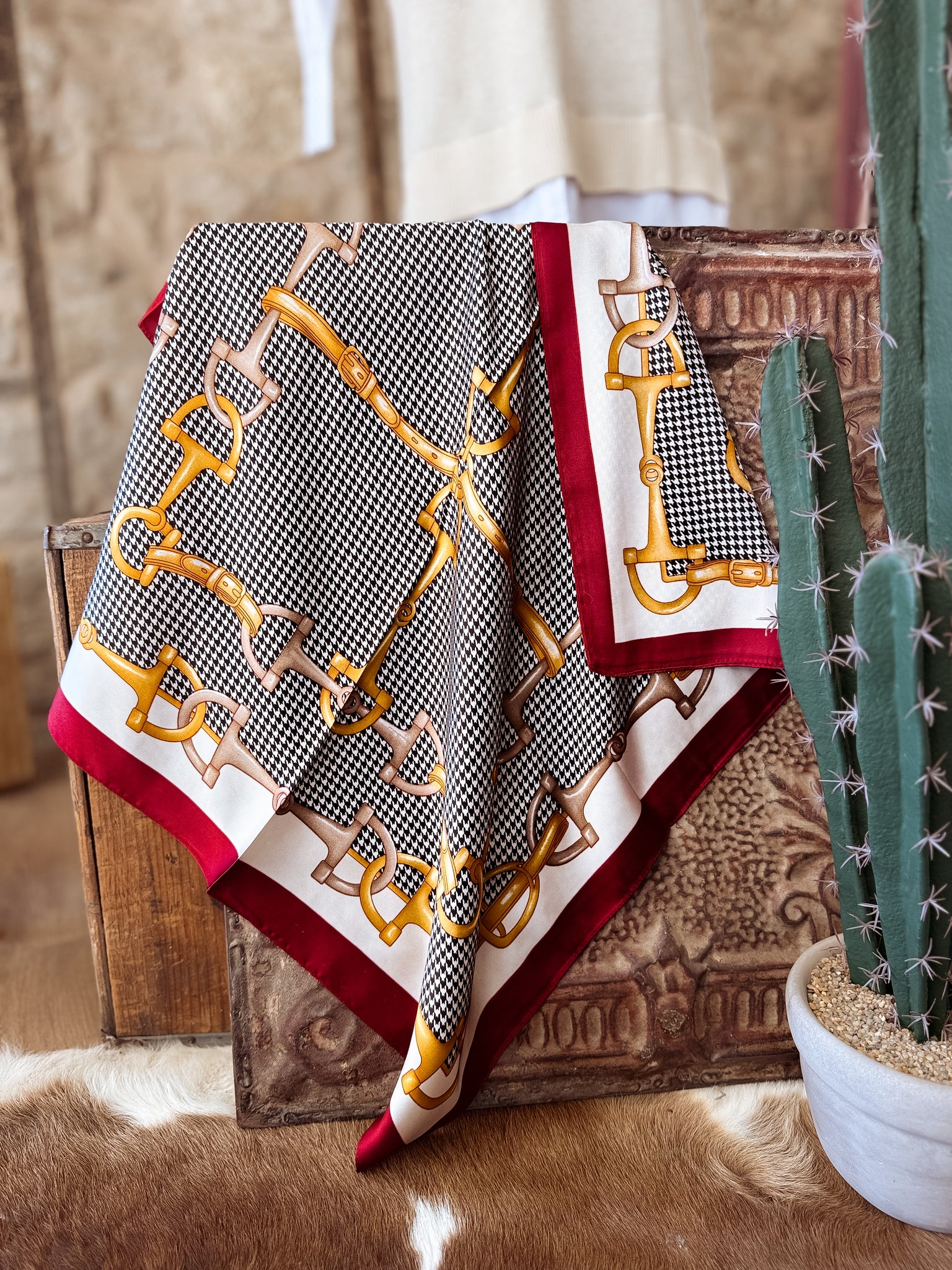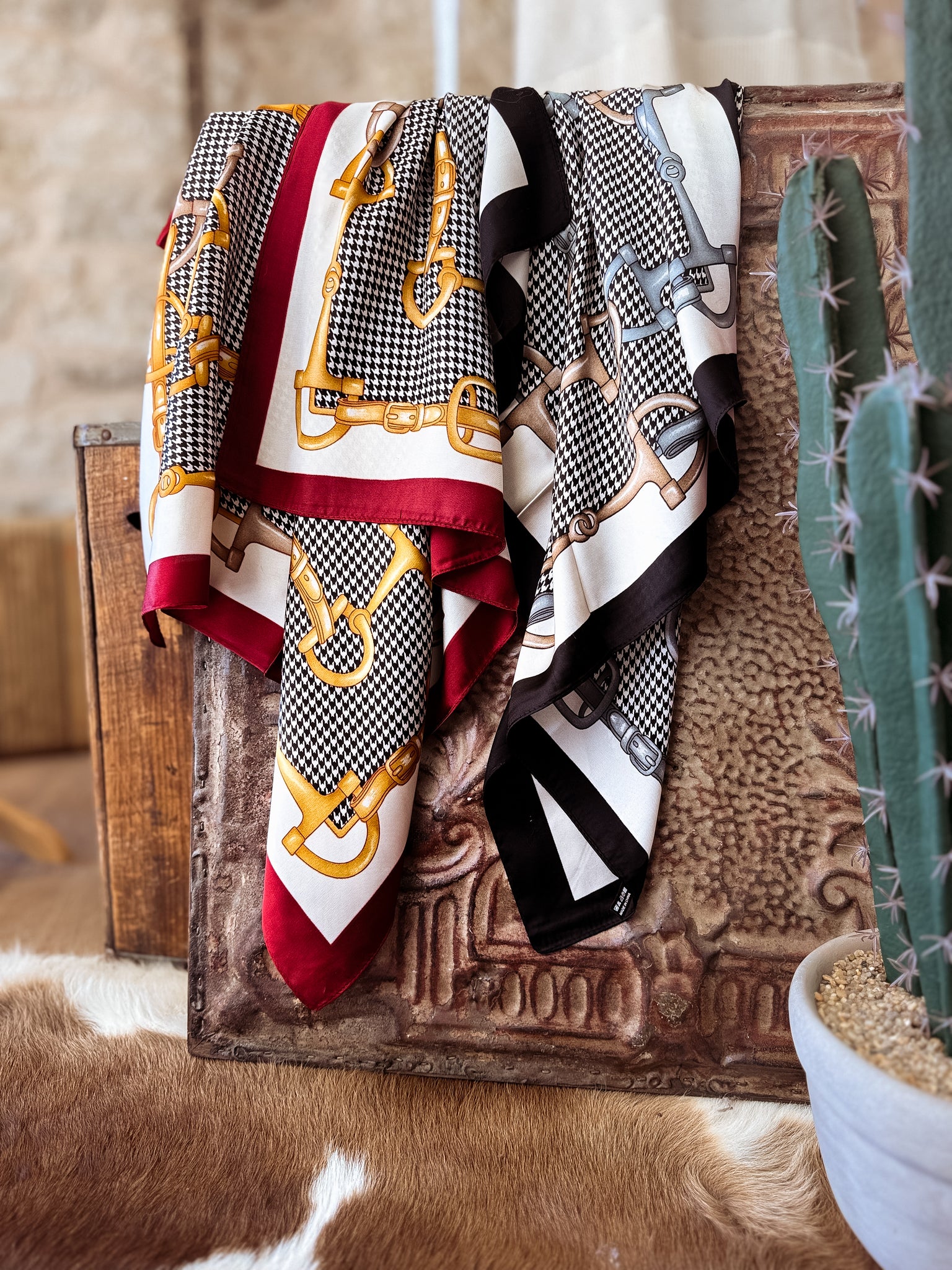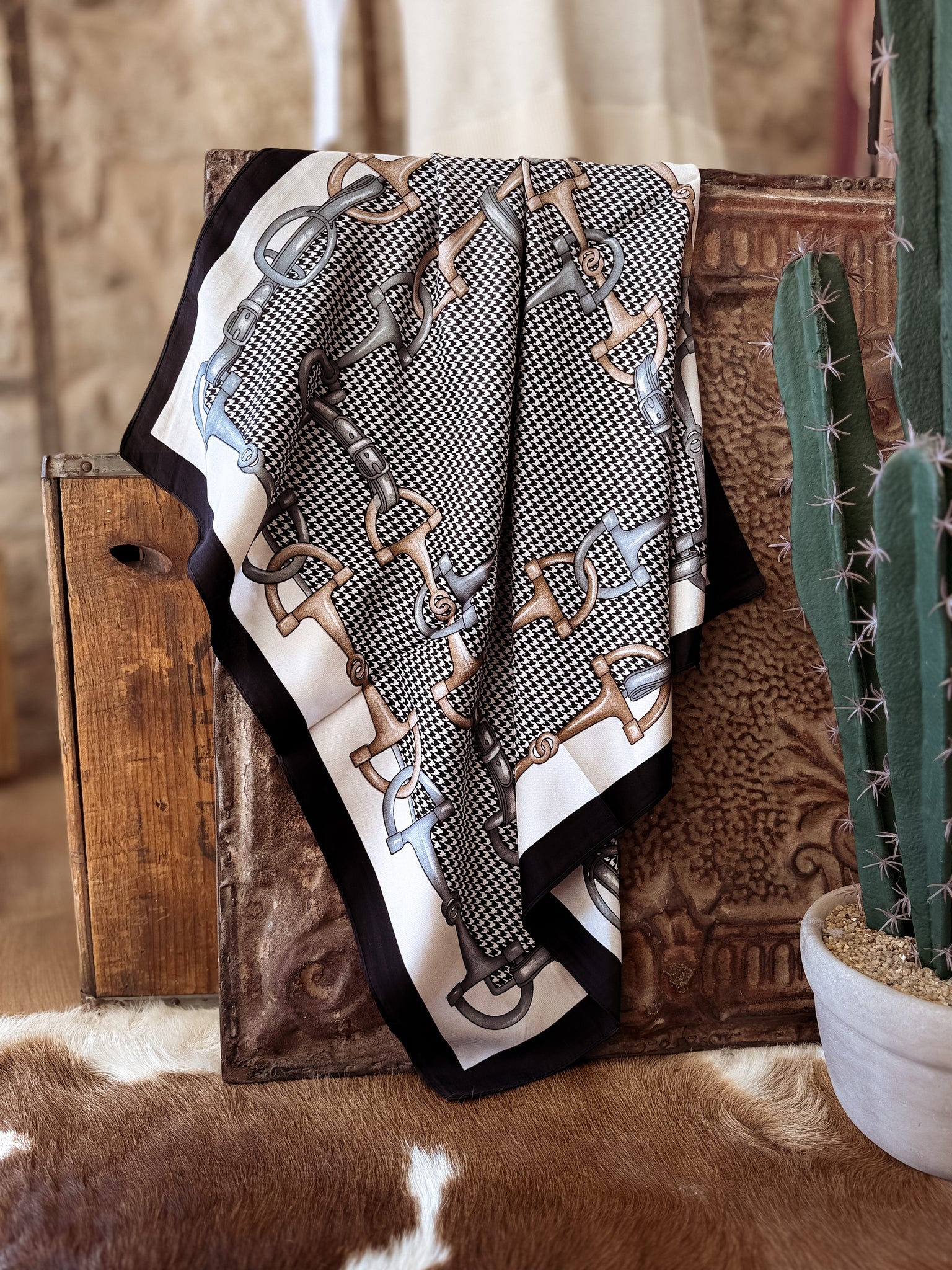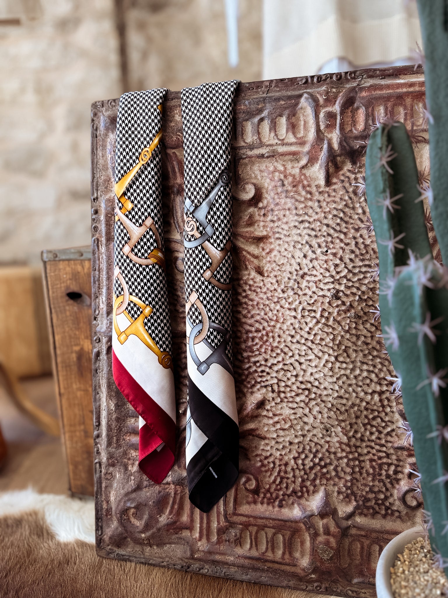 Turn heads under the neon lights with the Sin City Snaffle Bit wild rag. Featuring an equestrian-inspired print with bits and buckles on a classic houndstooth base, this piece blends rodeo grit with runway glamour. Pair it with your NFR outfit for that polished yet punchy statement that screams “city cowgirl meets desert night.”