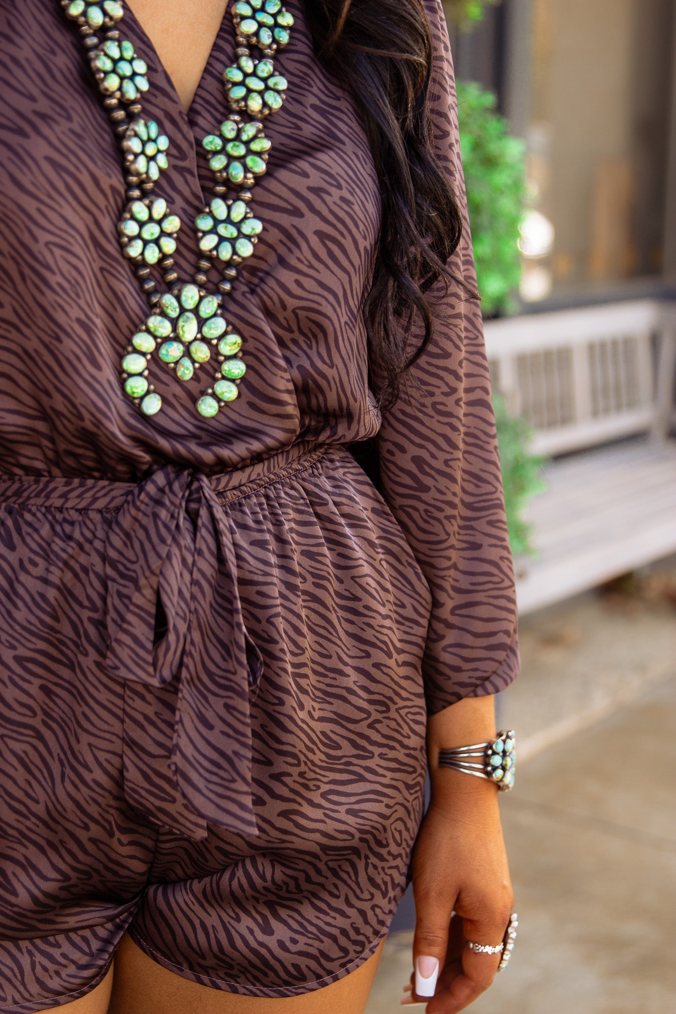 Elevate your style with our brown zebra printed classy and versatile romper. Perfect for any occasion, its timeless design exudes elegance and sophistication. Crafted with quality materials, this romper guarantees comfort and durability. Elevate your wardrobe with this must-have piece.