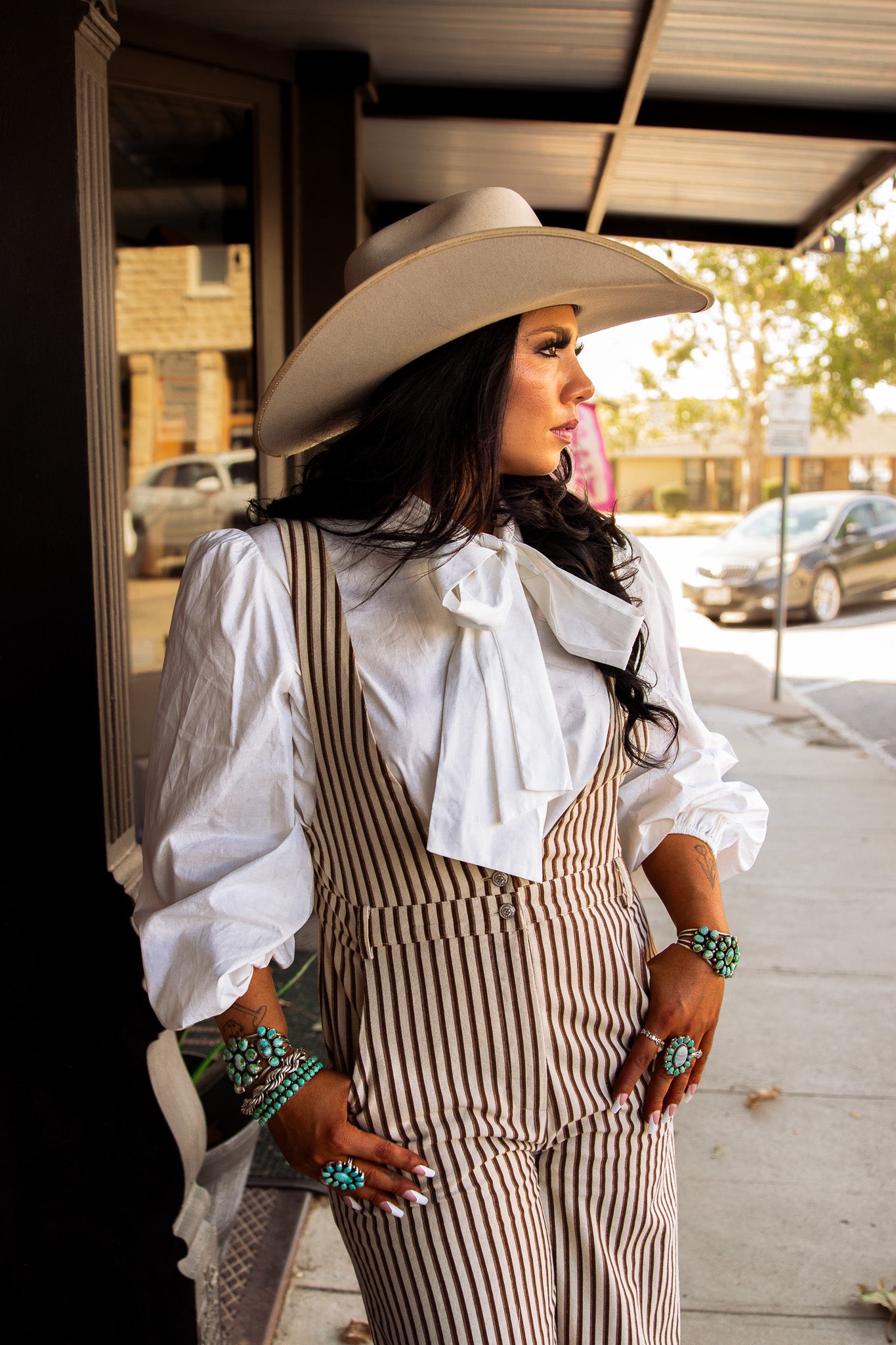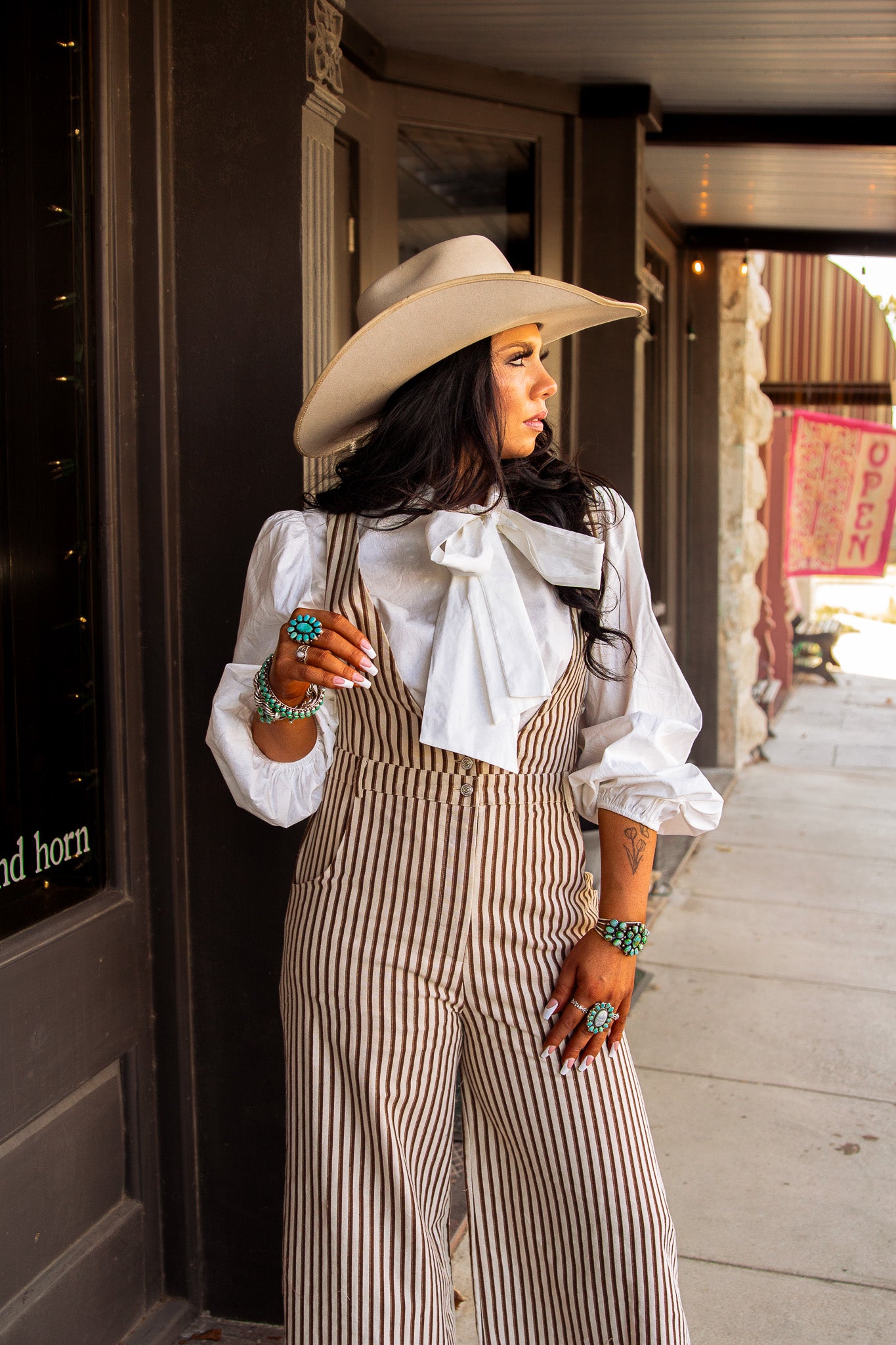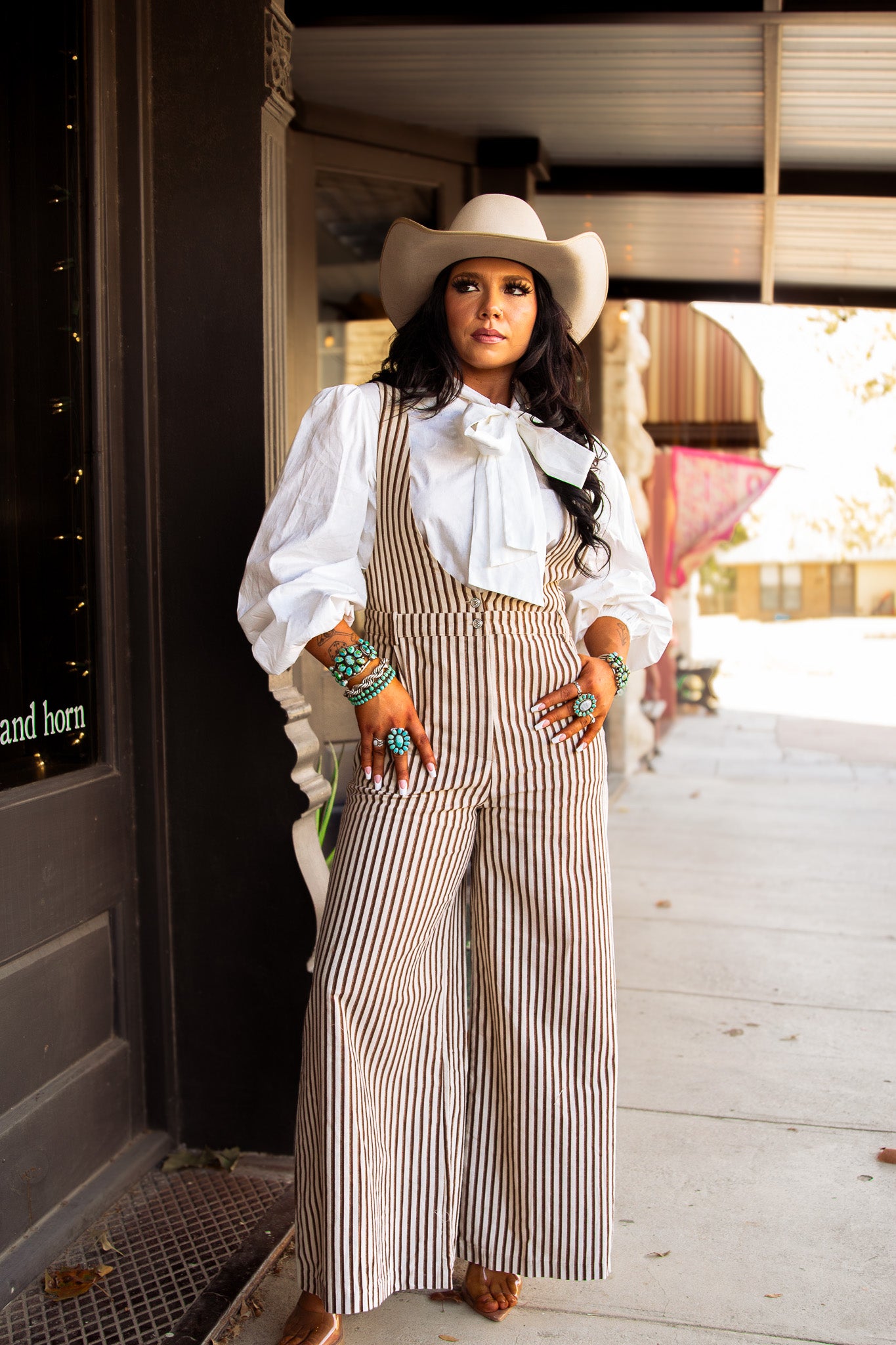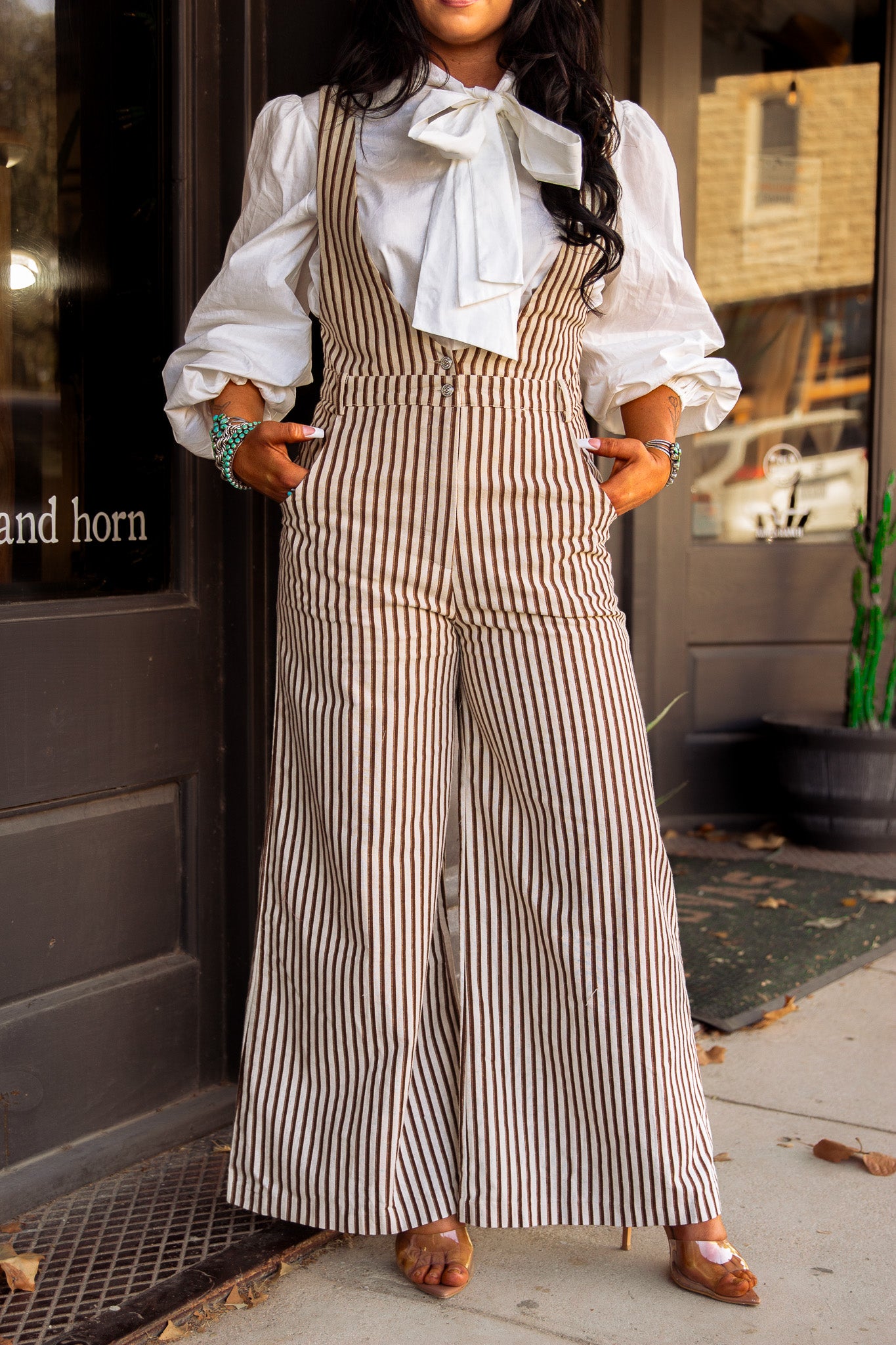 Expertly designed for style and comfort, The Sagebrush Striped Jumpsuit boasts a chic beige color with elegant brown stripes. Made with high-quality materials, this jumpsuit is perfect for any occasion. Elevate your wardrobe and make a statement with this must-have fashion piece.