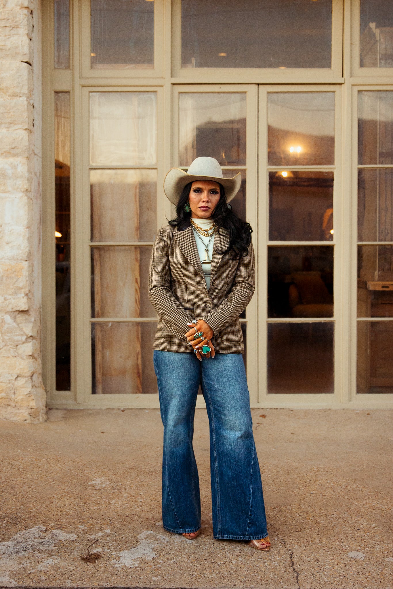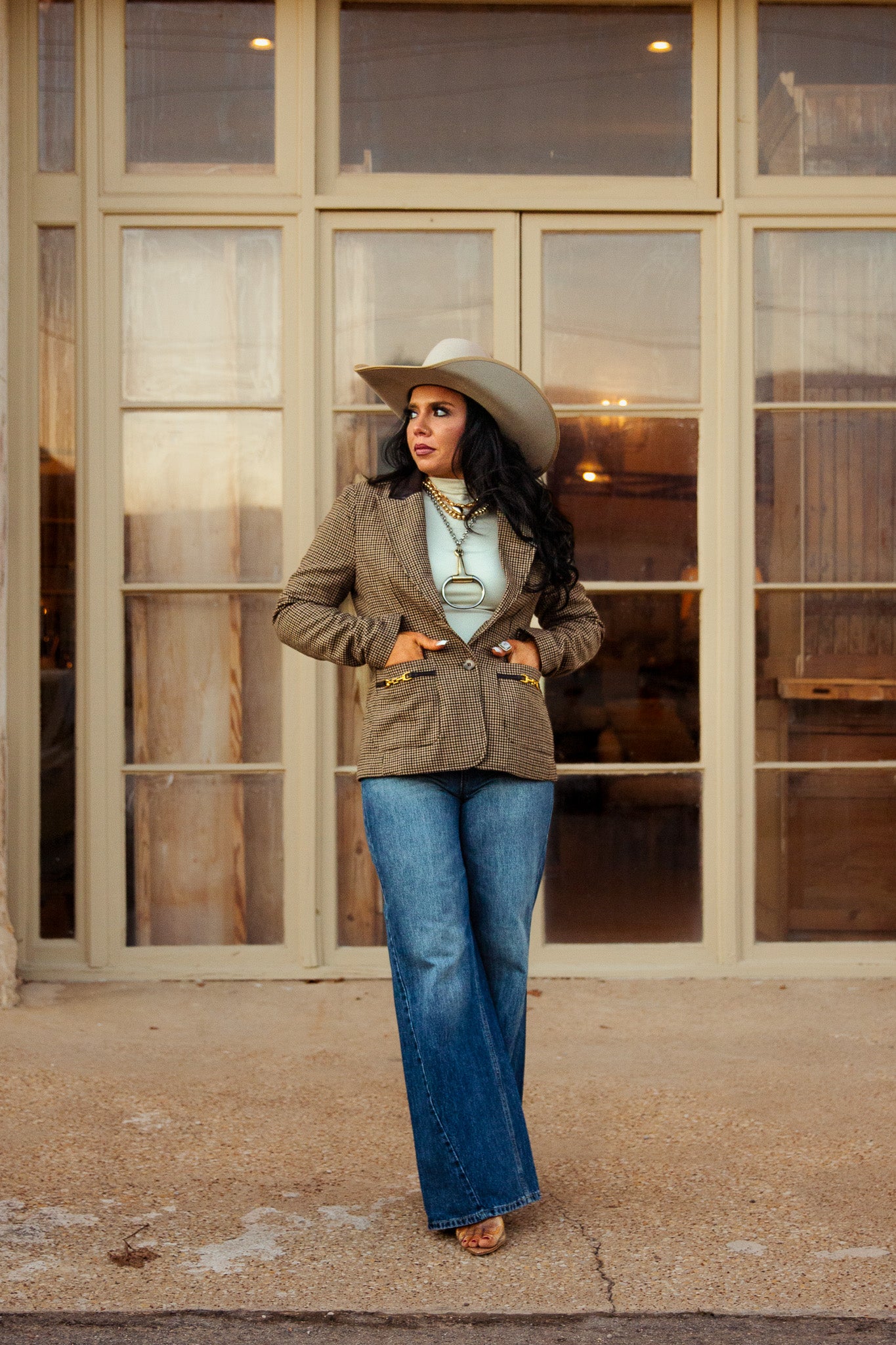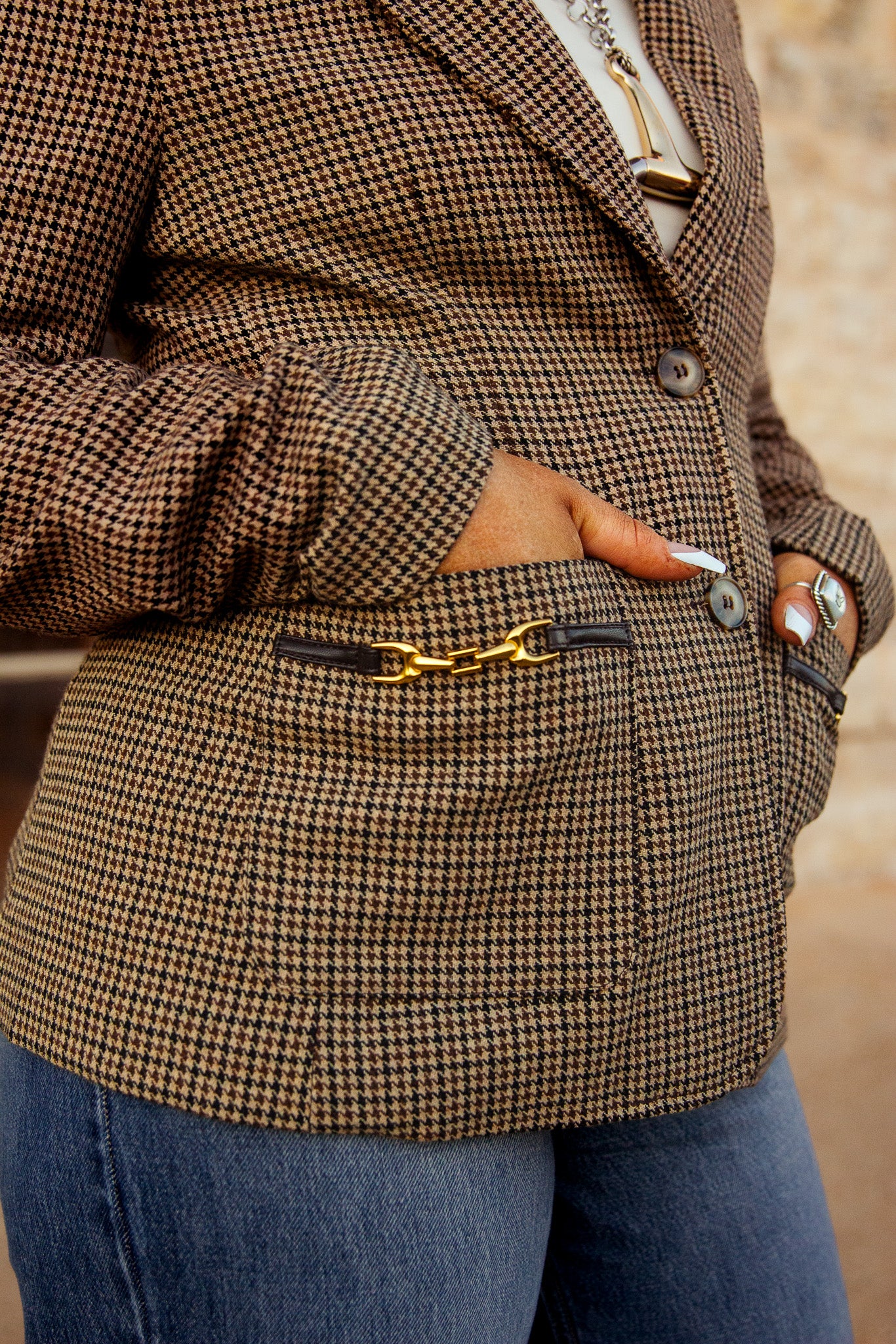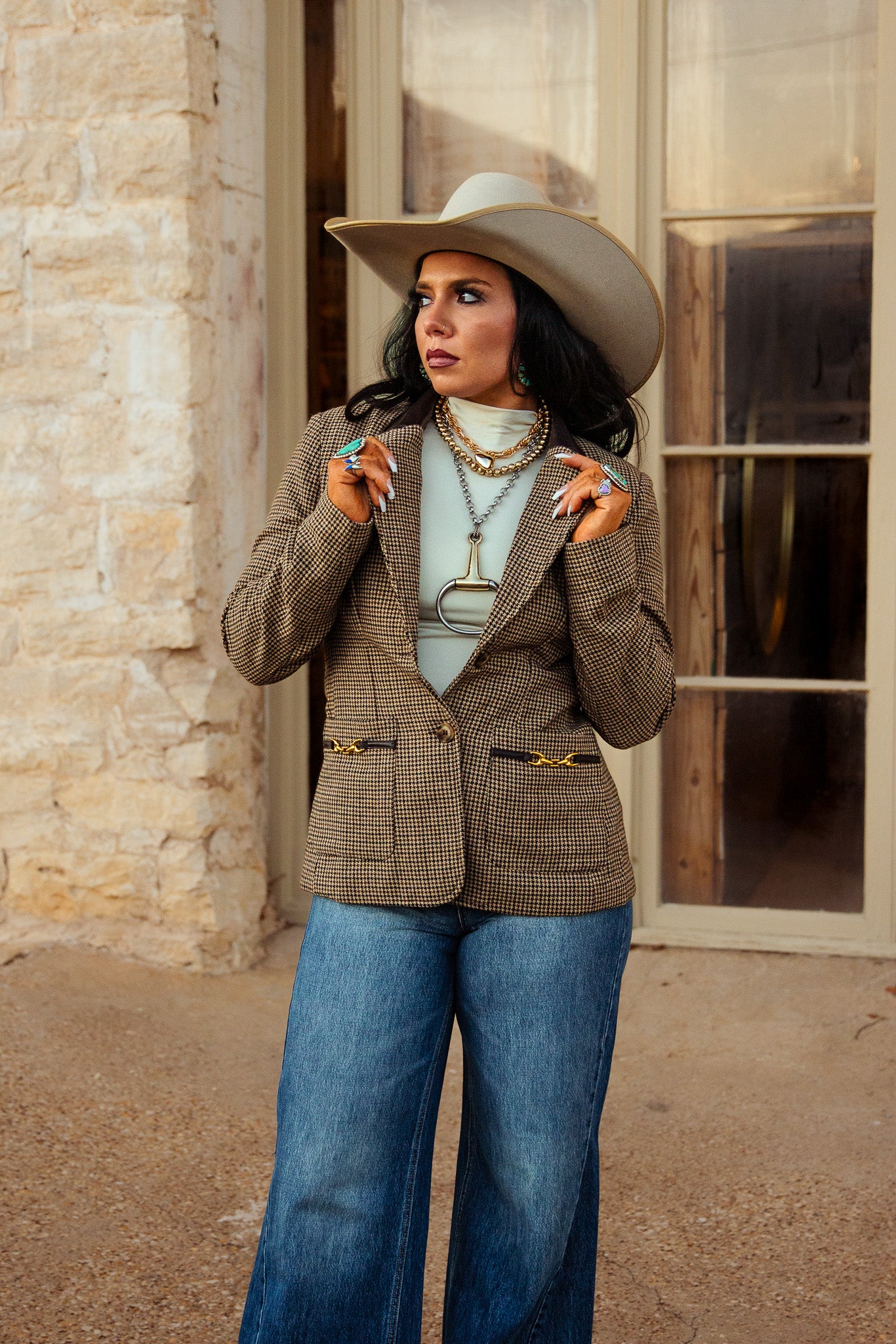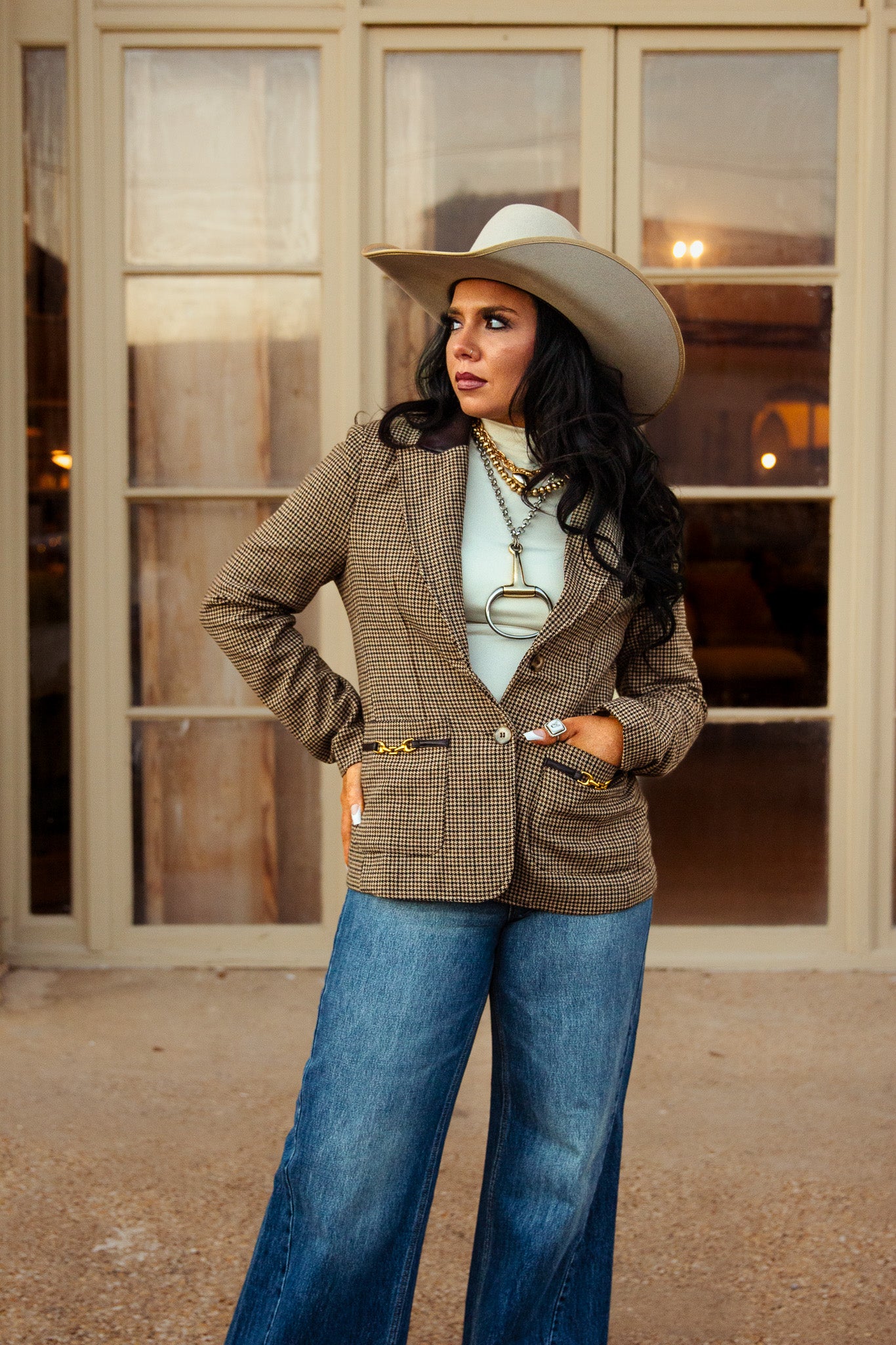 A structured brown houndstooth blazer featuring a contrasting leather collar that adds a subtle western–equestrian touch. It has a tailored fit with a double-button closure, front flap pockets accented with gold zipper details, and classic notched lapels. The fabric has a textured, vintage-inspired look, giving it a polished yet rustic feel.