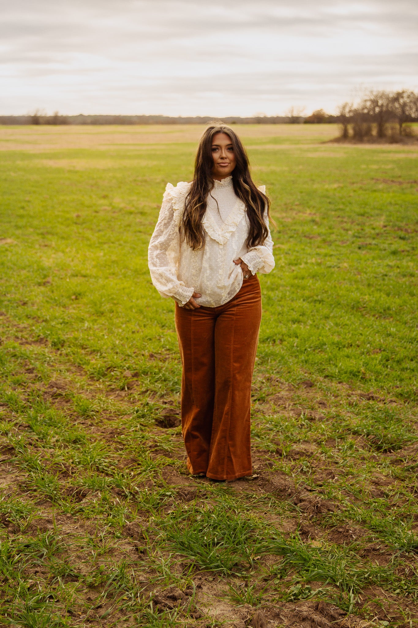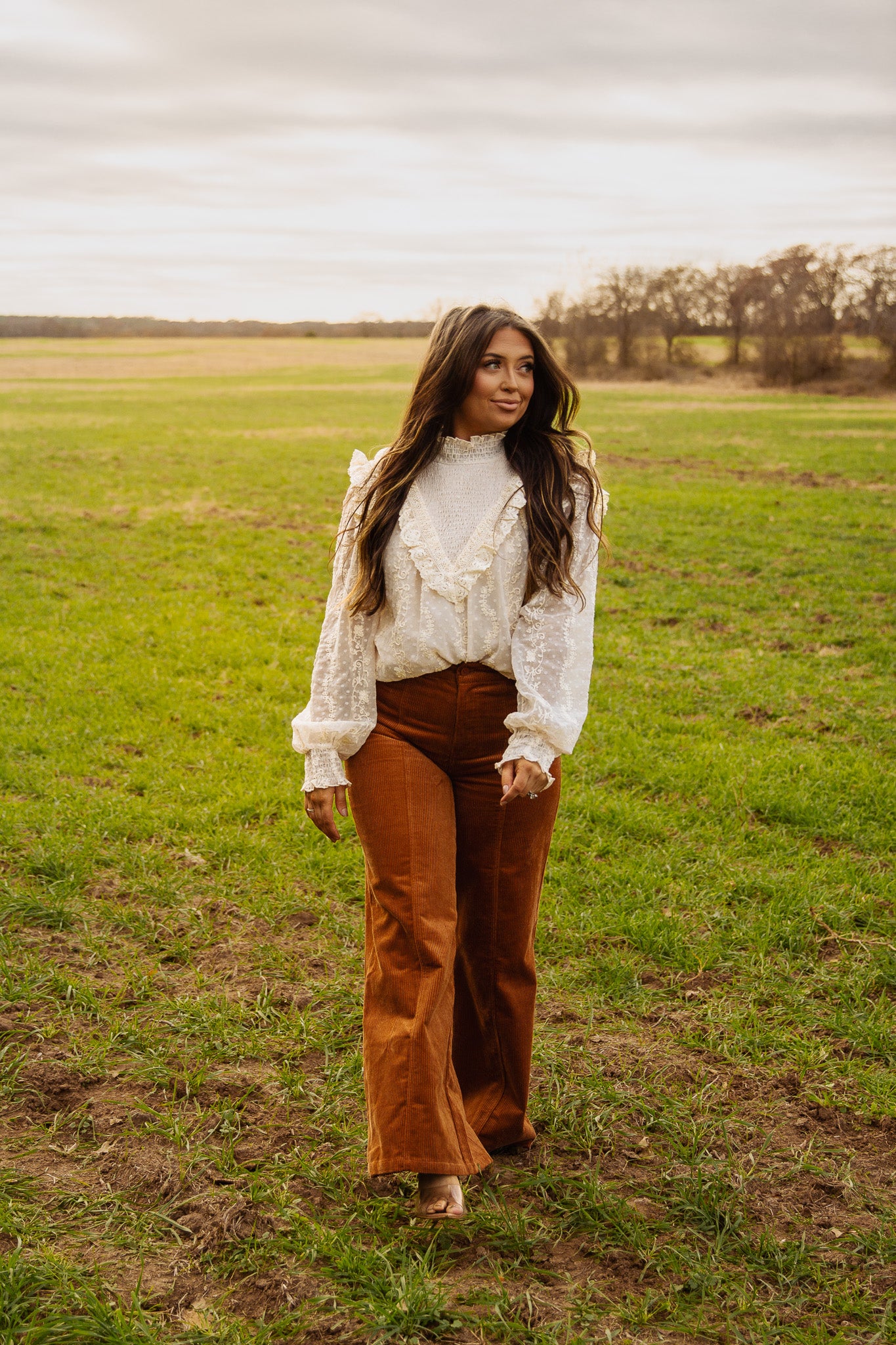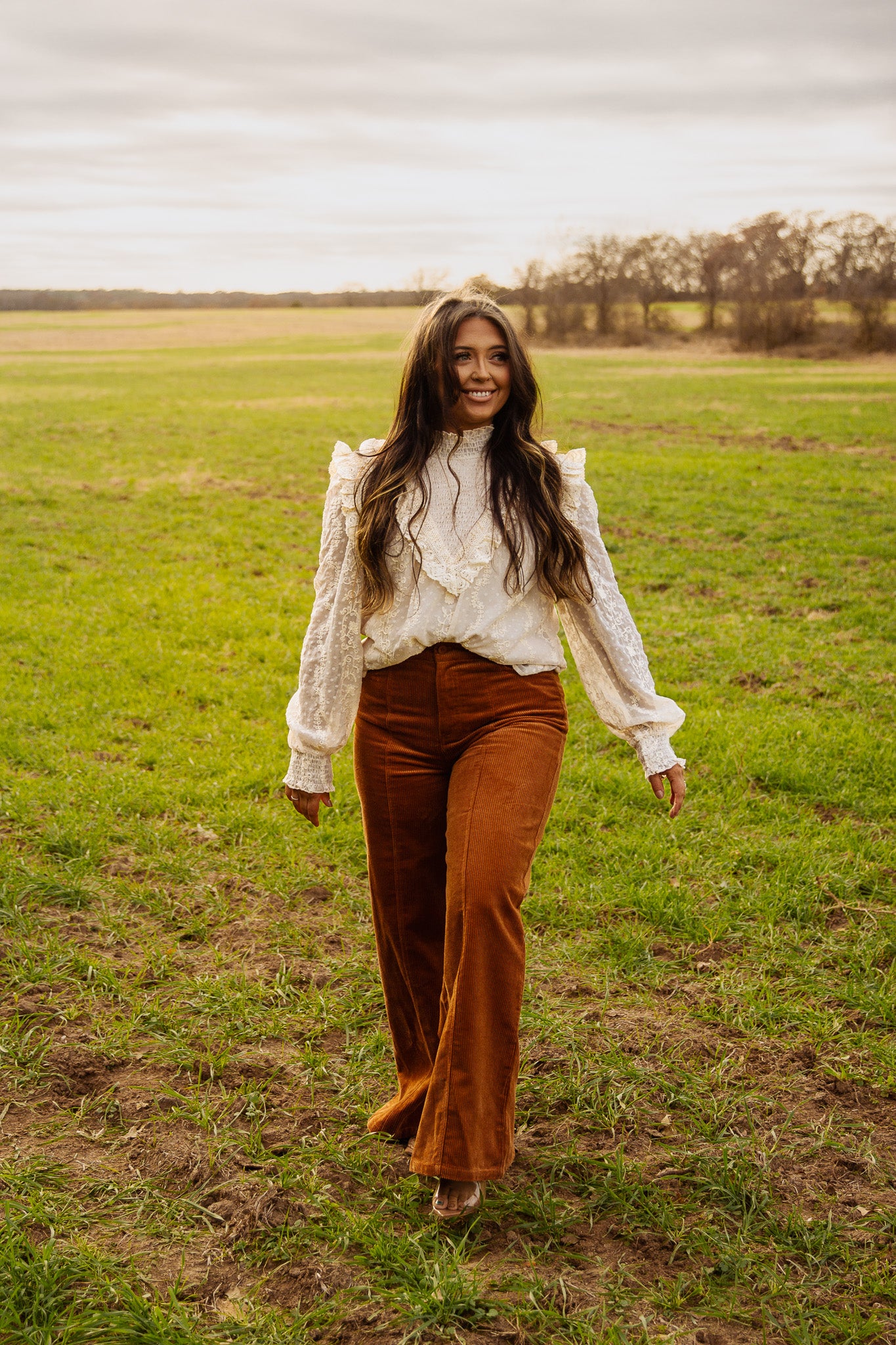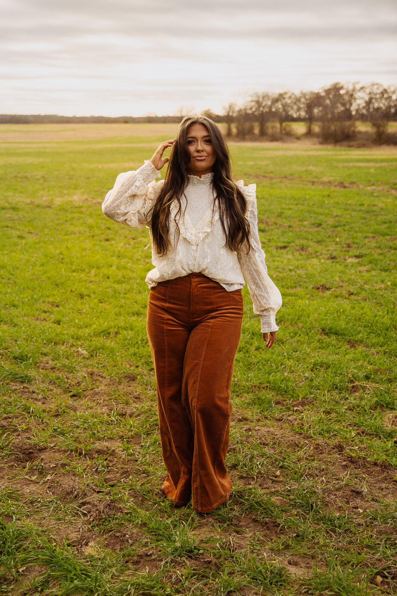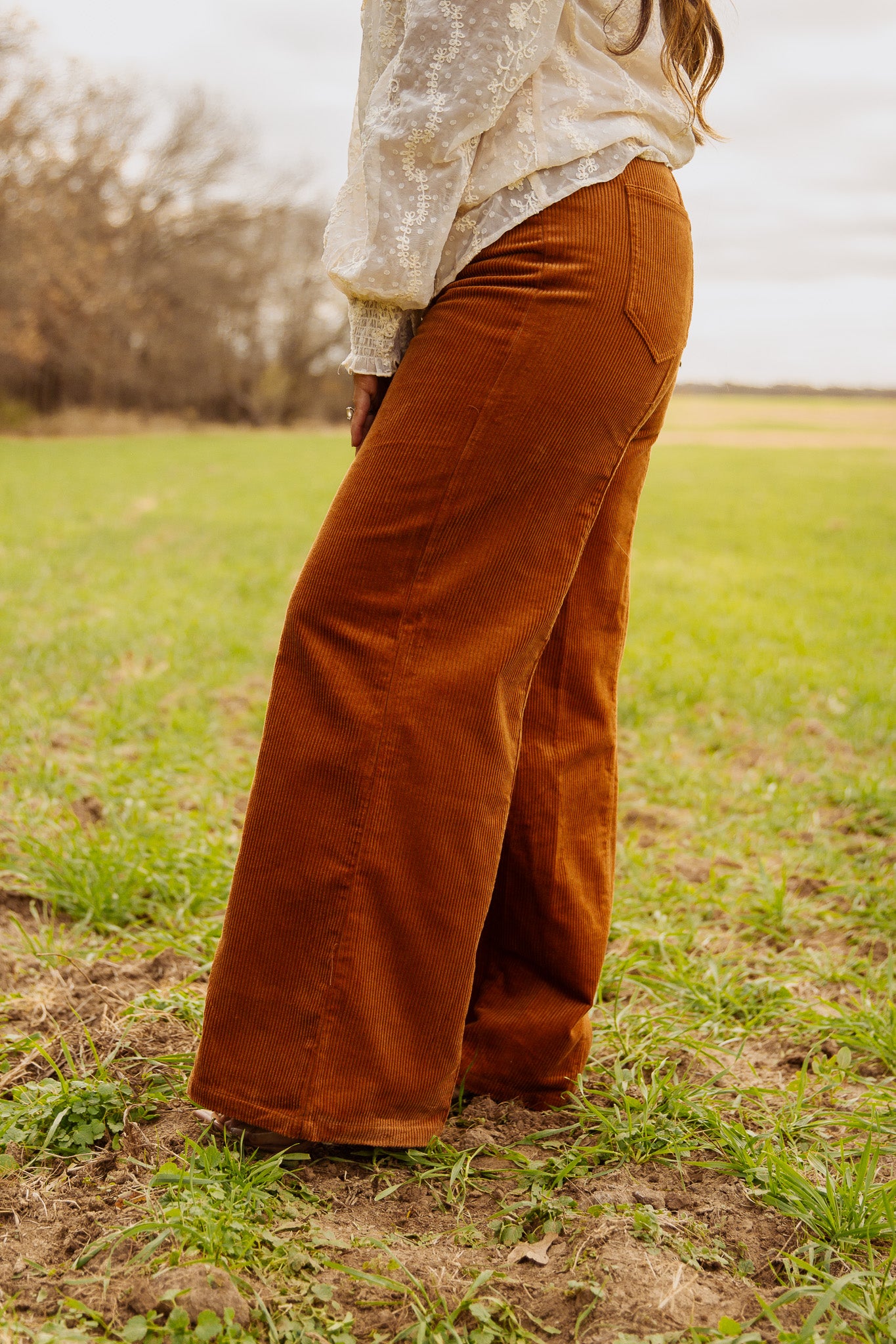 A high-rise, wide-leg corduroy pant in a rich saddle brown hue. Soft yet structured with a flattering drape, this elevated staple brings timeless western polish to blouses, knits, and statement jackets.