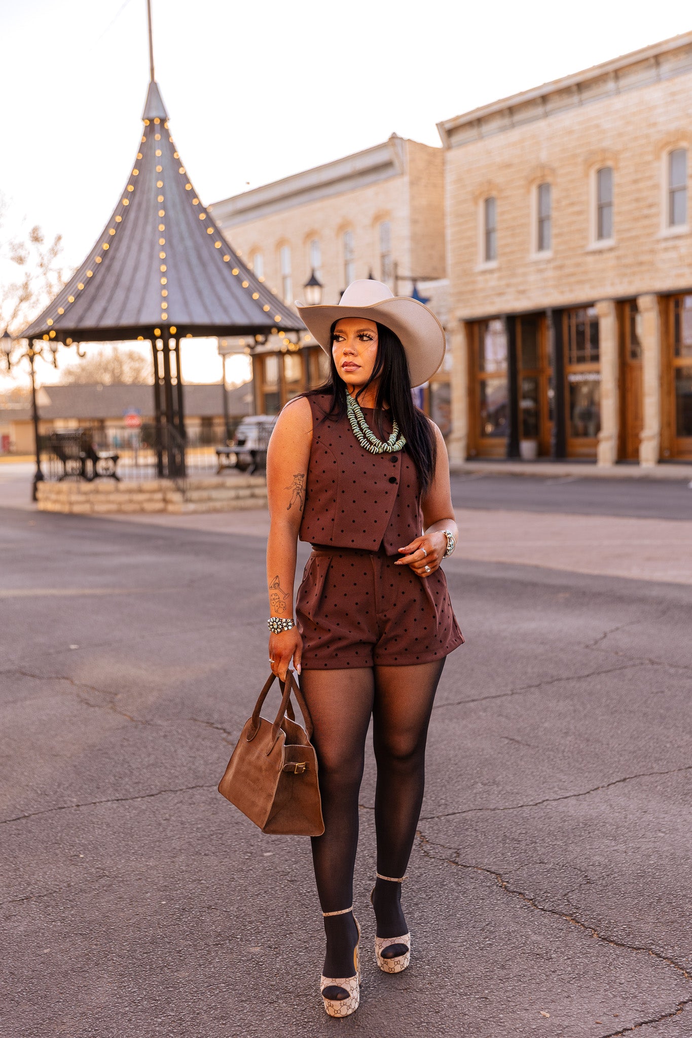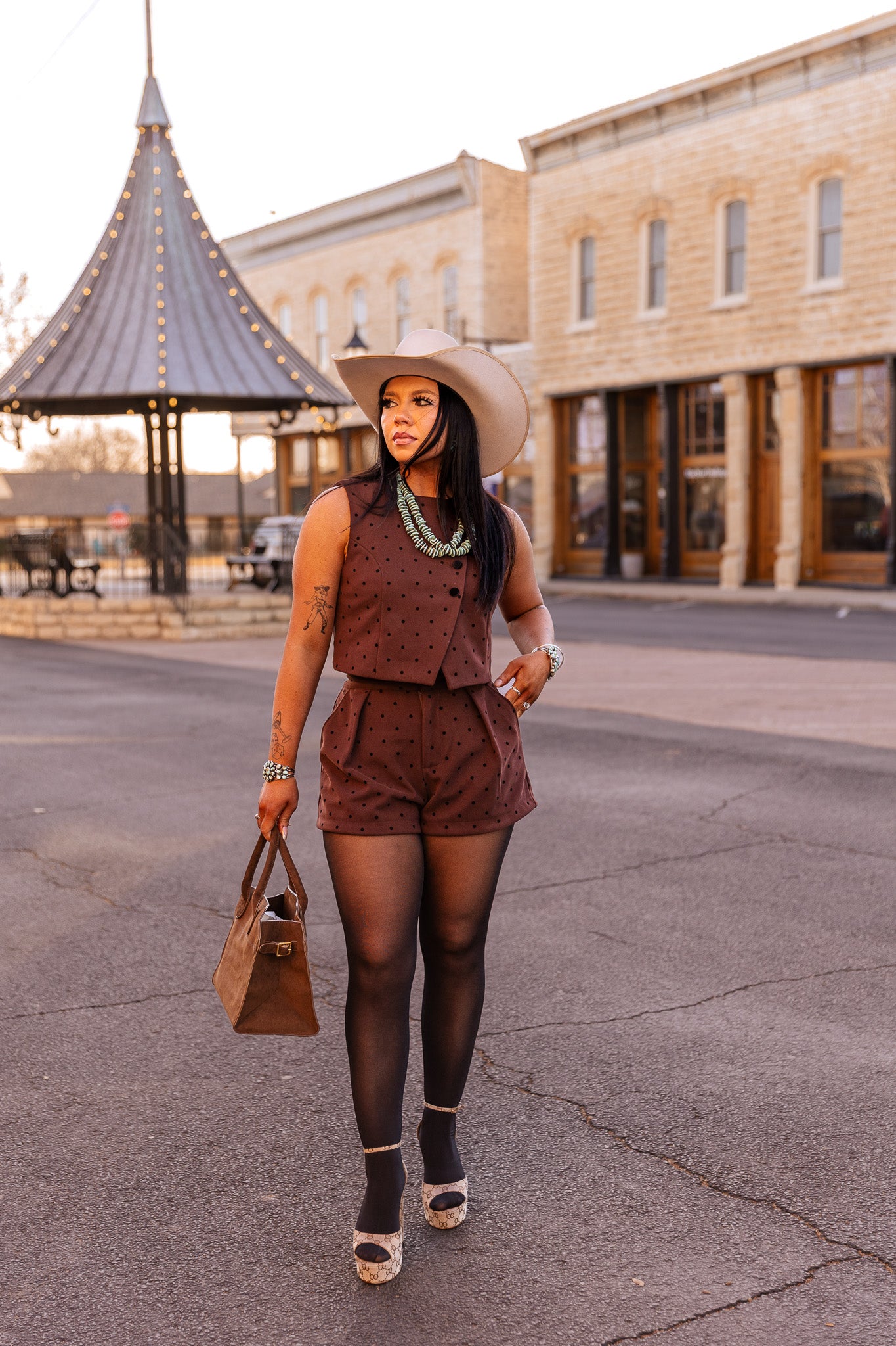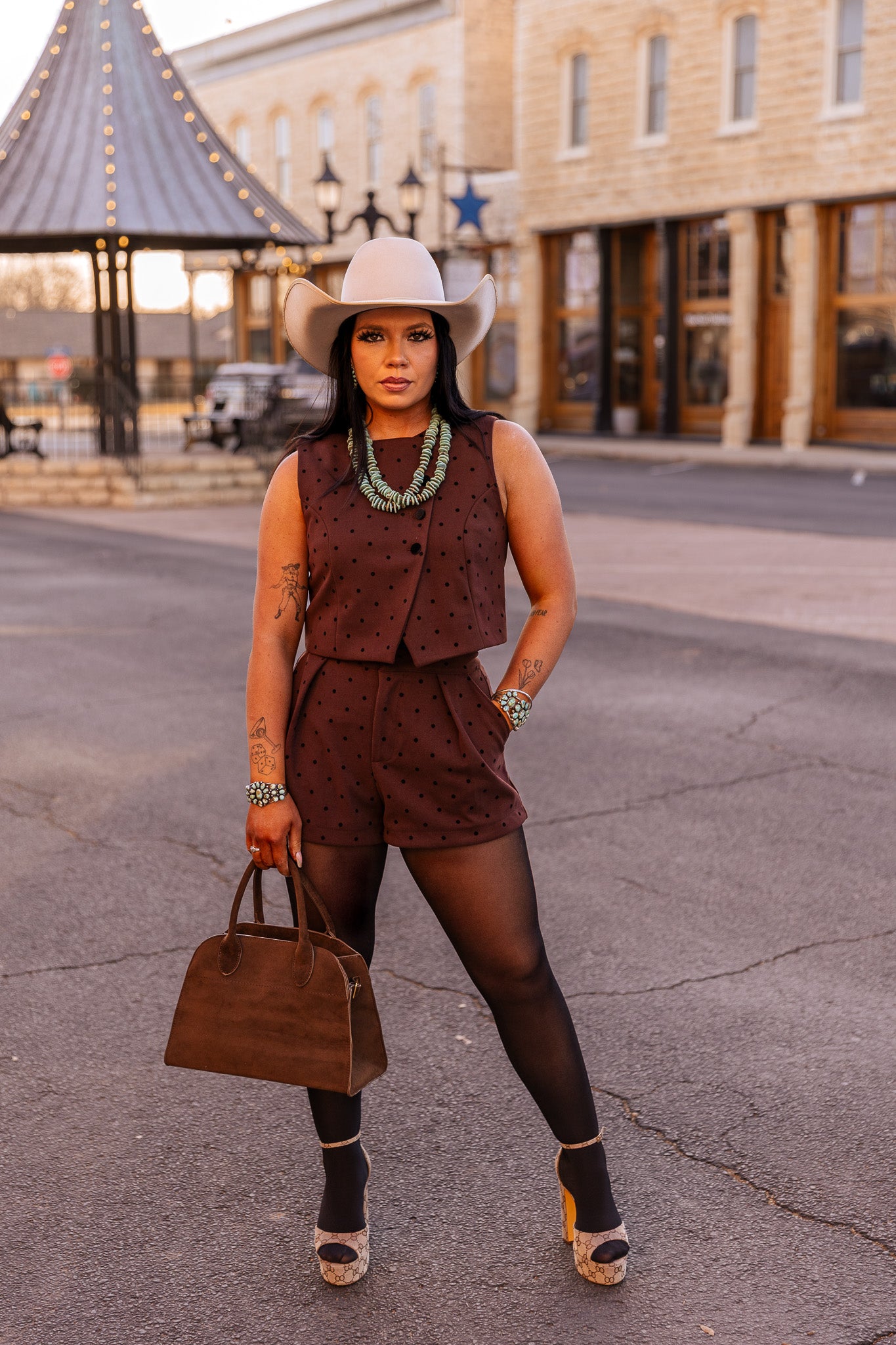 The Dotted Spur Shorts are chocolate brown adorned with polka dots, providing a cohesive and stylish ensemble. The fabric's color and pattern can enhance visual appeal, making it suitable for casual outings or relaxed settings. The shorts combine comfort with a playful design, catering to varied personal styles.