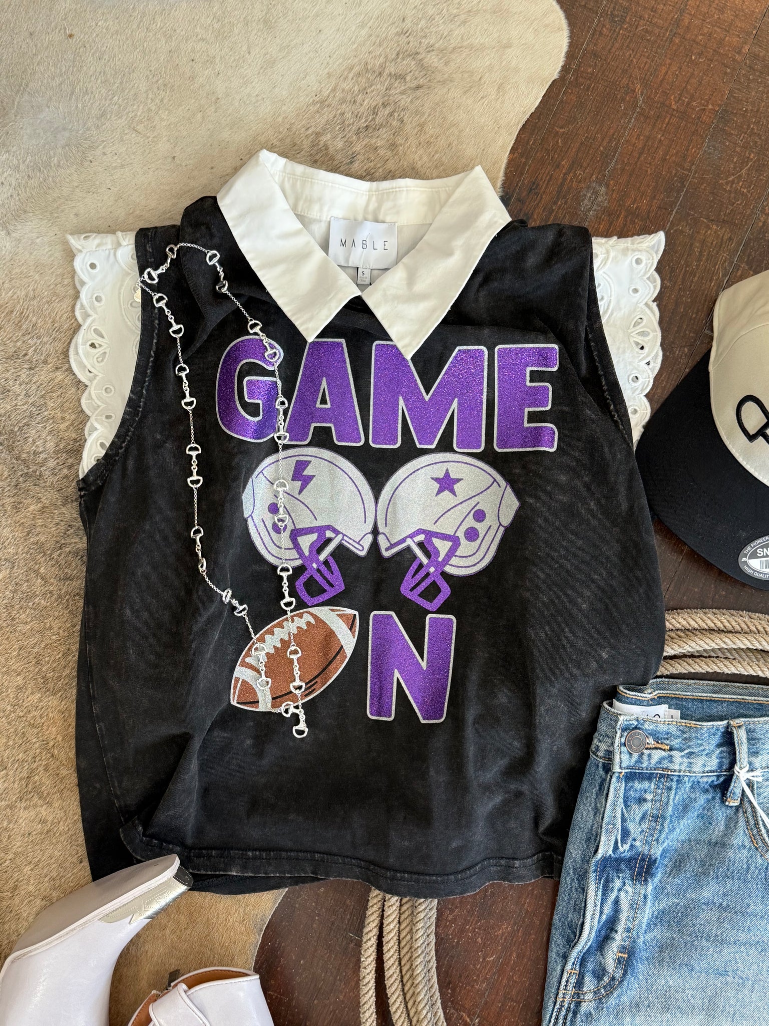 Gear up for game day with our Game On Muscle Tank! This black tank features a playful light acid wash, bold purple and white letters spelling out "game on", and football helmet details for the perfect sporty touch. Don't miss out on this quirky and fun addition to your game day outfit!