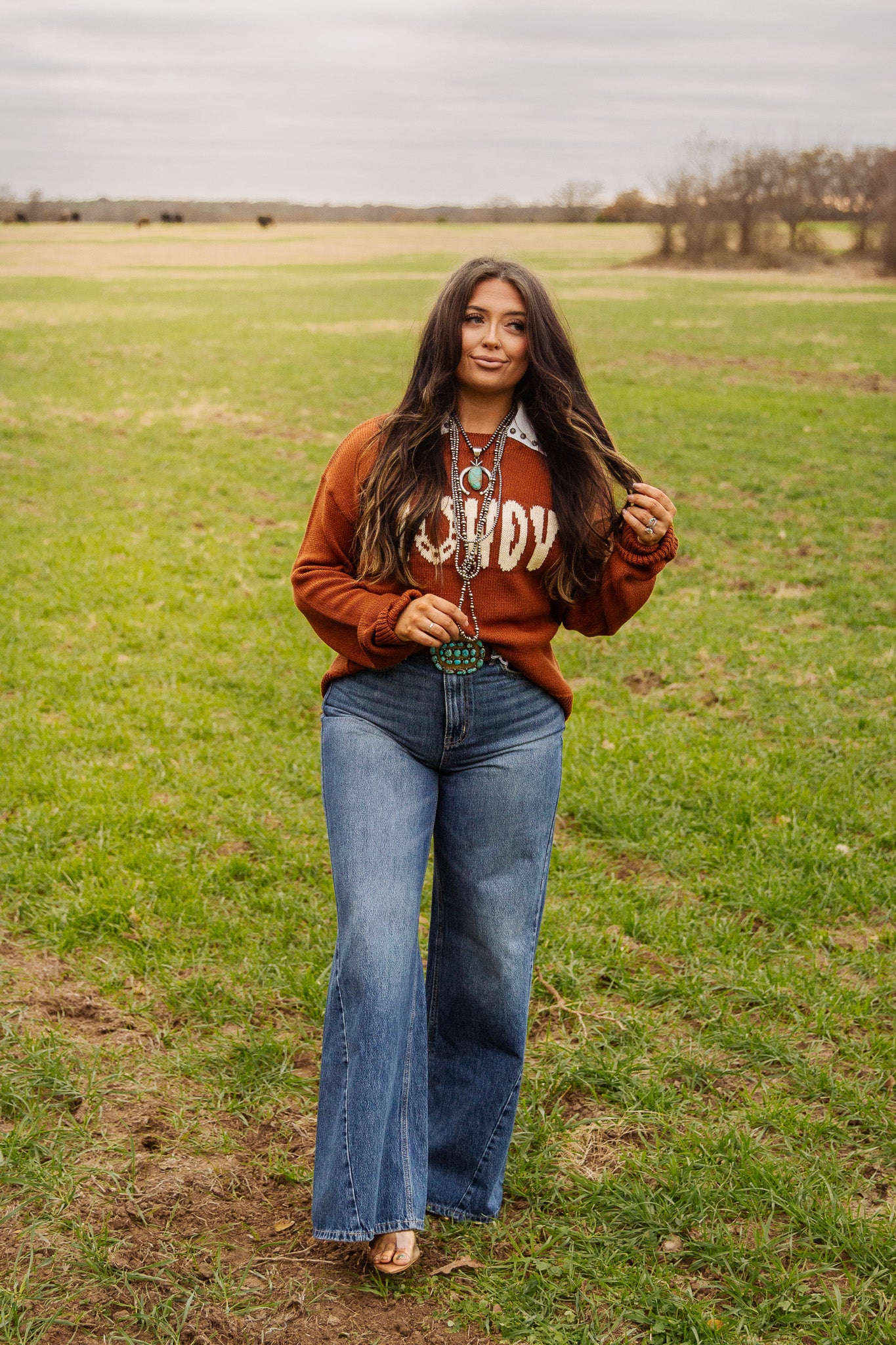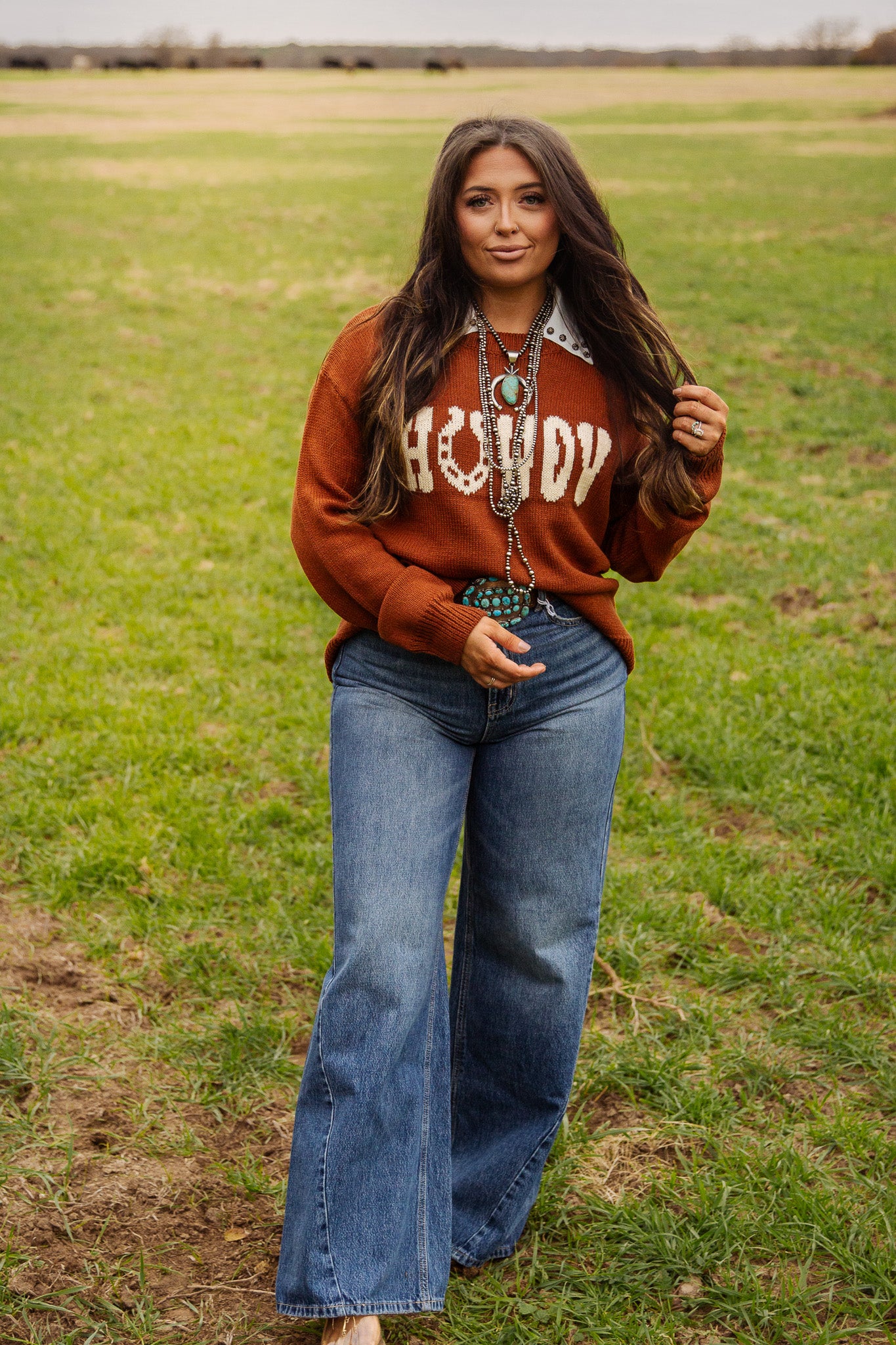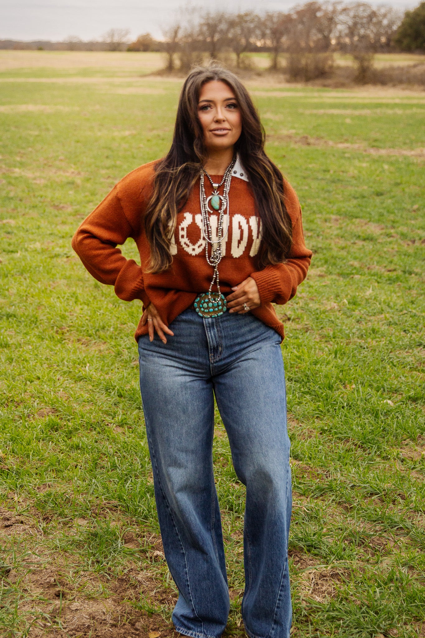 A western classic with an elevated edge. This rich saddle-brown knit features bold ivory HOWDY lettering with a horseshoe detail for a subtle nod to ranch life and good luck. Designed in a cozy, medium-weight knit with a relaxed silhouette, it’s the perfect throw-on for cool mornings, rodeo nights, and everyday wear with denim and boots. Effortlessly blends classic western charm with modern cowgirl style.