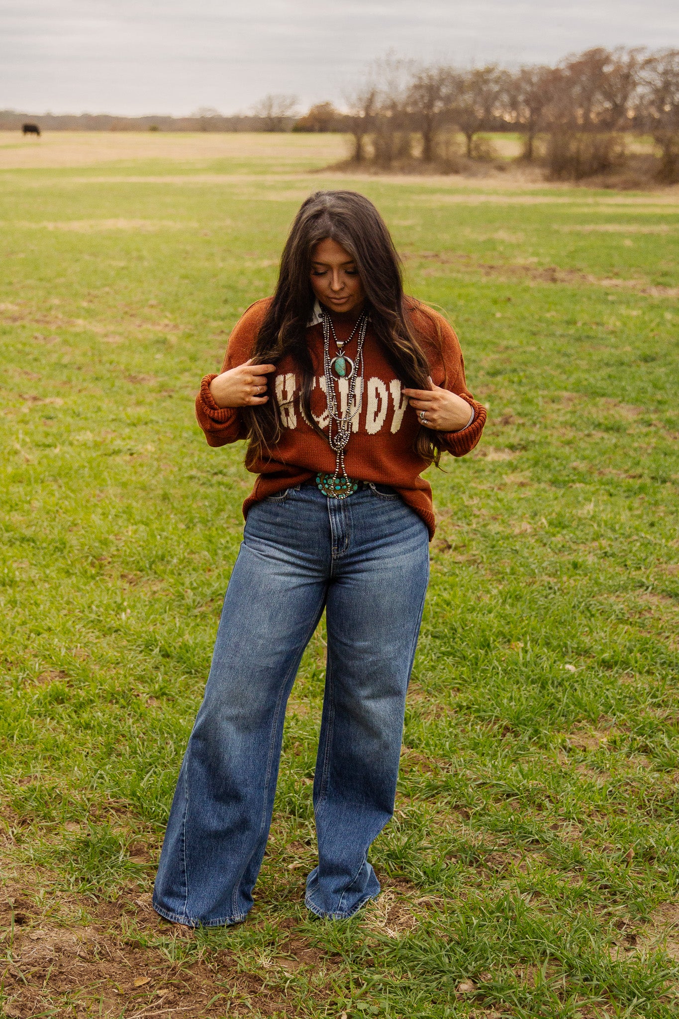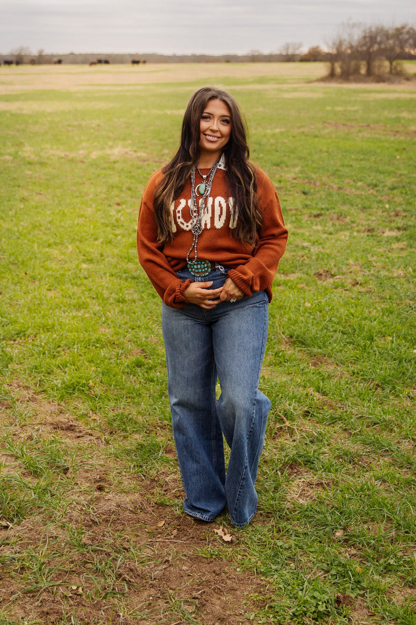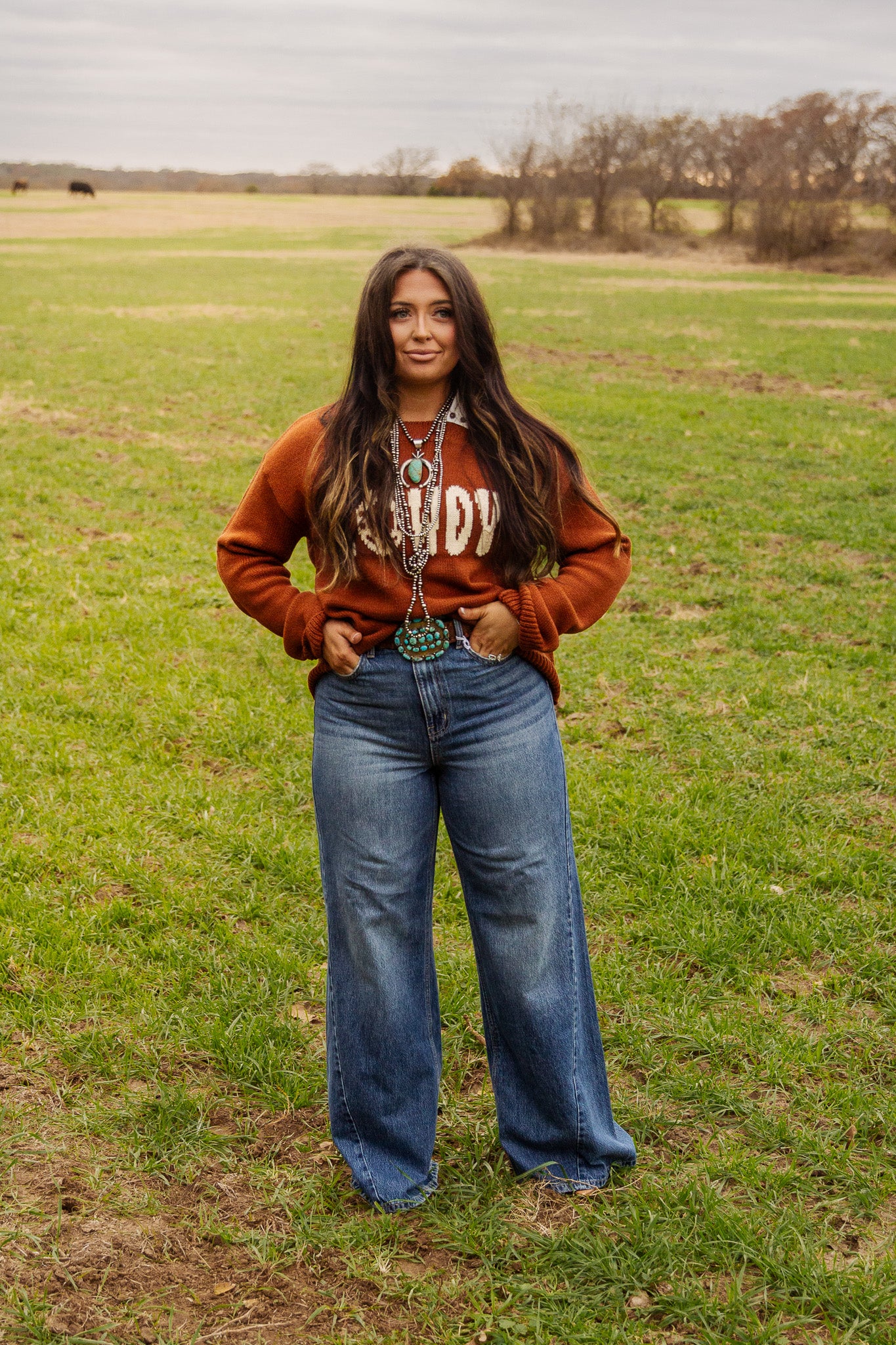 A western classic with an elevated edge. This rich saddle-brown knit features bold ivory HOWDY lettering with a horseshoe detail for a subtle nod to ranch life and good luck. Designed in a cozy, medium-weight knit with a relaxed silhouette, it’s the perfect throw-on for cool mornings, rodeo nights, and everyday wear with denim and boots. Effortlessly blends classic western charm with modern cowgirl style.