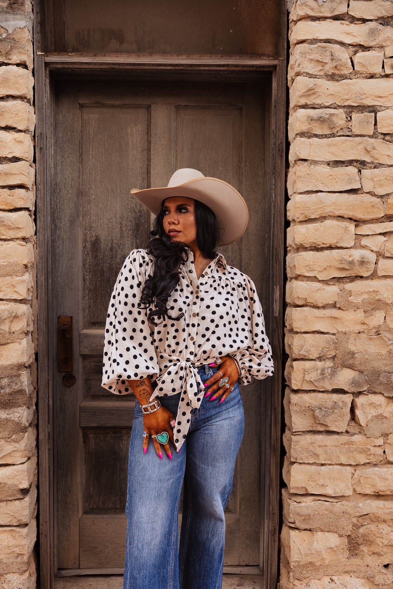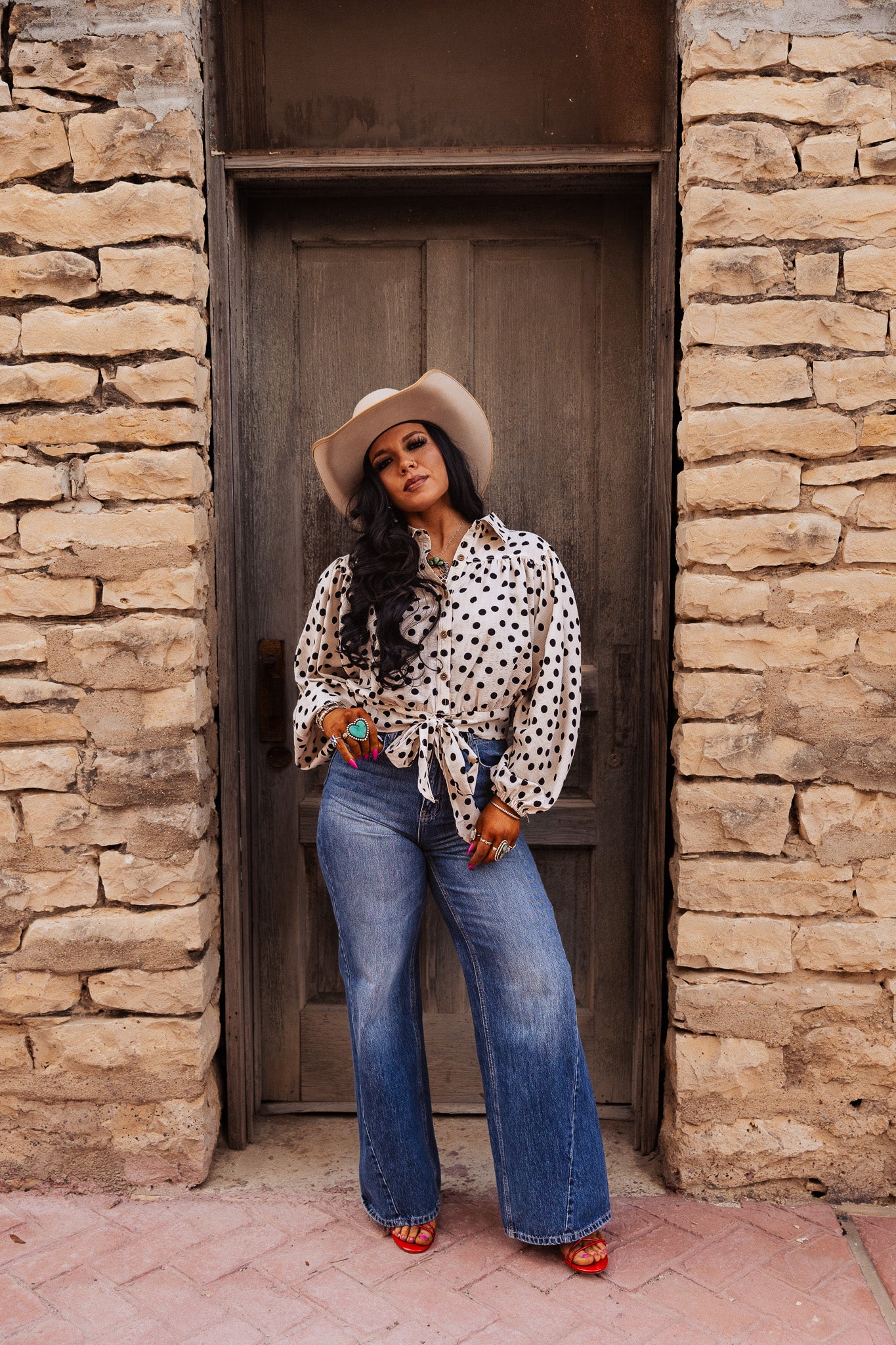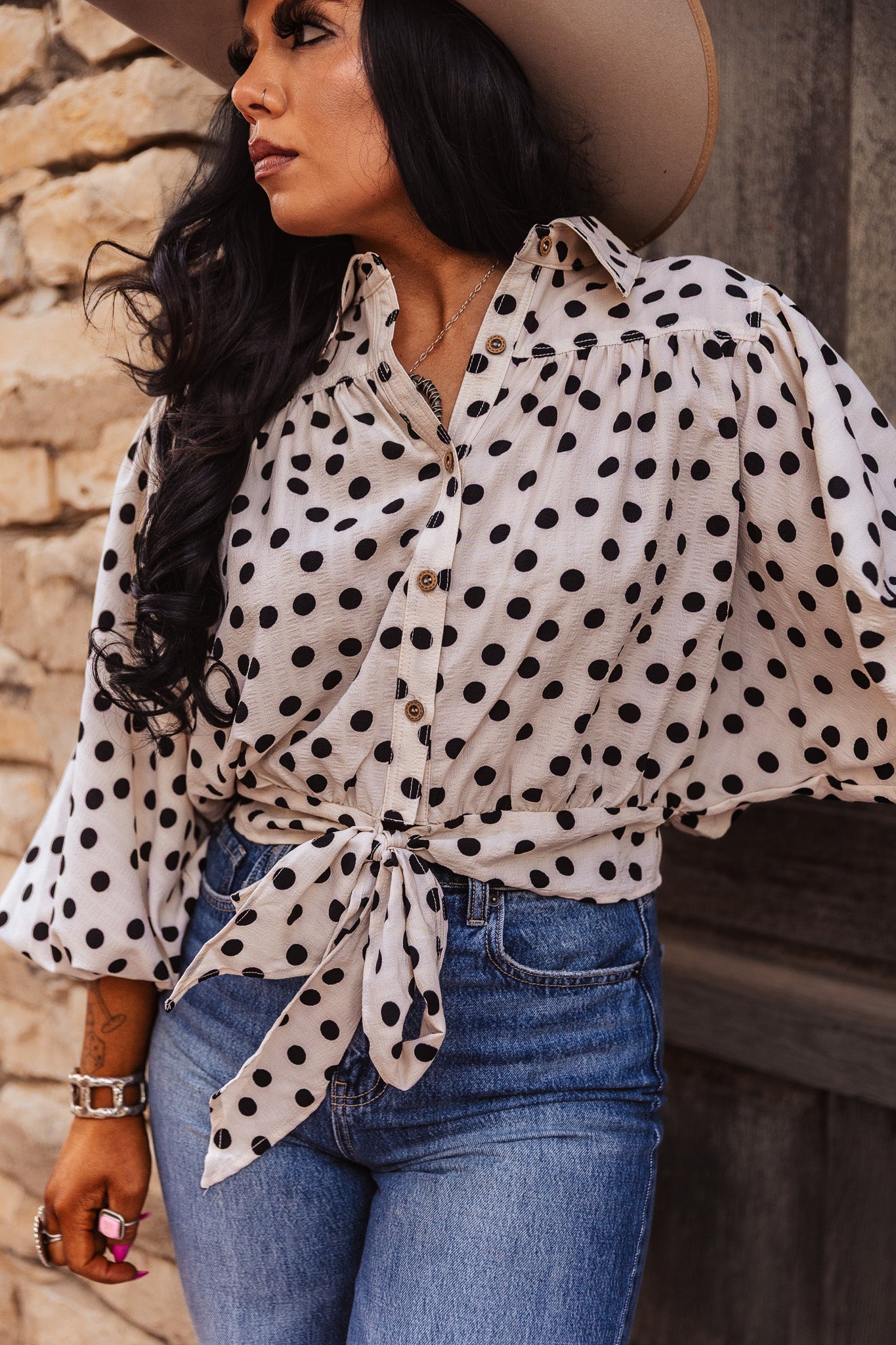 The Darcy Dot Top is a cropped blouse featuring a polka dot print and a tie hem detail. This design enhances breathability and comfort, making it suitable for various occasions. The cropped cut adds a modern touch while allowing for easy layering, providing both style and functionality.