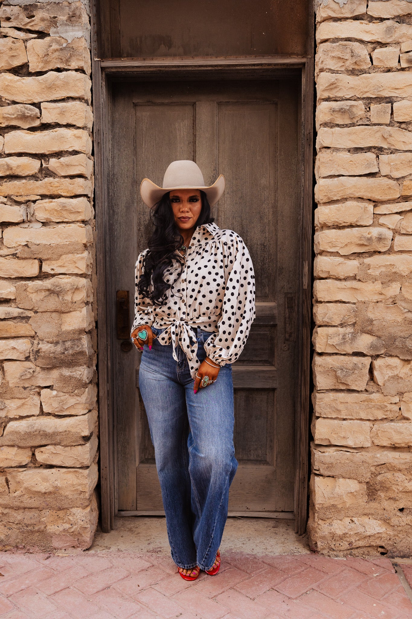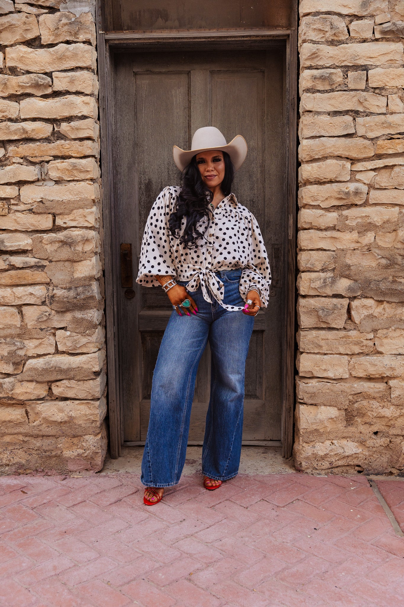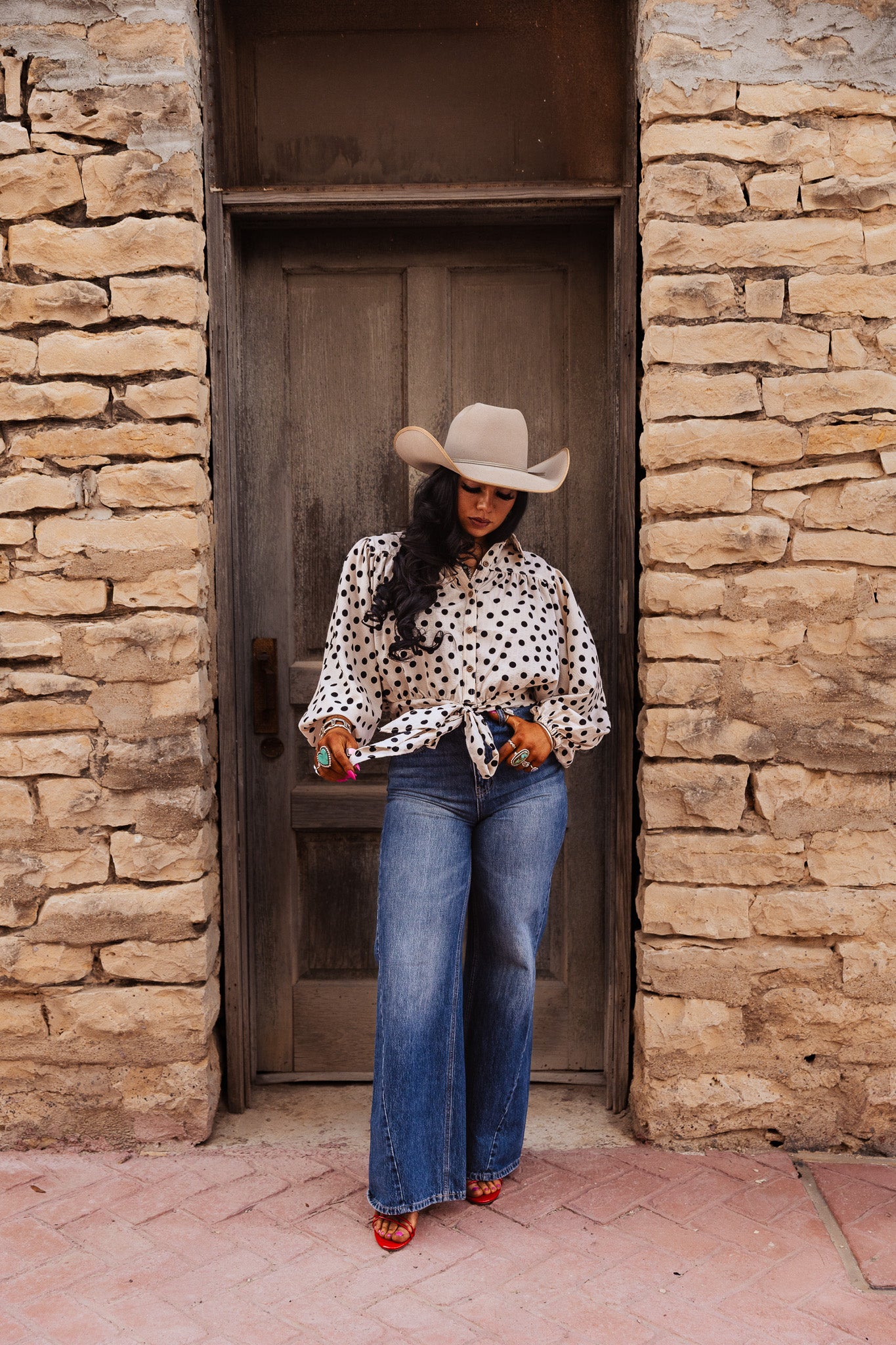 The Darcy Dot Top is a cropped blouse featuring a polka dot print and a tie hem detail. This design enhances breathability and comfort, making it suitable for various occasions. The cropped cut adds a modern touch while allowing for easy layering, providing both style and functionality.