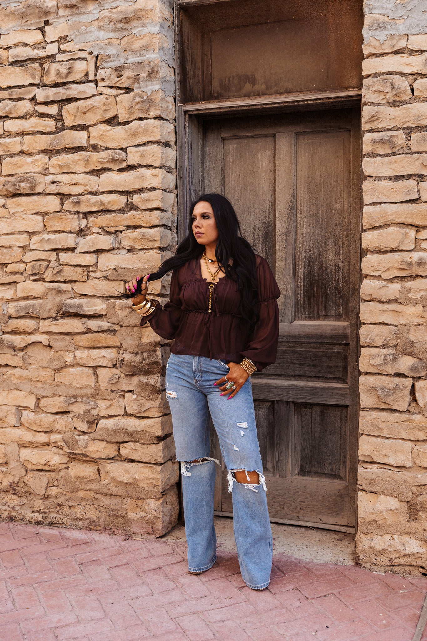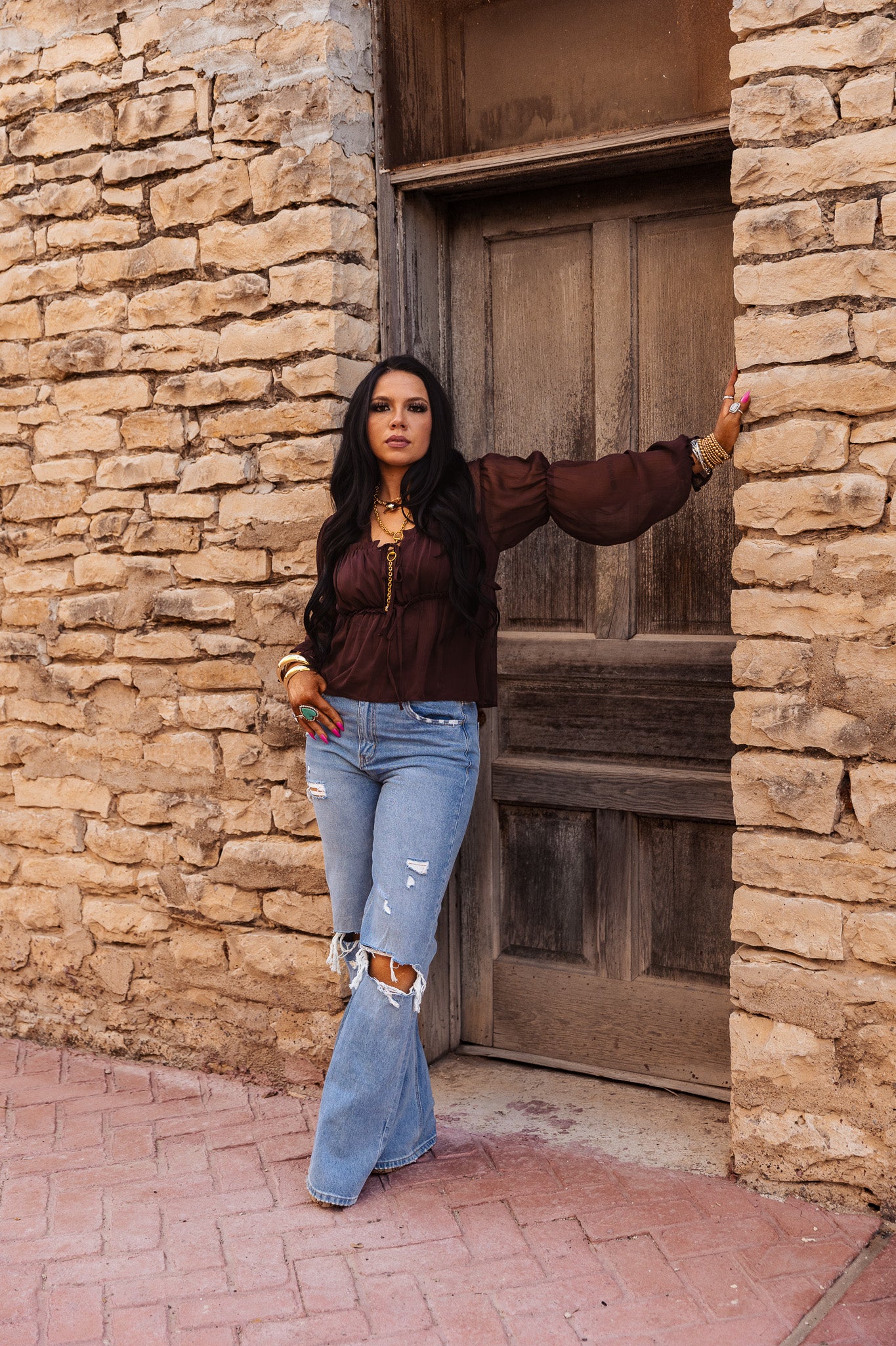 The Dusty Rose Top features a V-neck design, long sleeves, and a front tie, crafted from sheer fabric. This blouse allows for breathability and versatility, making it suitable for various occasions. Its elegant color and style can enhance professional or casual outfits, providing a polished appearance.