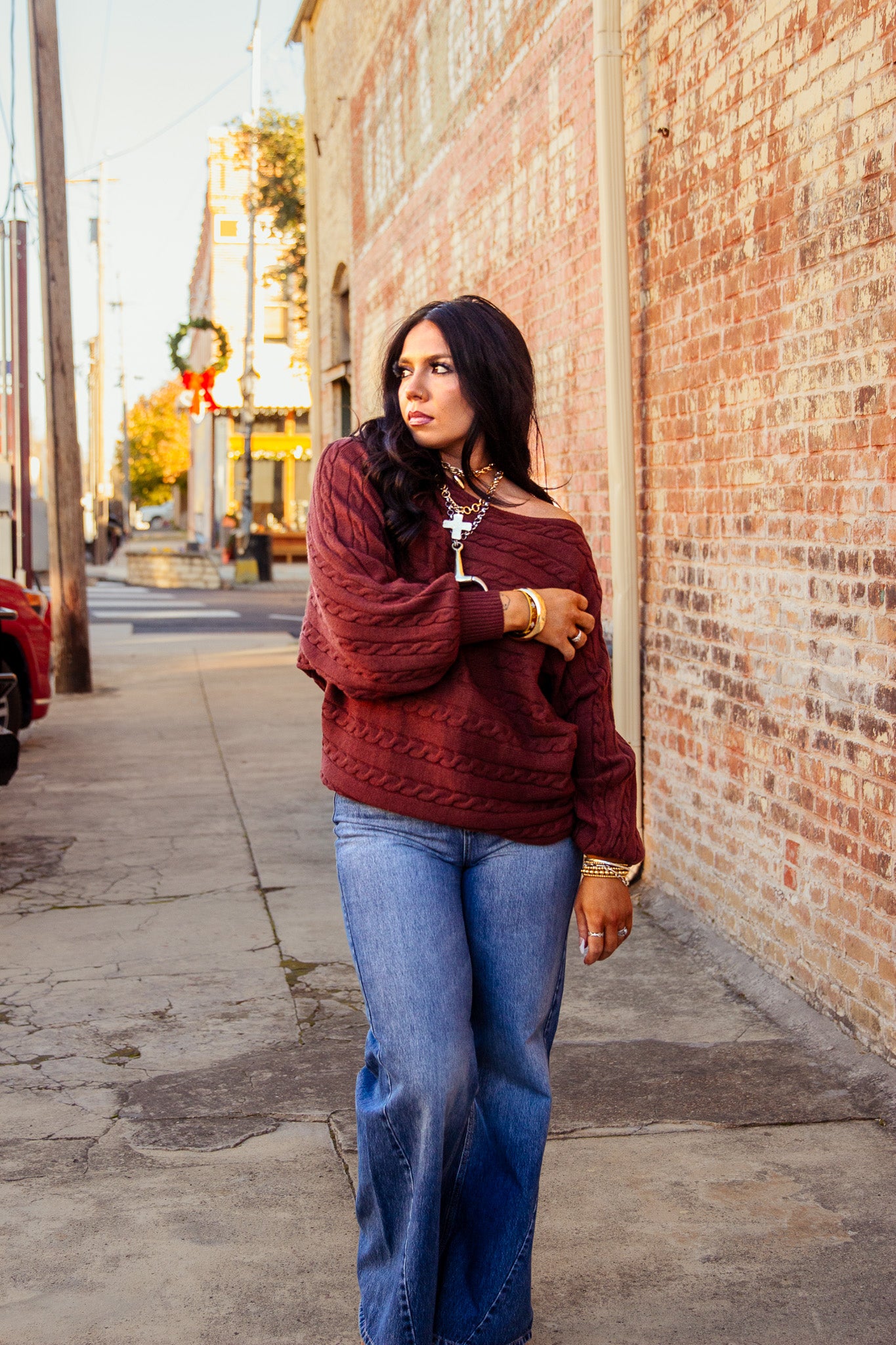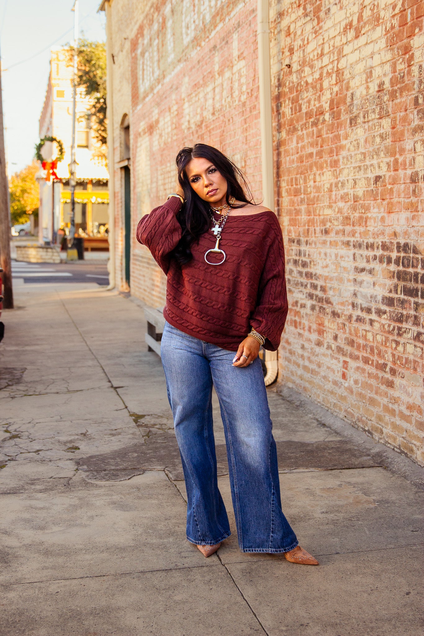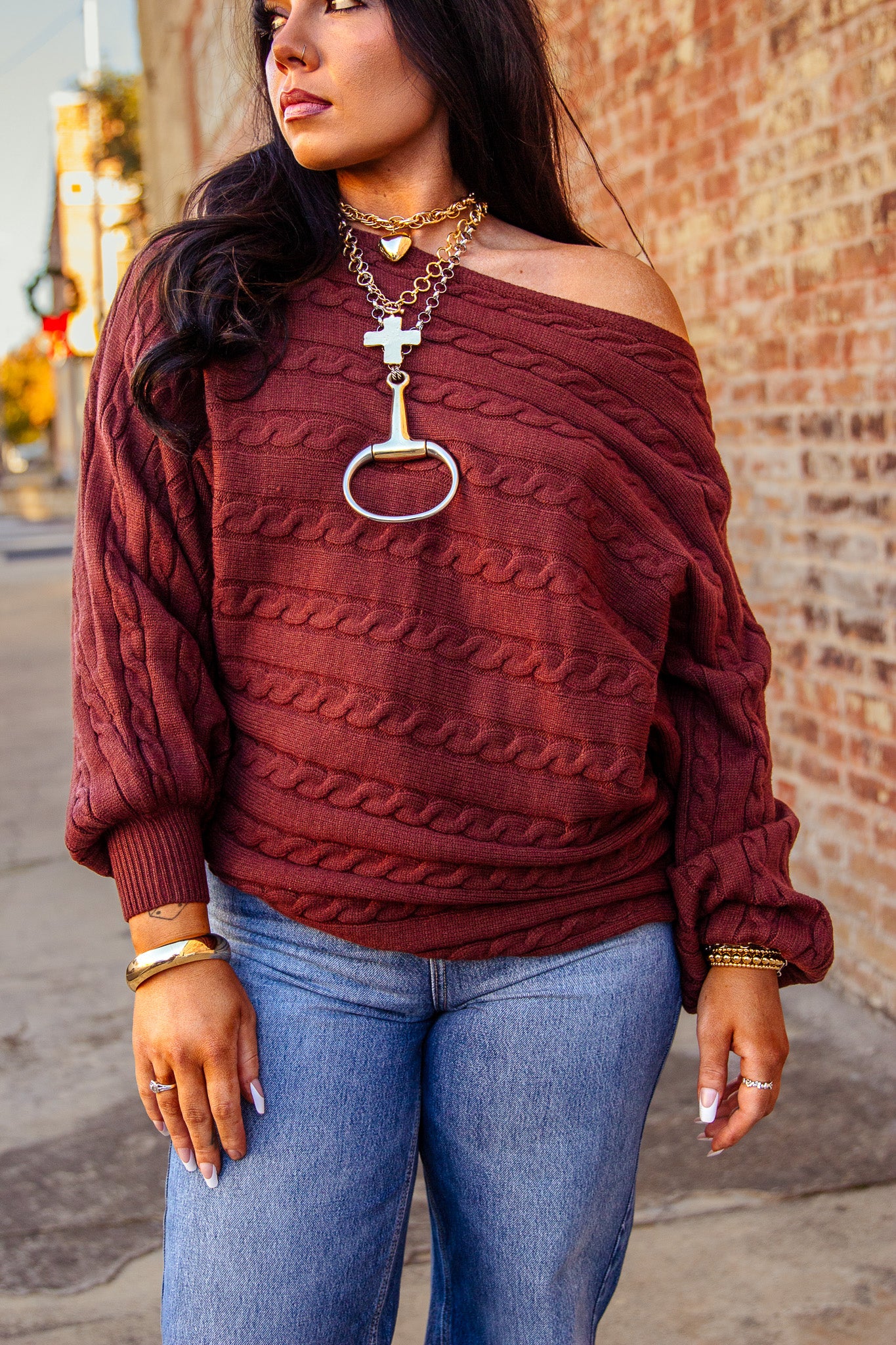 Stay cozy and stylish with The Maxwell Sweater Top. Featuring a brown color and a boat neck, dolman sleeves, and cable knit design, this sweater is perfect for any occasion. Whether you want to dress it up or go for a more casual look, this top has got you covered. Never sacrifice comfort for fashion again!