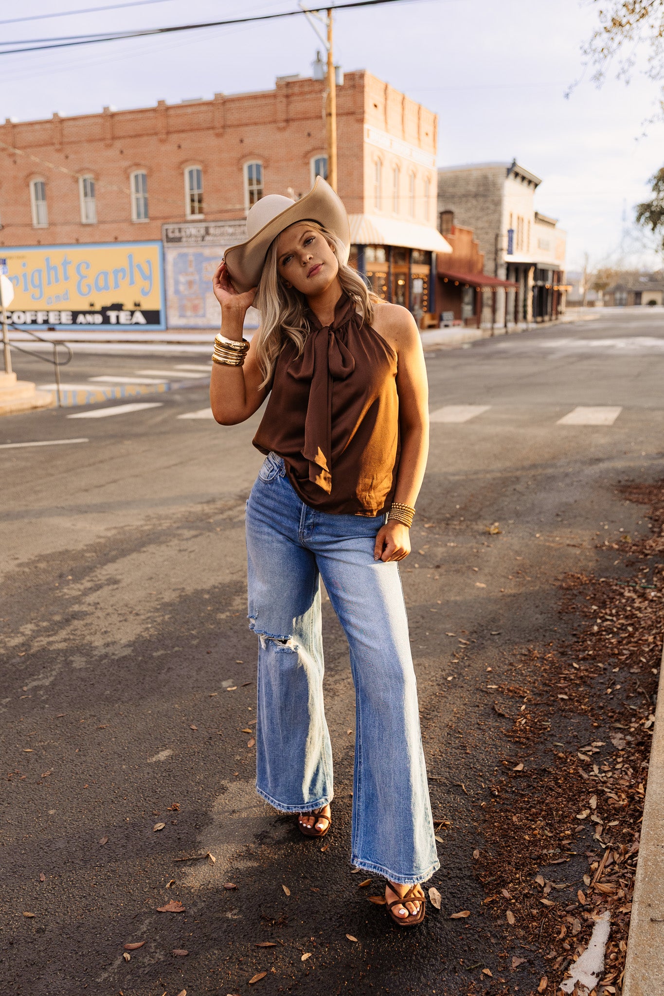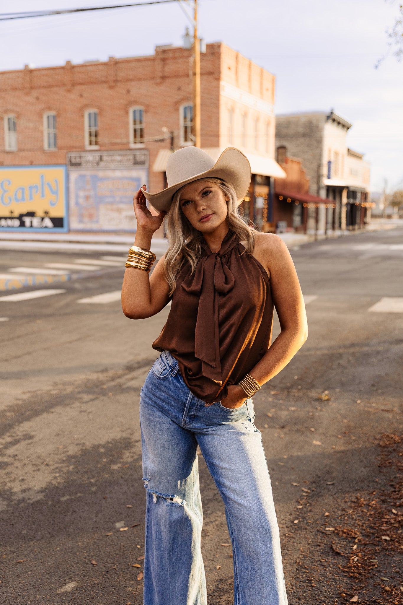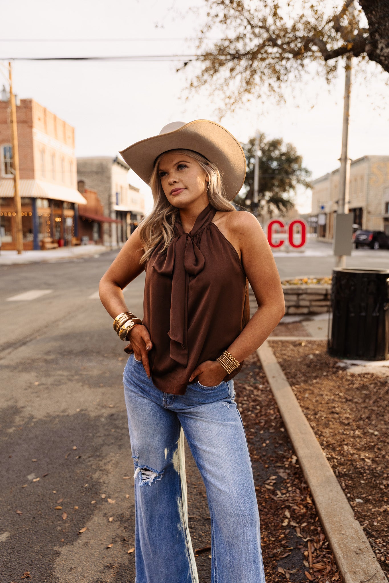 The Saddle Tie Top is a chocolate brown tank top featuring a neck tie design. This style element allows for adjustable fit and versatility, catering to both casual and semi-formal occasions. The fabric composition provides breathability, enhancing comfort during wear.