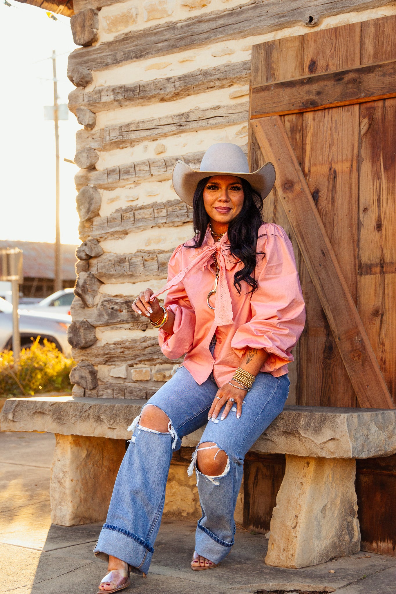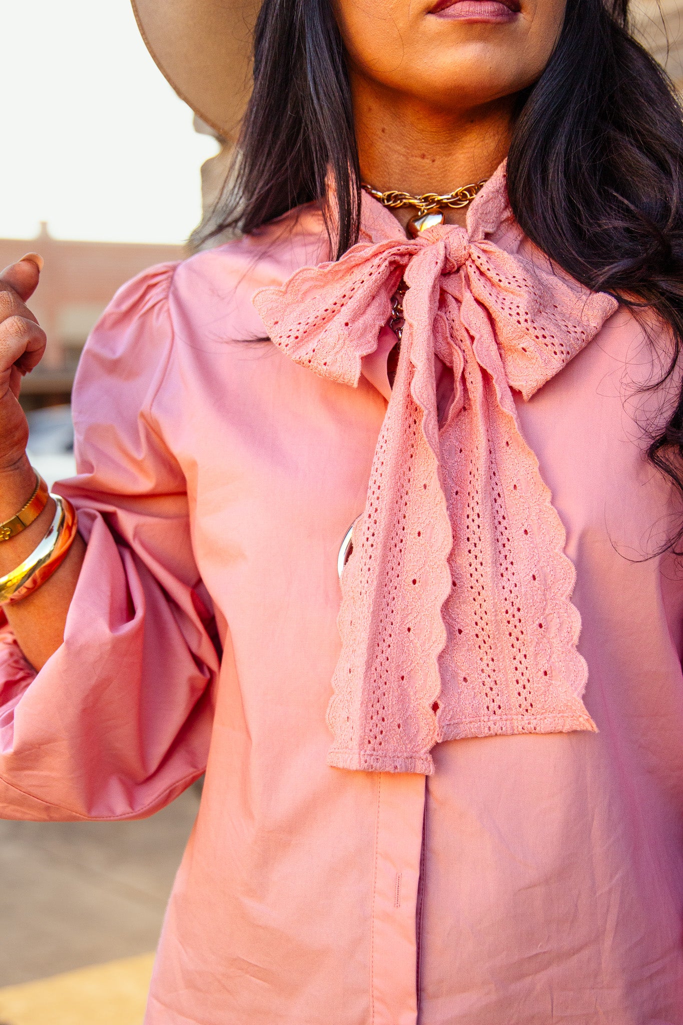 Unleash your wild side with The Supai Top! This light pink button-up top features a unique crochet lace neck tie and elastic cuffs for a flirtatious touch.