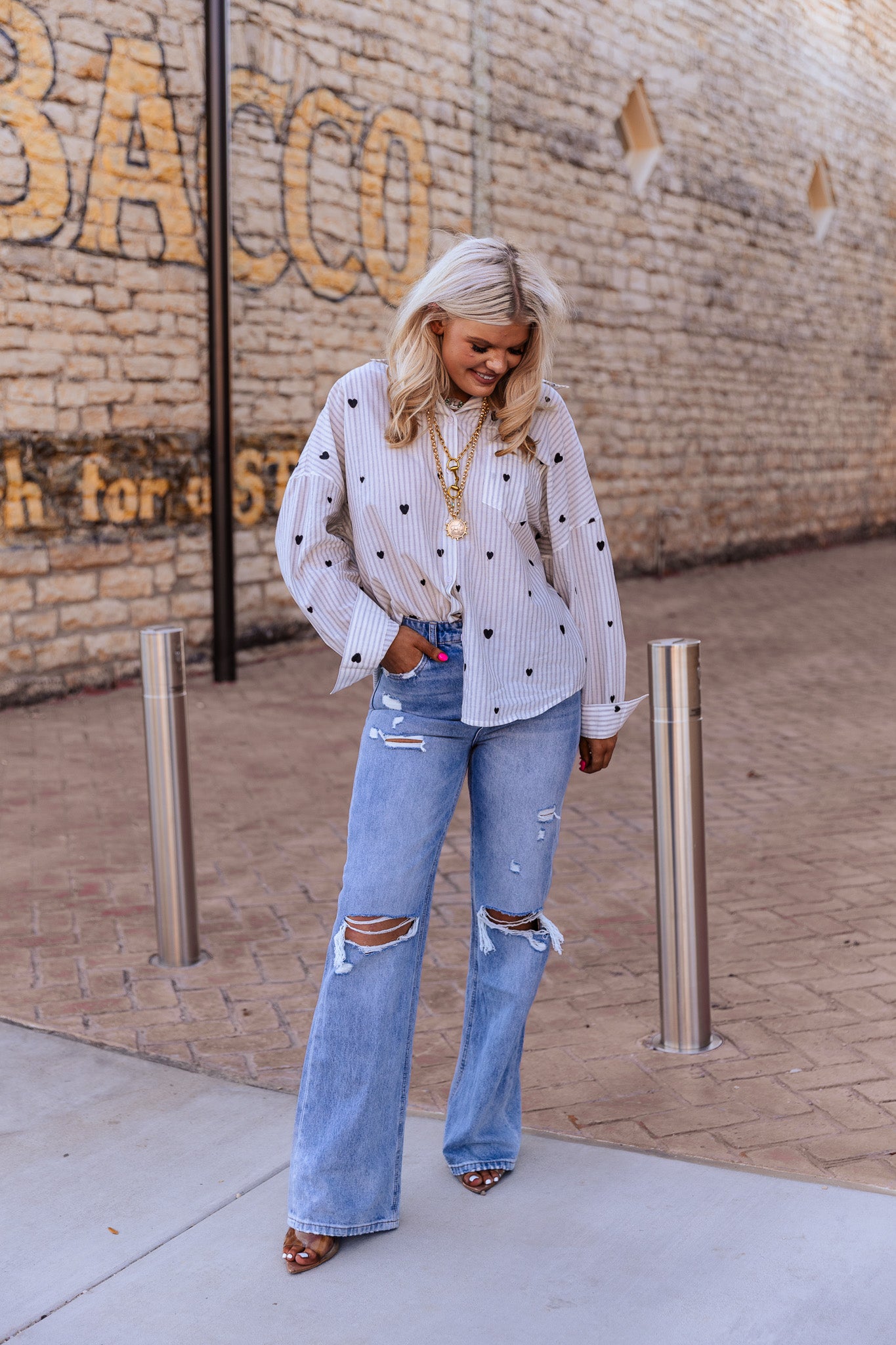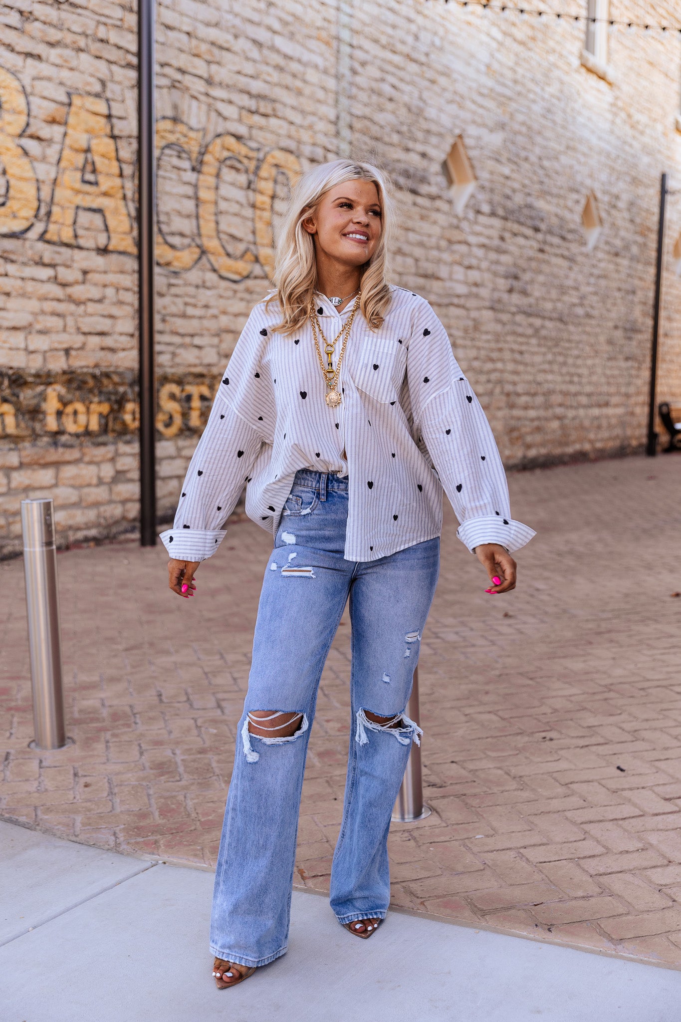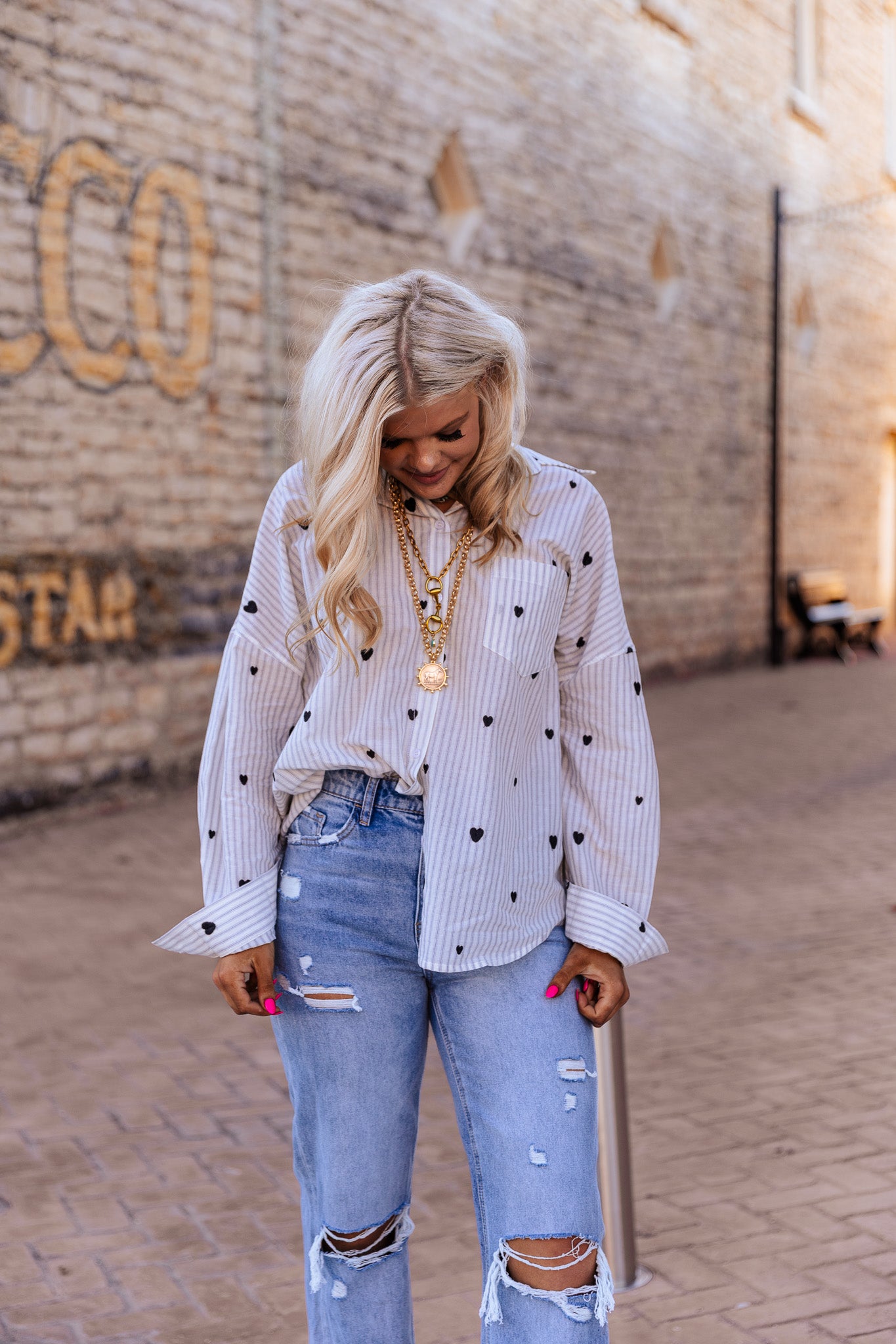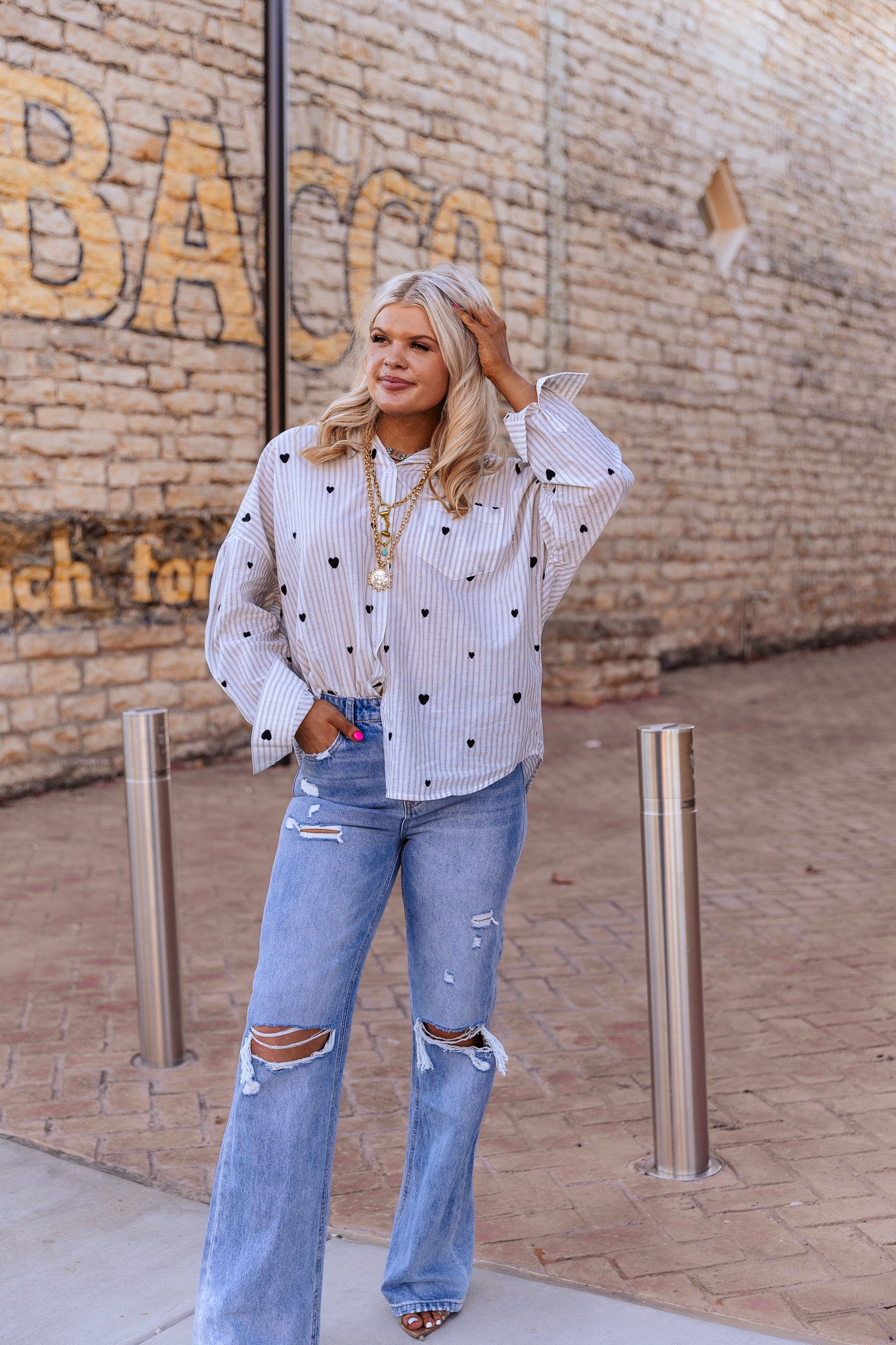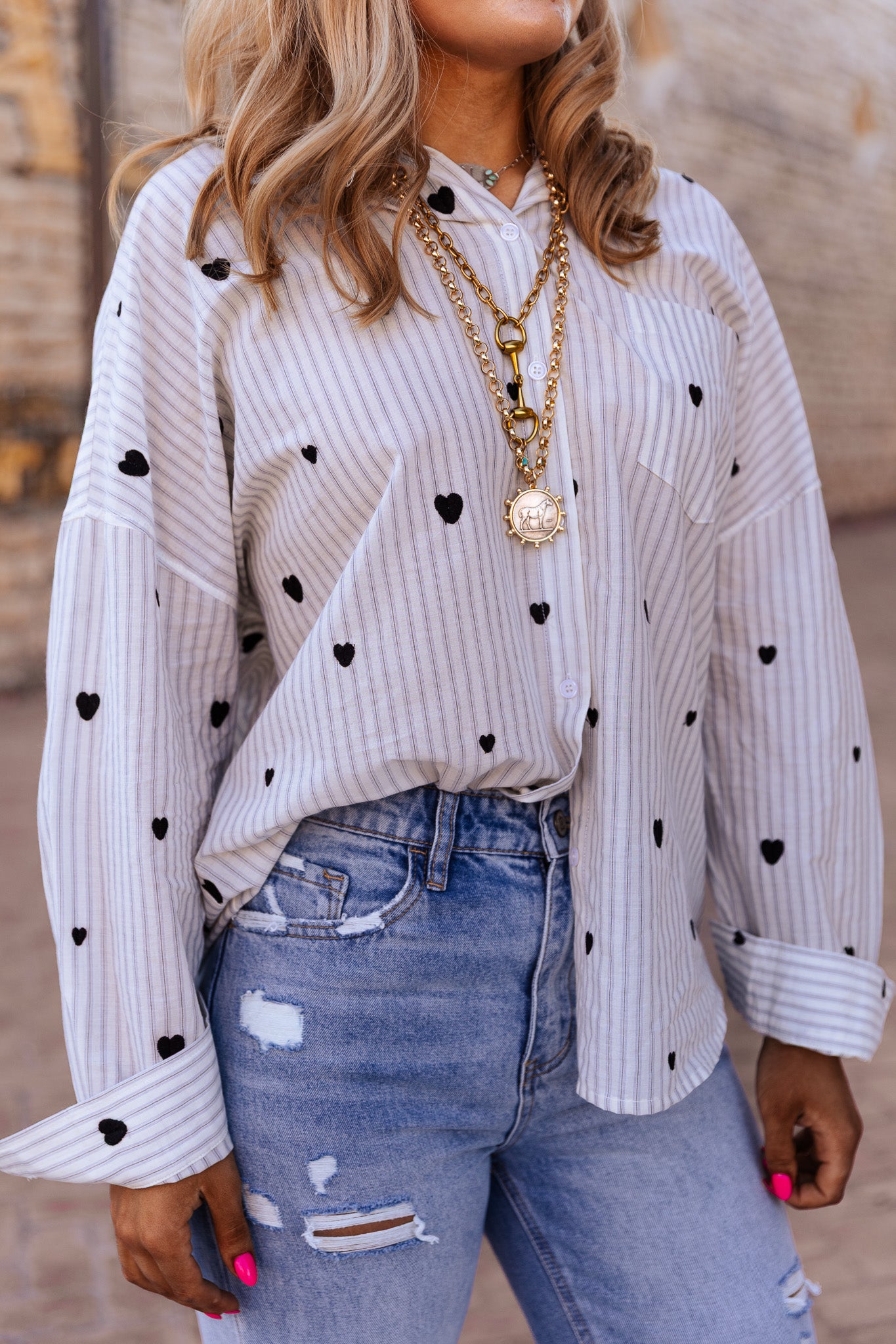 The Sweet On You Top features intricate heart embroidery and an oversized design, providing both a stylish aesthetic and comfortable fit. The embroidery adds a personal touch, while the oversized style facilitates ease of movement, making it suitable for casual wear and layering in various outfits.