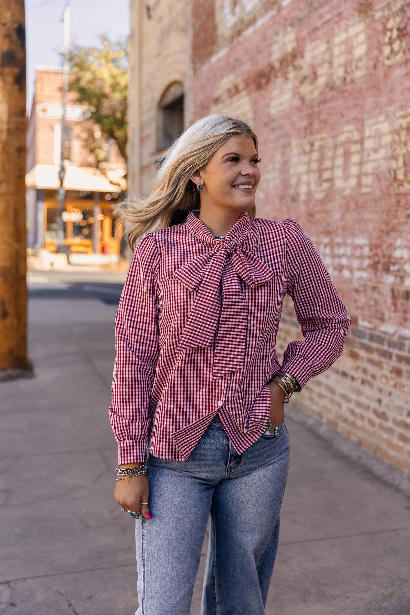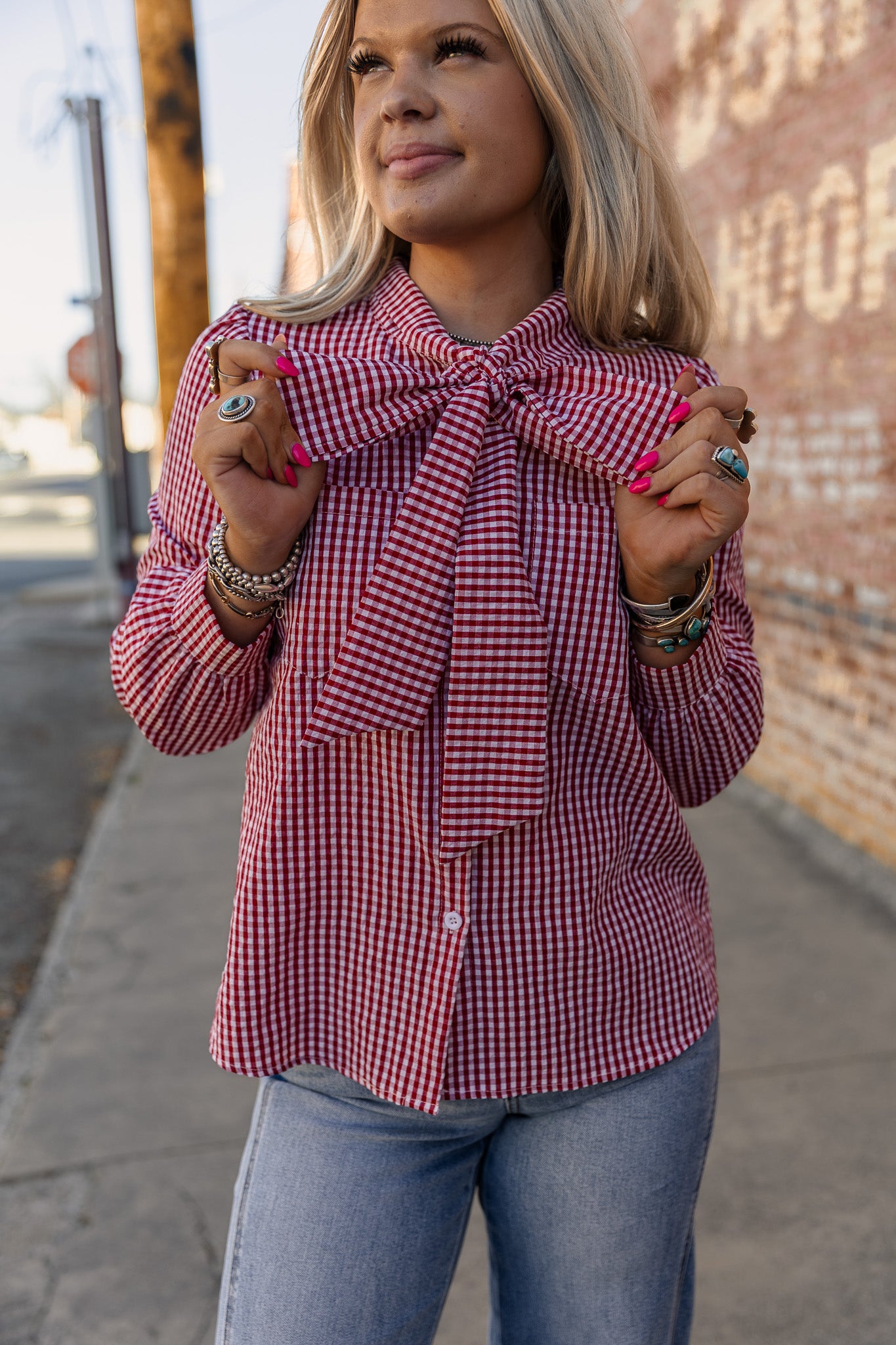 Elevate your wardrobe with The Vichy Top, showcasing a charming red and white gingham pattern. The elegant bow tie neck adds a touch of sophistication, while buttoned wrists and a classic button-up design ensure a polished silhouette. Perfect for both casual outings and refined gatherings.