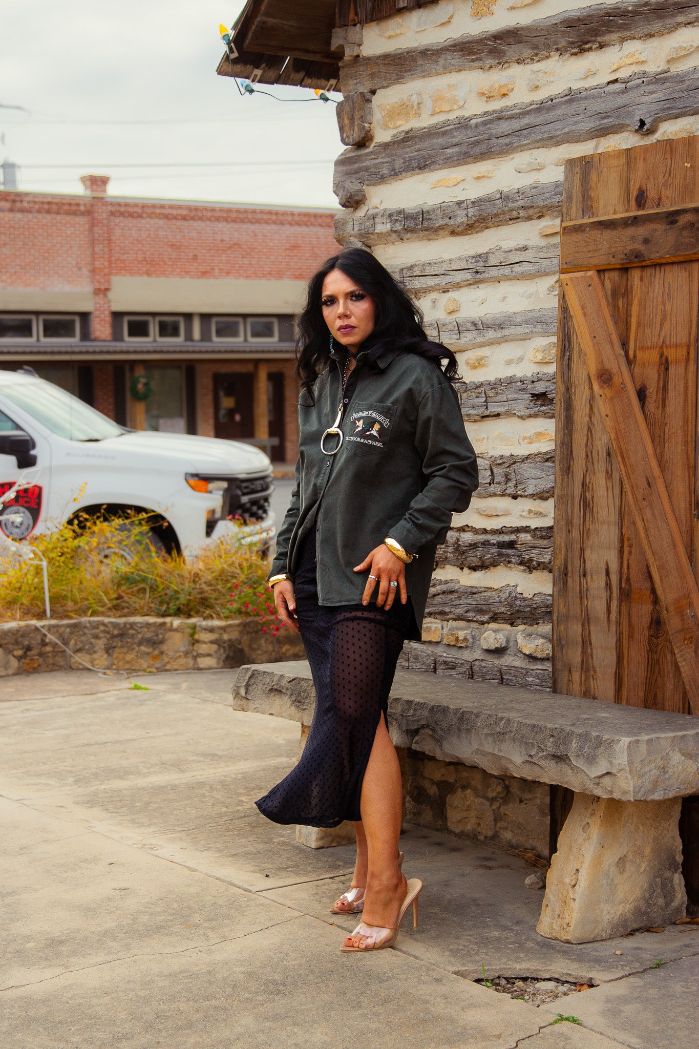 The Wild Range Top is an olive green button up utility shirt that features unique embroidery of ducks on the chest pocket. With the playful addition of the phrase "supplier of quality outdoor apparel," this top is perfect for those who don't take themselves too seriously and want to stand out in their outdoor attire.