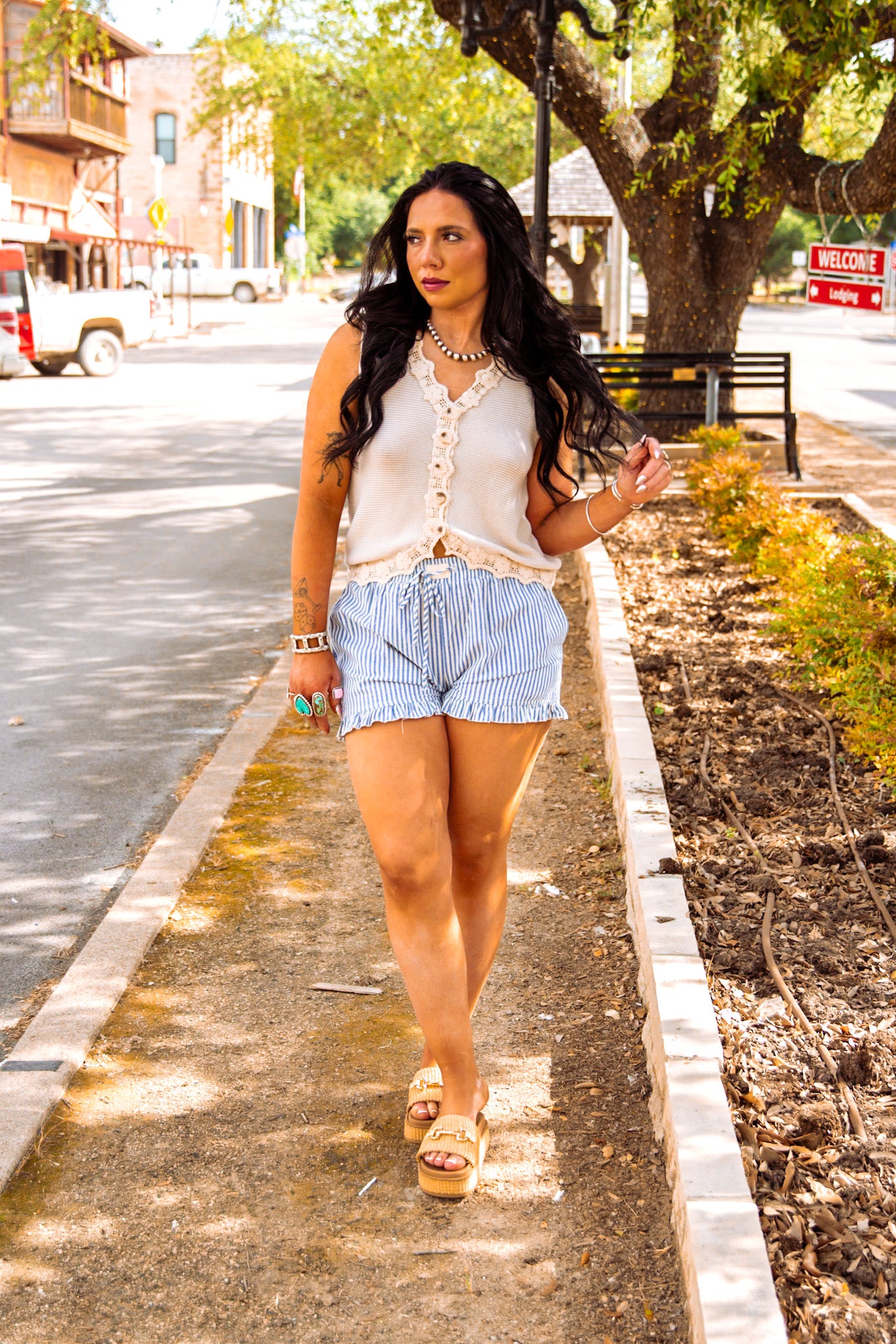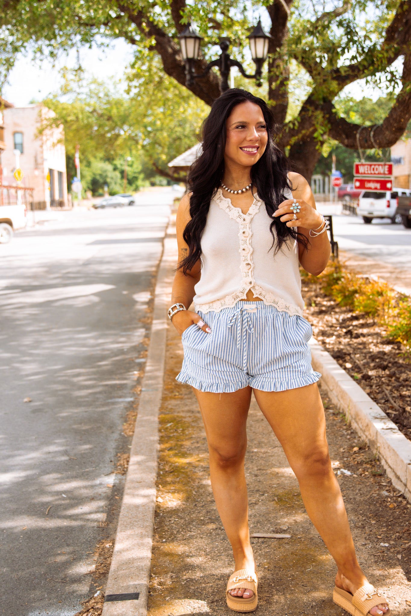 Elevate your style with The Ringo Sweater Vest. This sleeveless knit vest features a classic V neckline and a front button closure for a timeless look. The crotchet scalloped trim on the neckline adds a touch of elegance. Made in a warm tan color, this vest is perfect for layering and adding a cozy touch to any outfit.