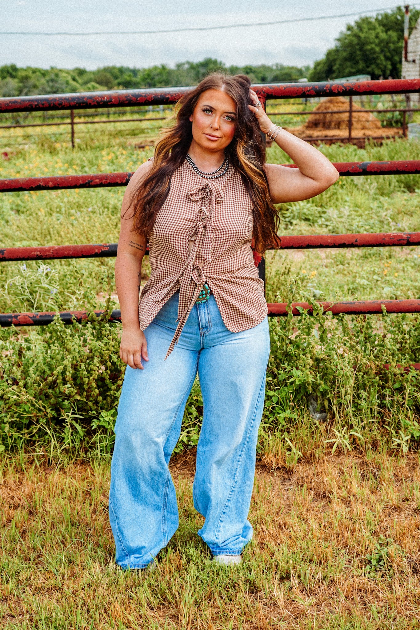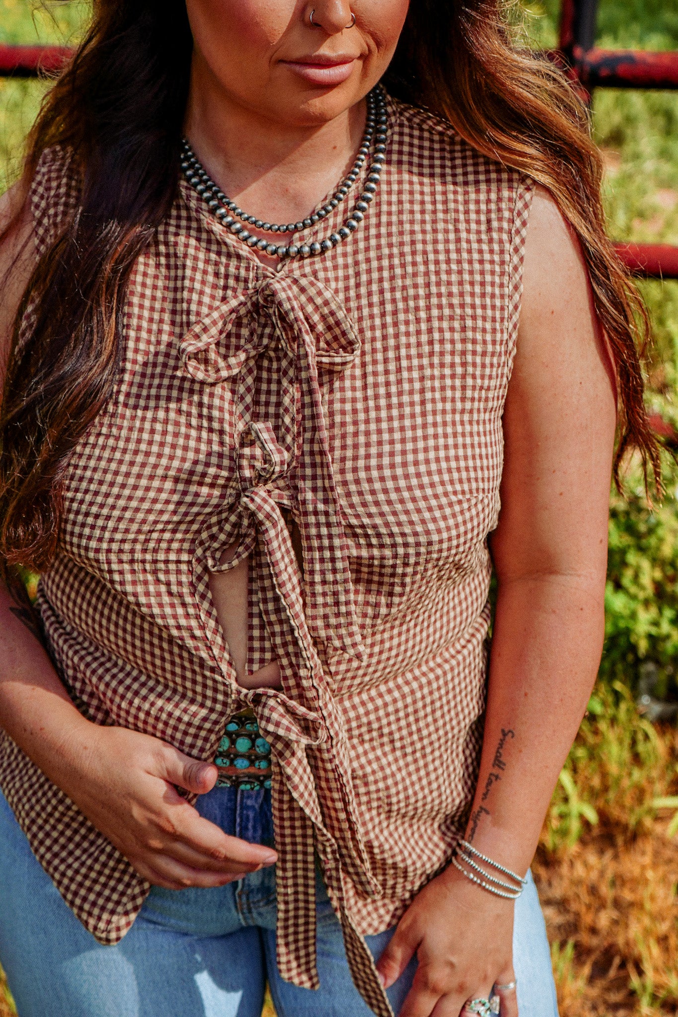 The Wrentham Top brings countryside charm to your wardrobe with its delightful brown gingham pattern. This playful peplum vest cinches at the waist before flaring out for a figure-flattering silhouette. Perfect for layering over blouses or wearing solo, this tie vest adds a touch of rustic whimsy to any outfit. Mix with denim or prairie skirts for that perfect ranch-ready look!