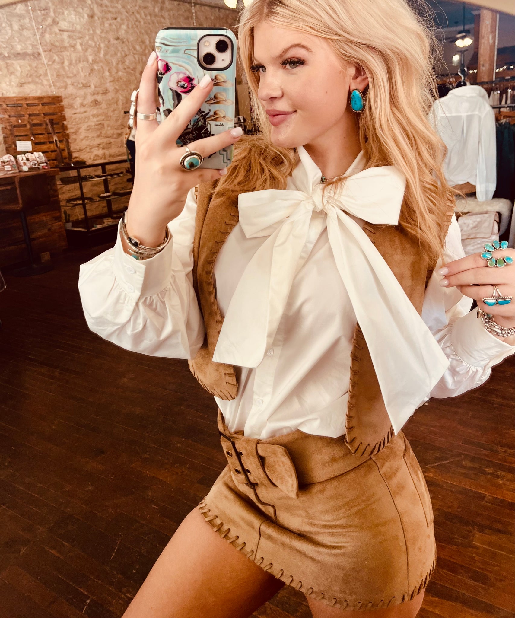 Introducing The Cowgirl Knot Top. Made with a crisp white fabric, this top features a charming bow that adds a touch of femininity. Perfect for any occasion, this versatile piece will complete any outfit with its classic and timeless design.